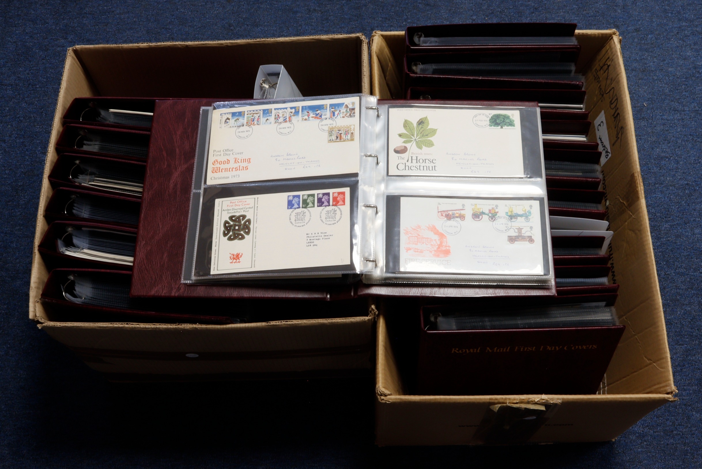 Large modern GB FDC colln in 18x Royal Mail Albums, with issues from 1936 to 2023, includes some Numismatic types (2 large boxes)