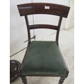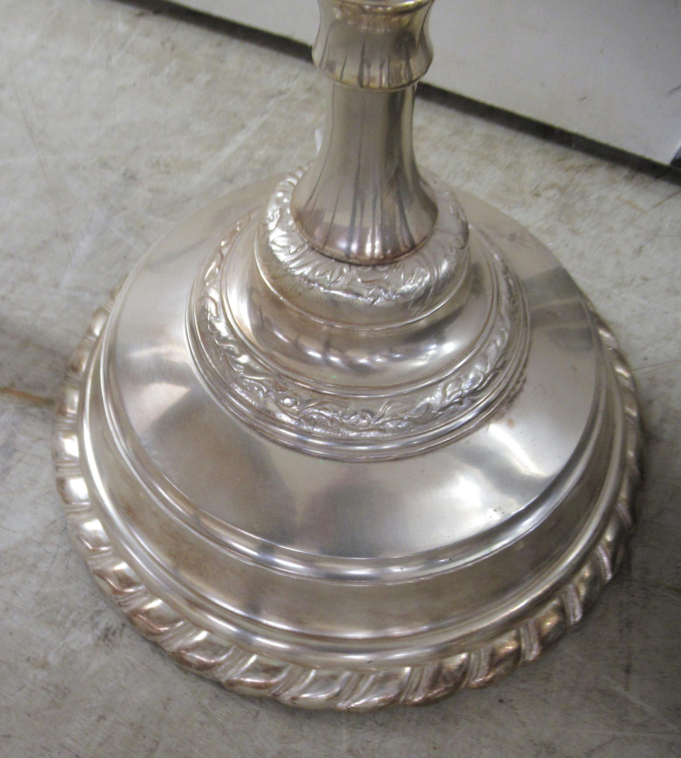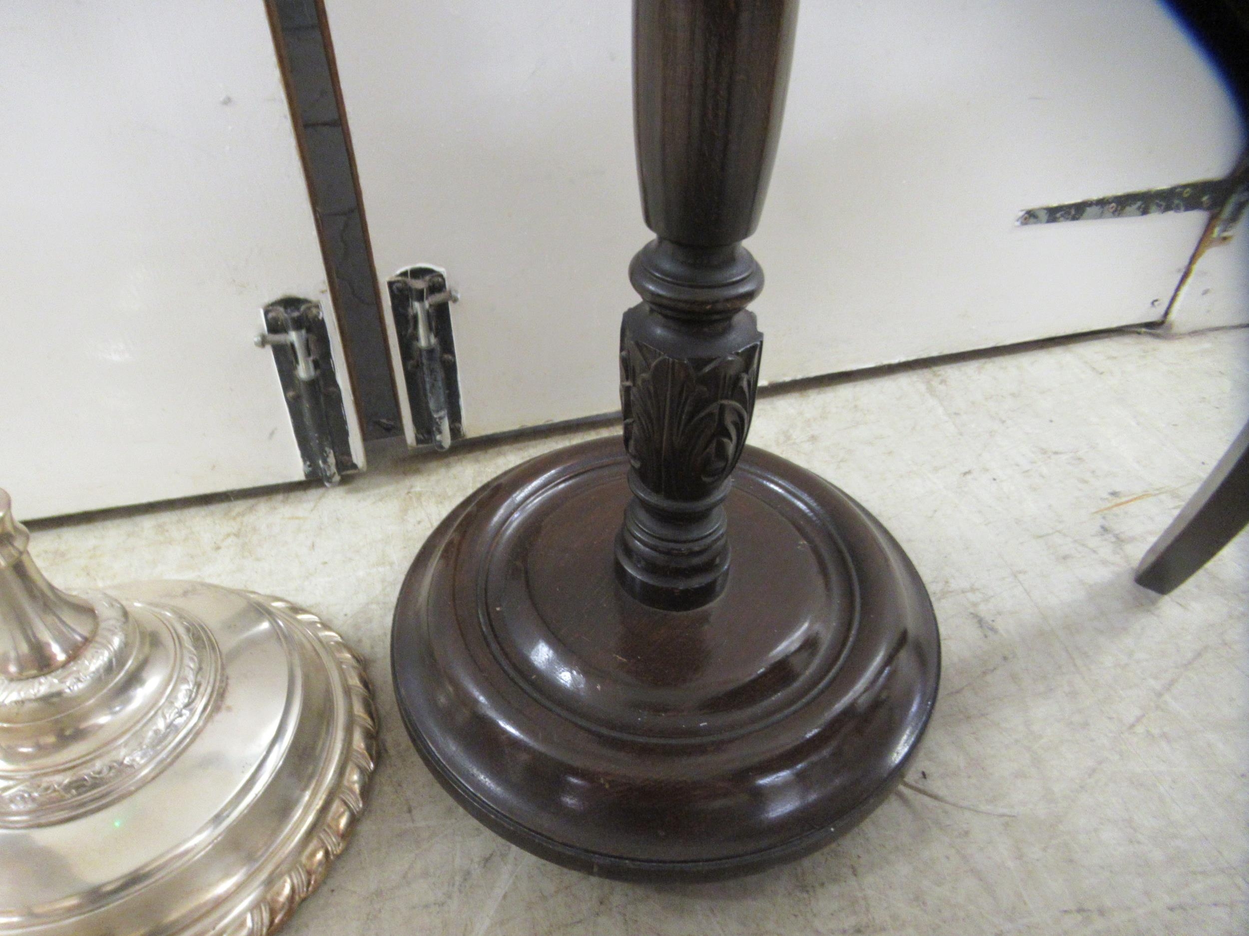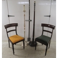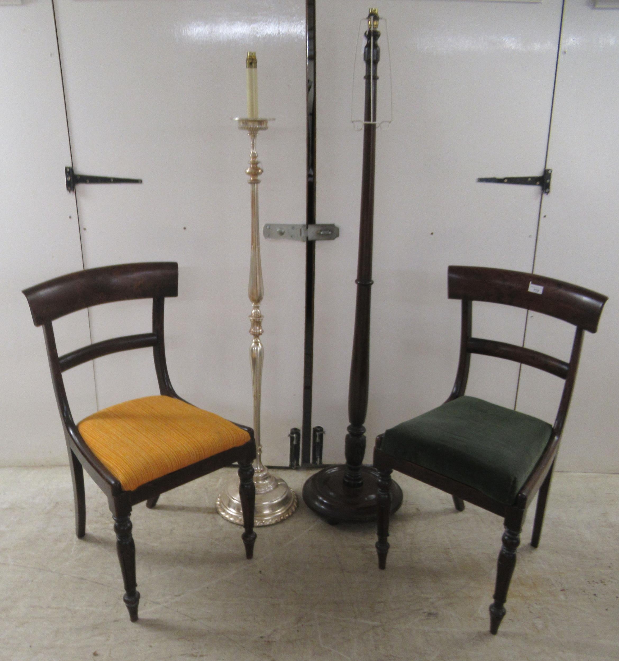 A pair of Victorian mahogany framed round bar crest dining chairs, the upholstered seats raised on turned, tulip carved and tapered forelegs; a 1930s mahogany standard lamp, on a turned base 6"h; and a modern silvered steel, candle style standard lamp 55"h