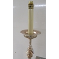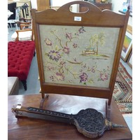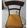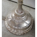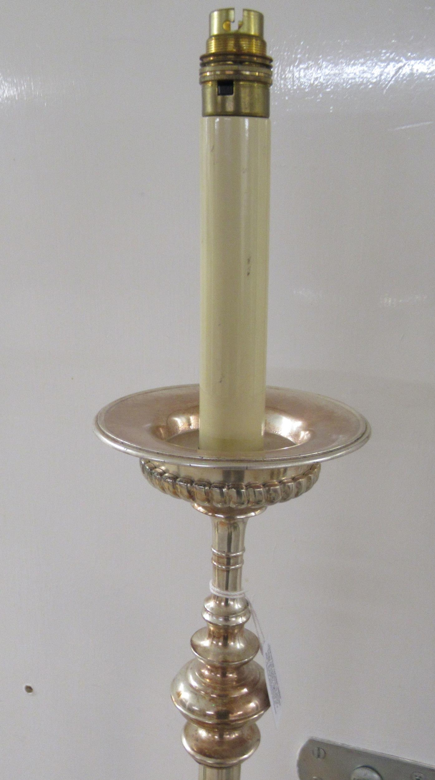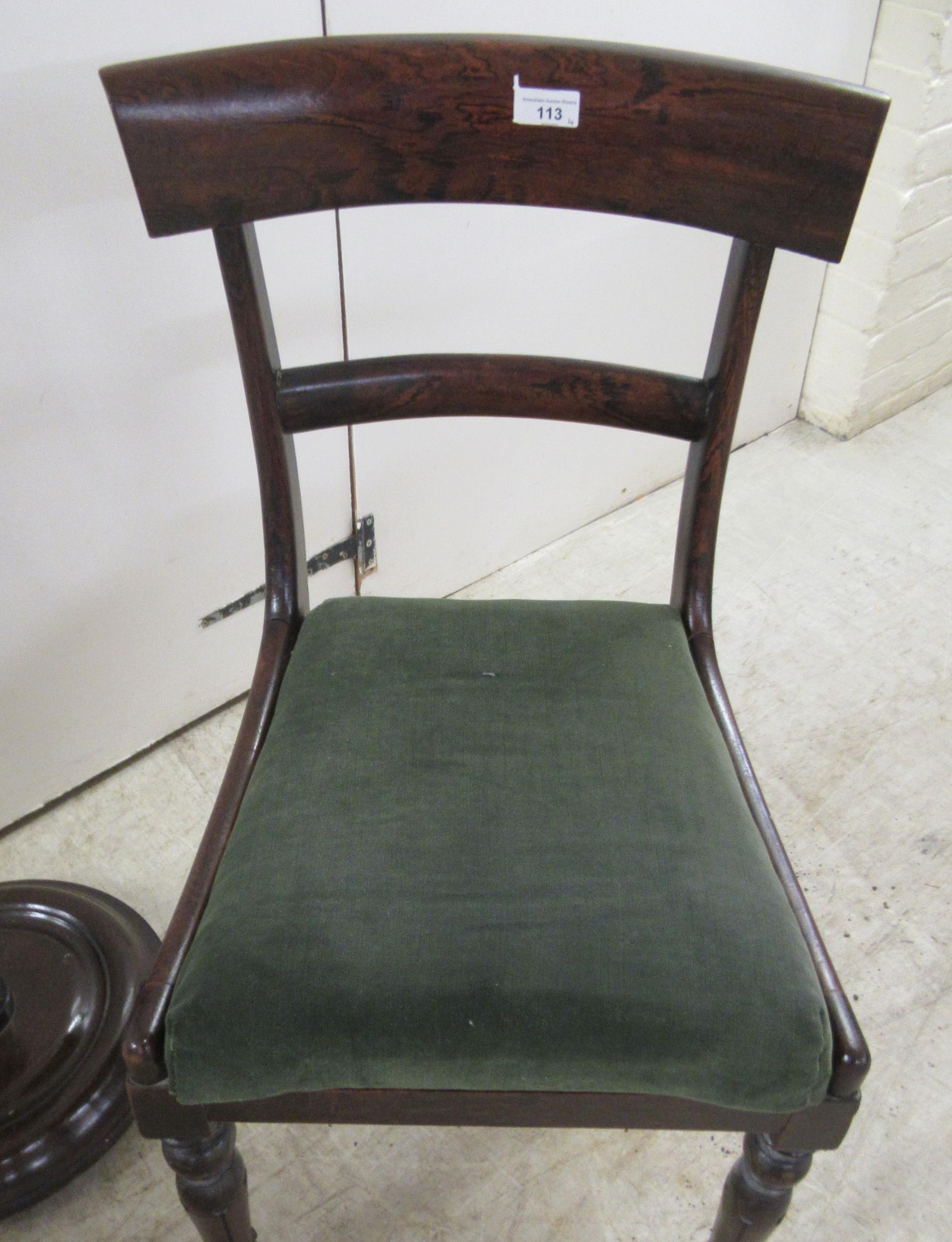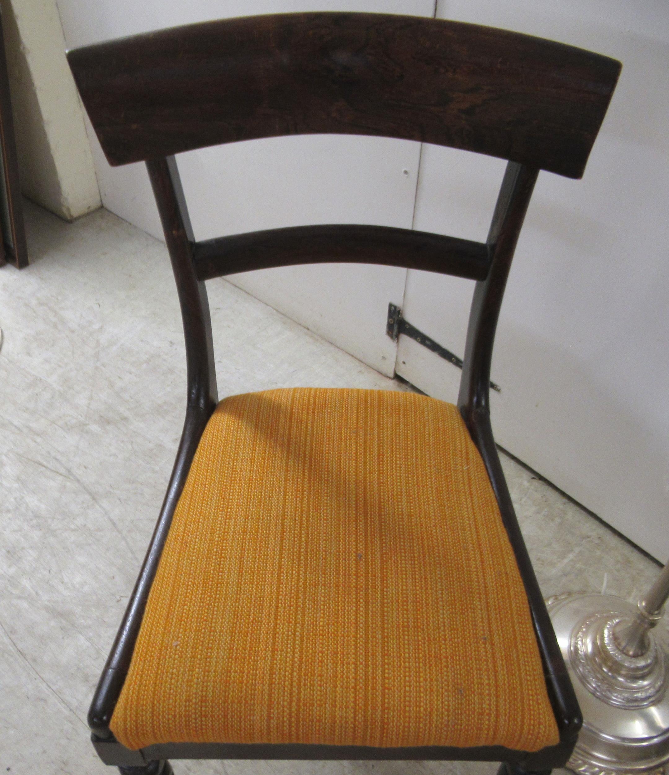 A pair of Victorian mahogany framed round bar crest dining chairs, the upholstered seats raised on turned, tulip carved and tapered forelegs; a 1930s mahogany standard lamp, on a turned base 6"h; and a modern silvered steel, candle style standard lamp 55"h