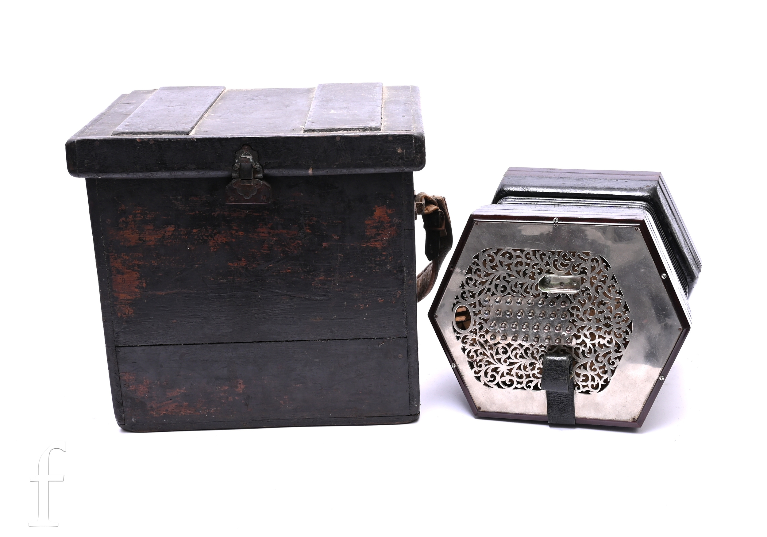 A late 19th to early 20th Century octagonal cased concertina, thirty two button operation, in pine case, width 32cm.