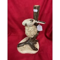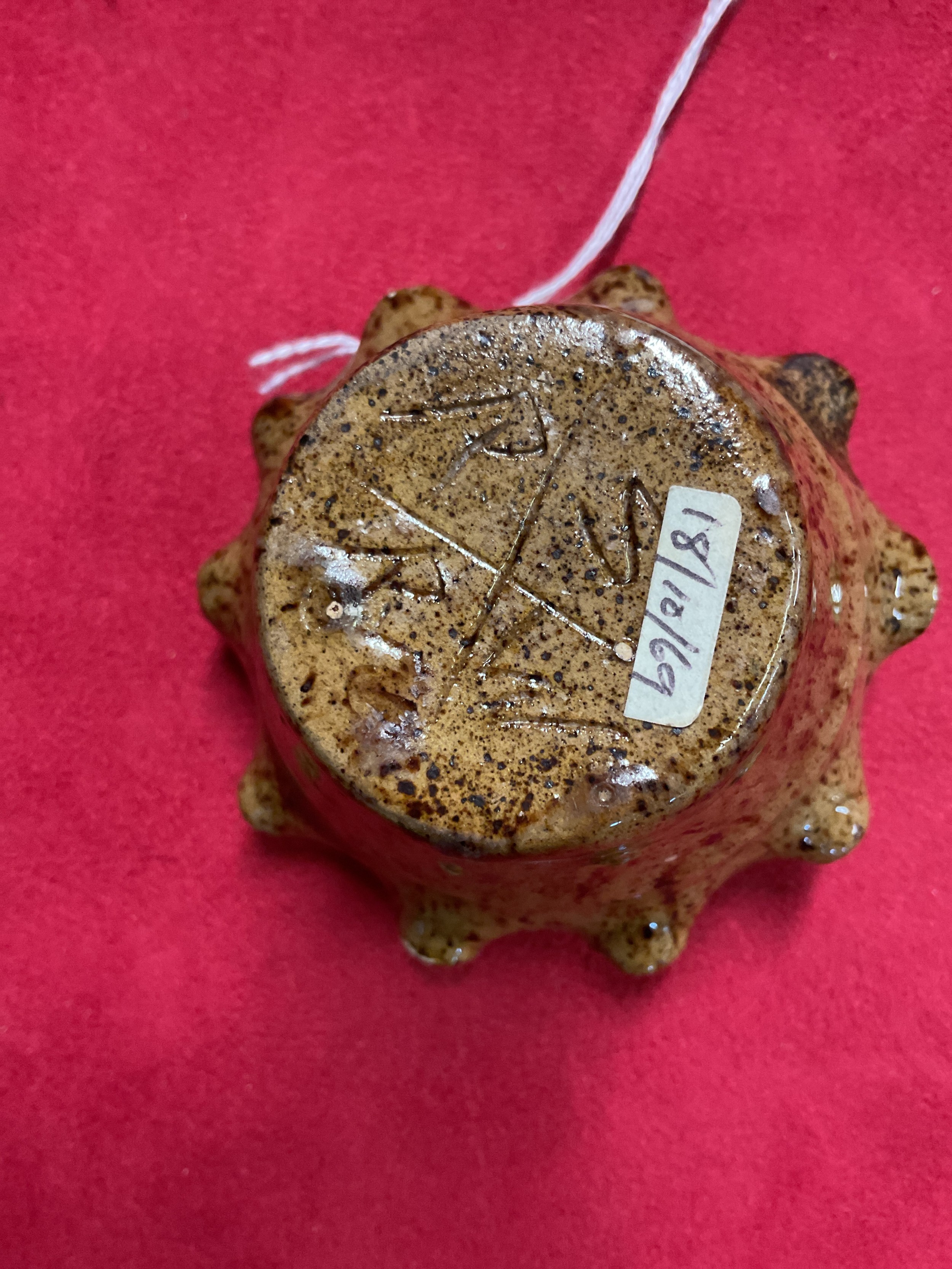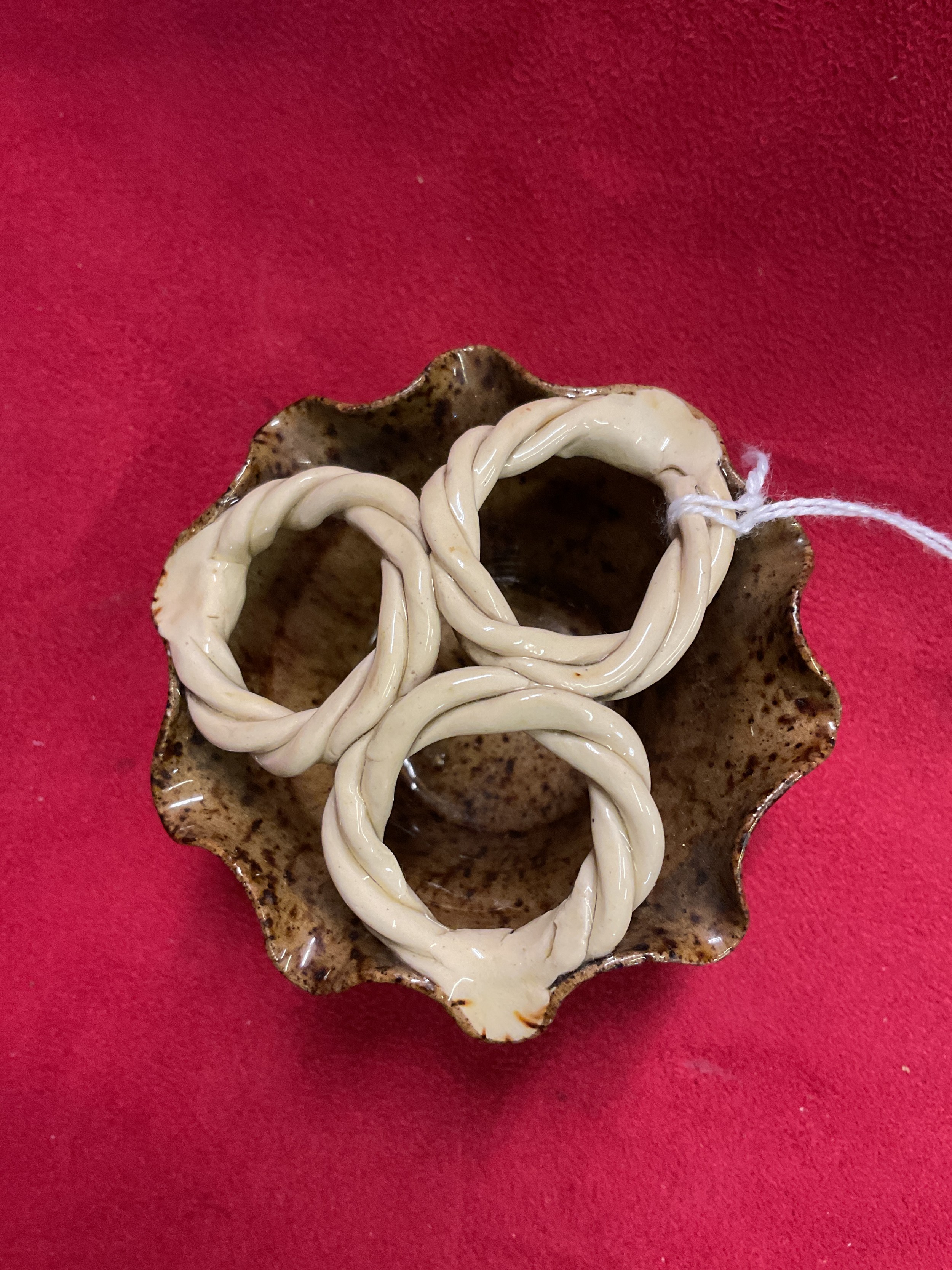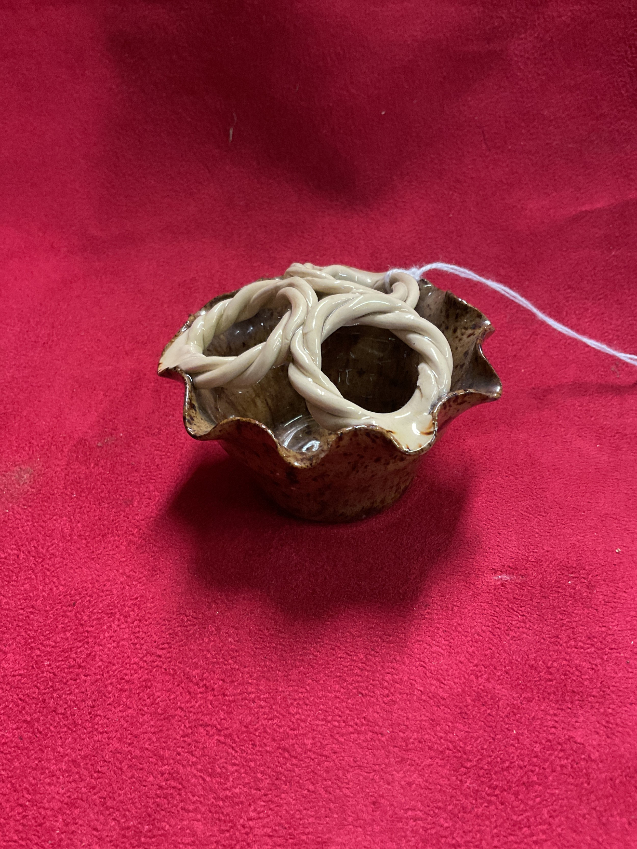 A Rye Pottery brown glazed crimp top basket with cream rope twist handles