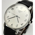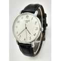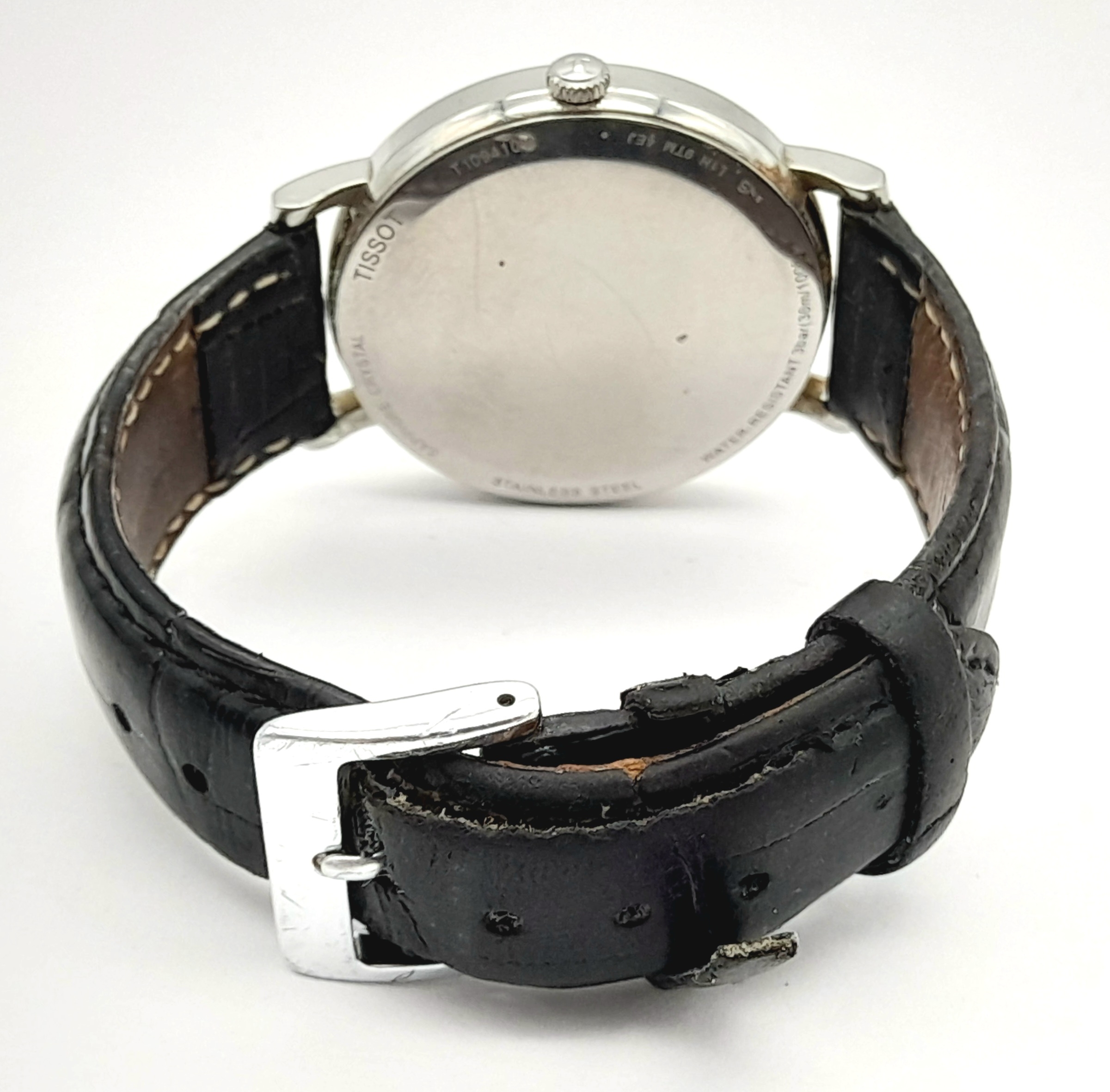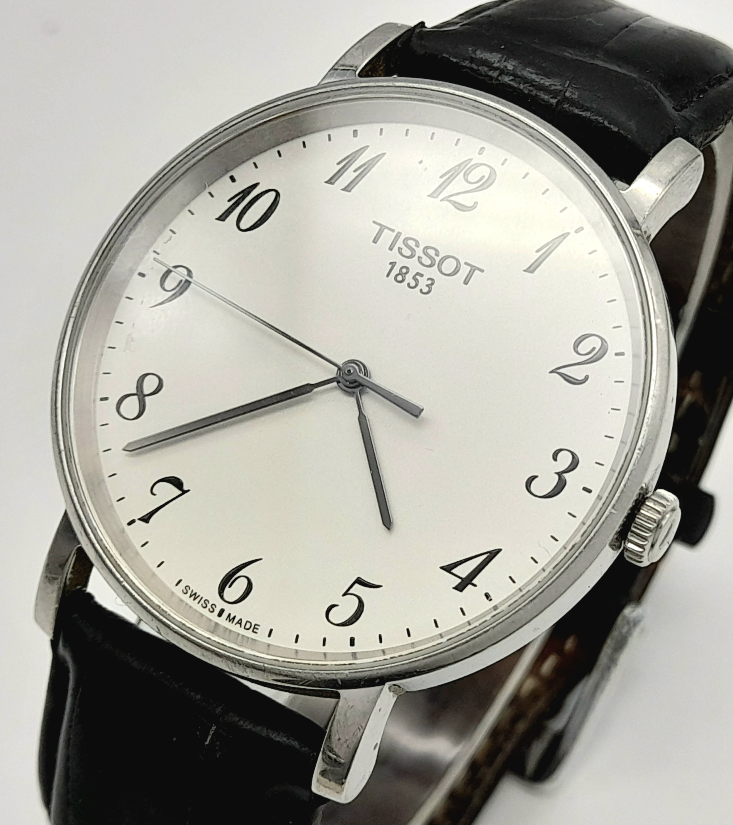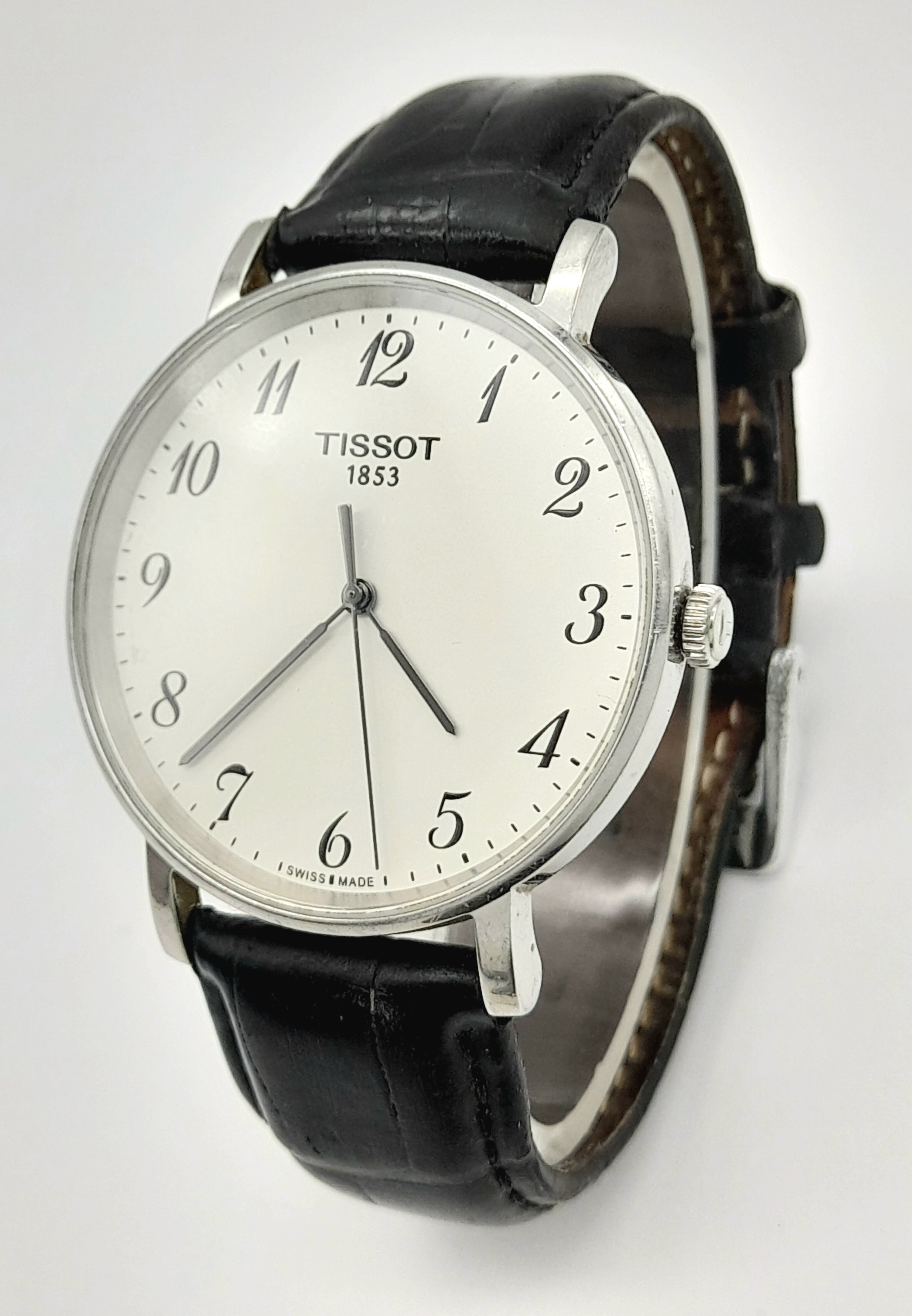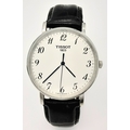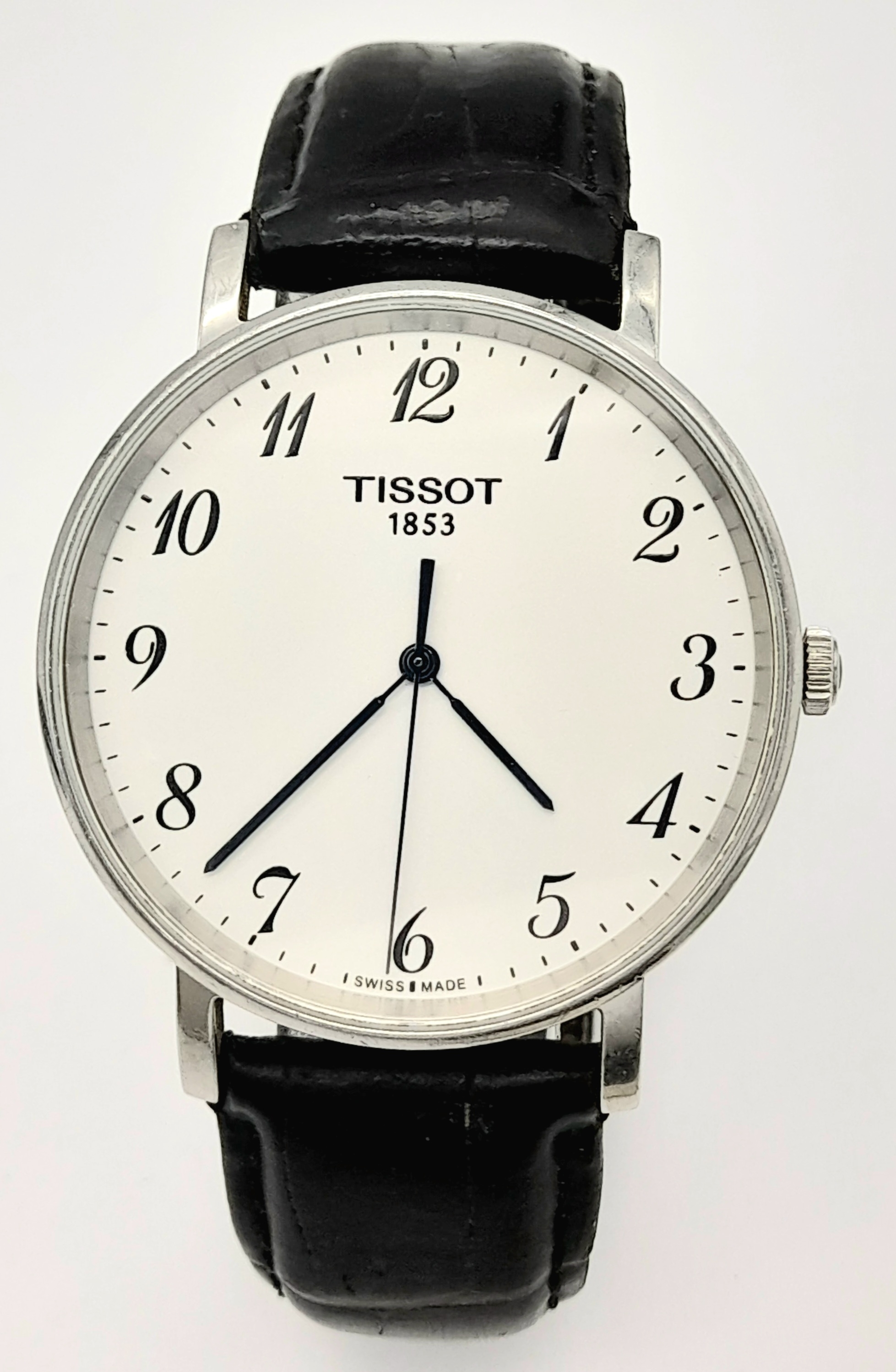 Gentleman’s TISSOT 1094 EVERYTIME WRISTWATCH. Finished in stainless steel with large white dial. Black leather strap in vintage condition. Full working order.