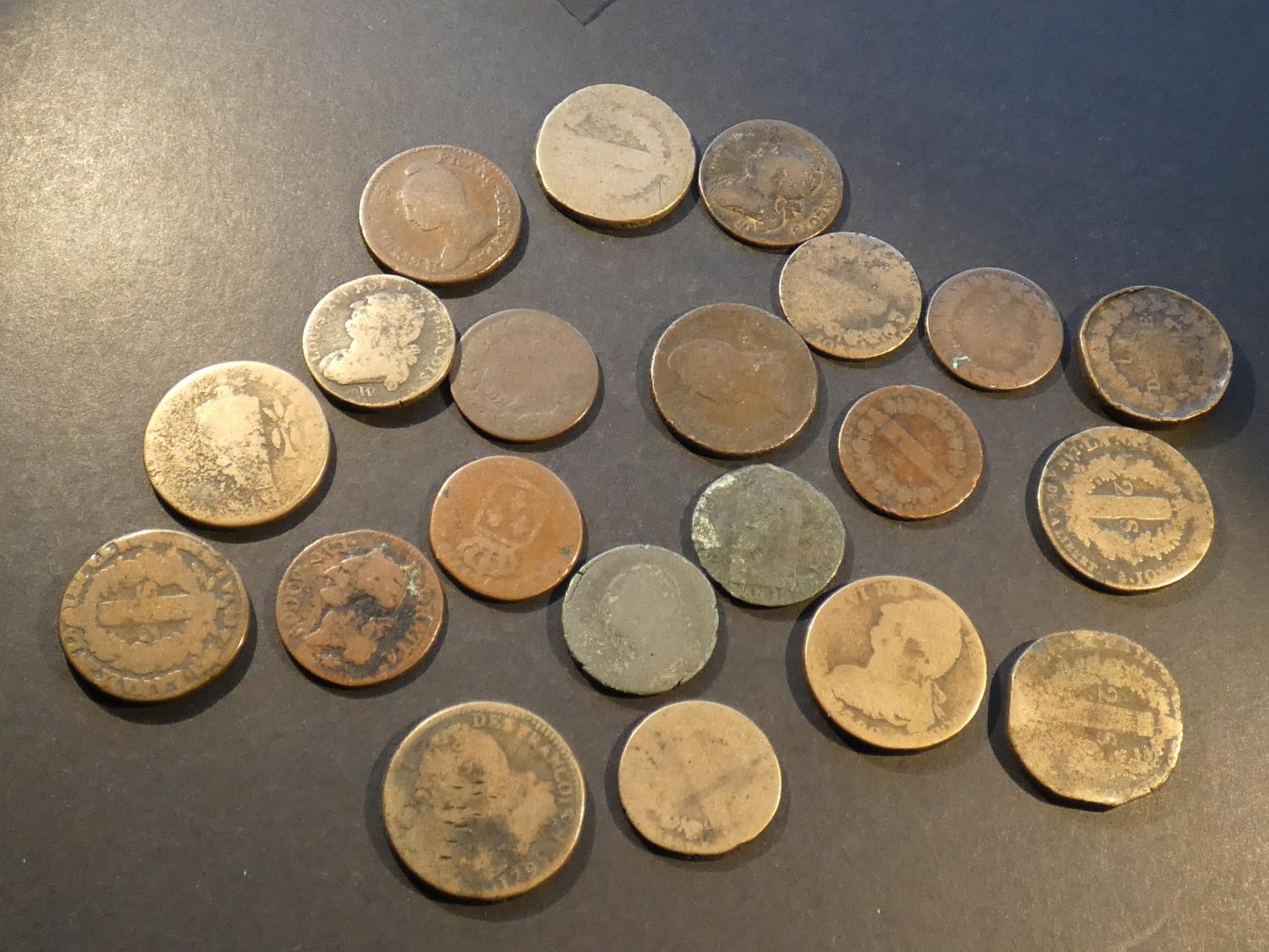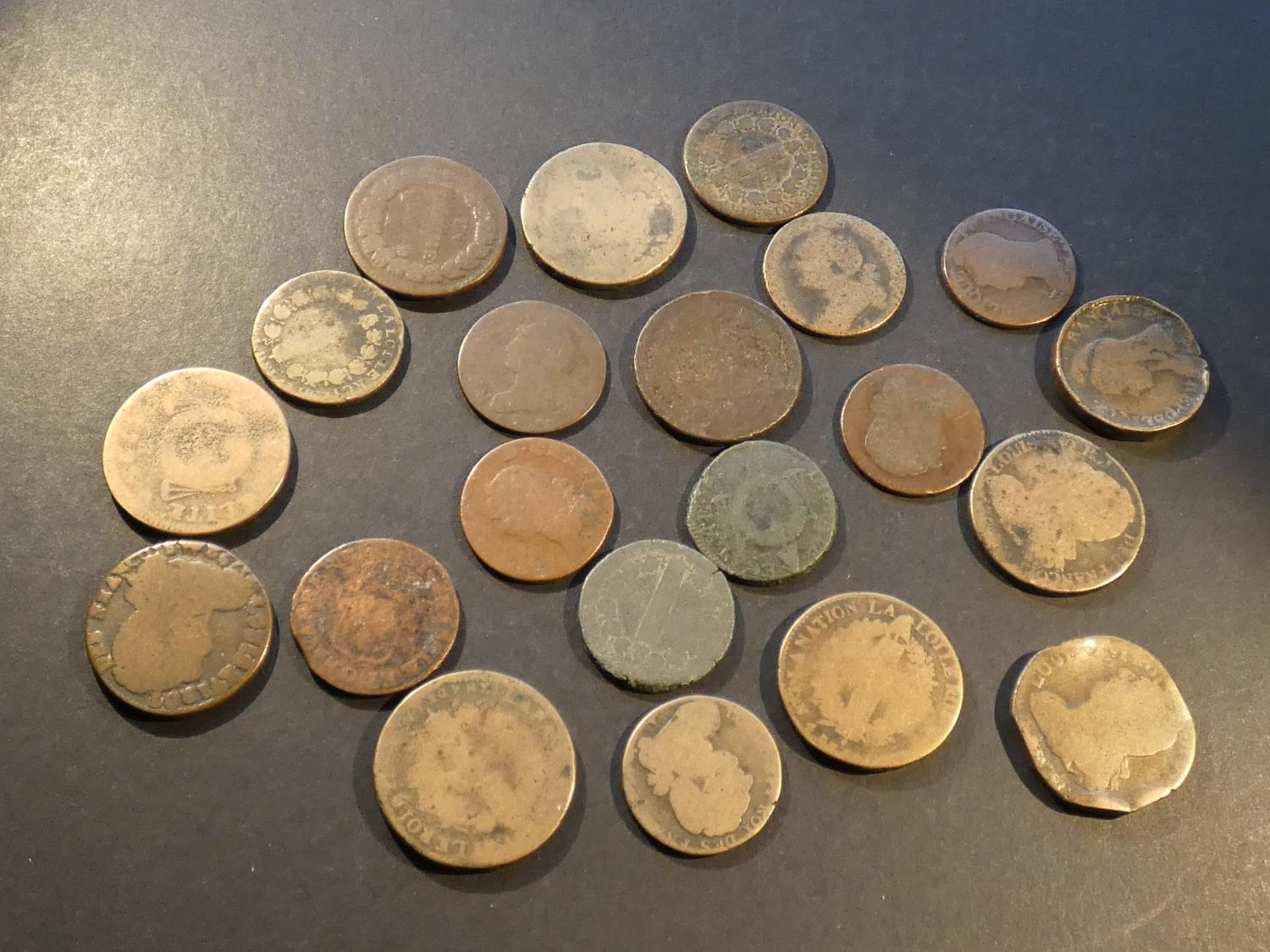 FRANCE. 1 Sol (1771, 1791, L’An II tablet type), 2 Sols (1792AA, 1792N, 1793 tablet type), 12 Deniers (1792W), 5 Centimes (L’An 5BB), 1 Decime (L’An 5A) and 12 others, similar. Generally low grades Poor to VG, worn. (21)