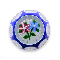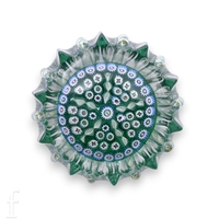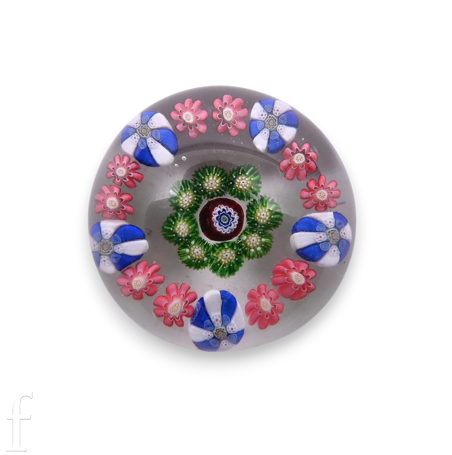 A 19th Century Baccarat paperweight, of domed form, internally decorated with a central complex cane surrounded by a circle of green/yellow millefiori canes, with an outer ring of alternating blue/white large canes and pink/white small flower canes, all cased in clear crystal, diameter 4.5cm.