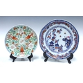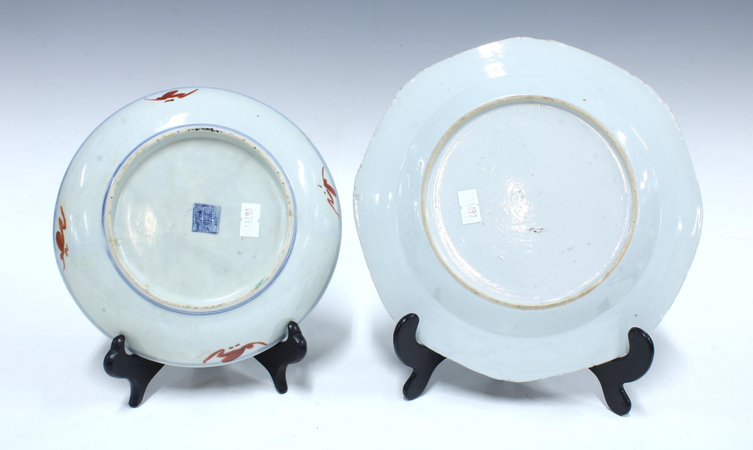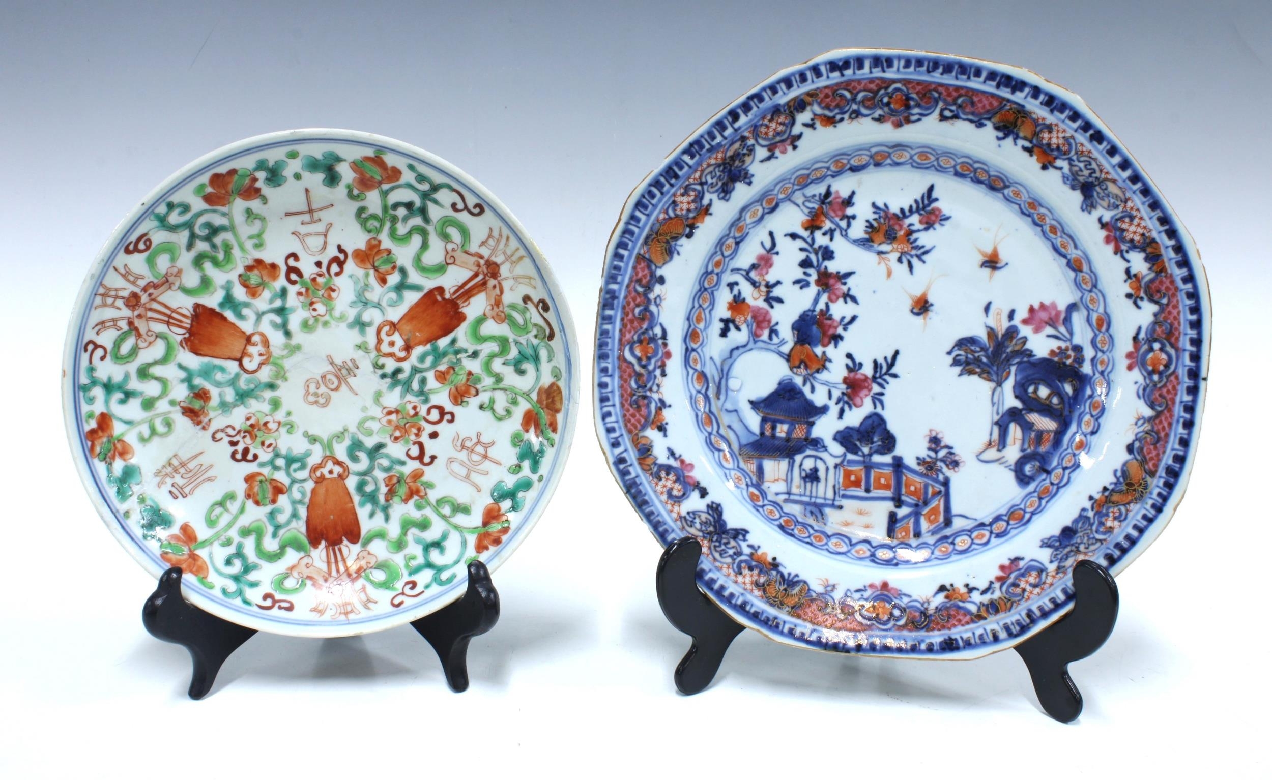 18th century Chinese Export octagonal plate, 23cm together with a Chinese famille verte plate a/f with restored break (2)