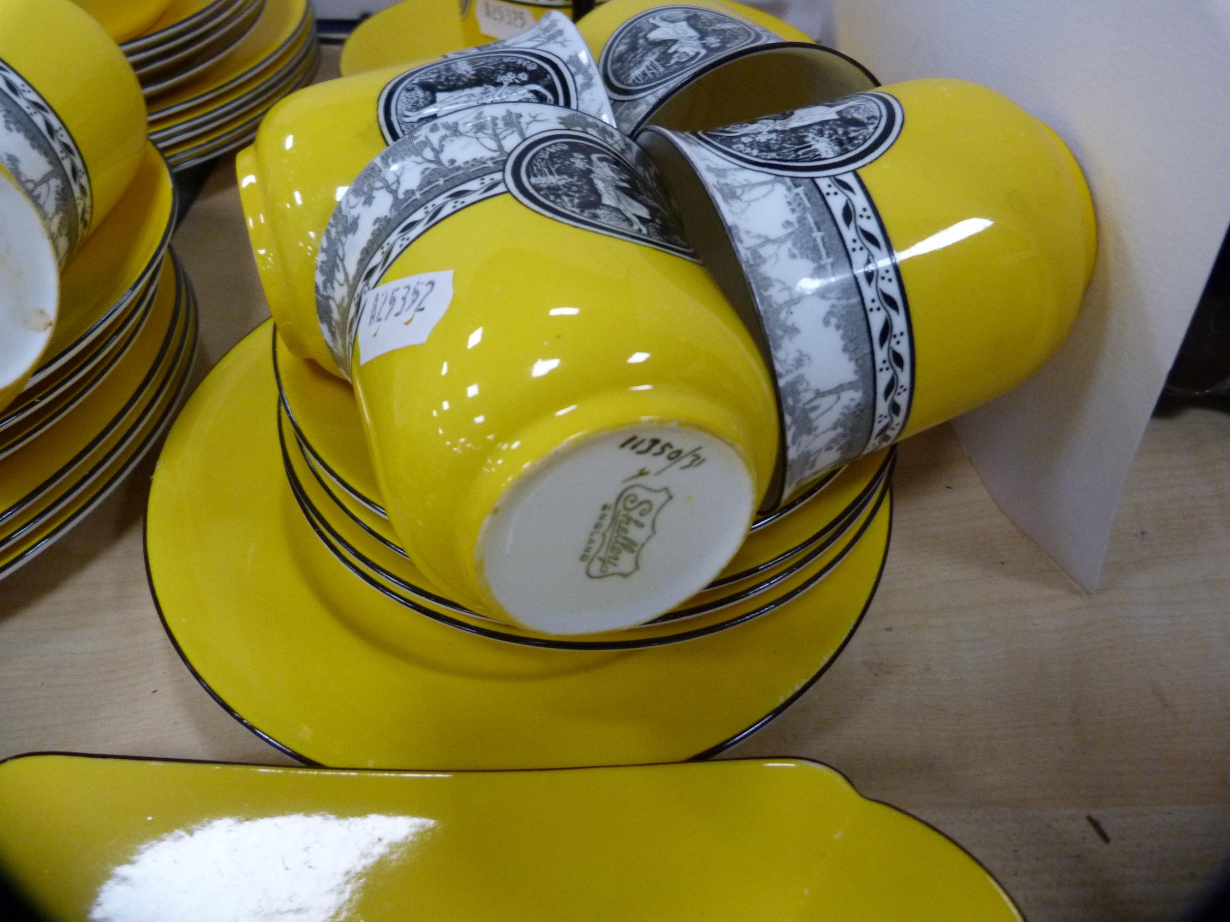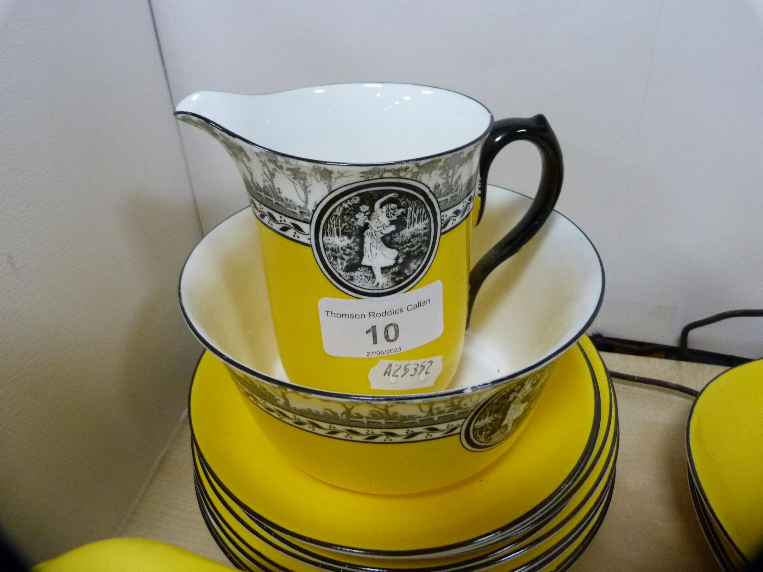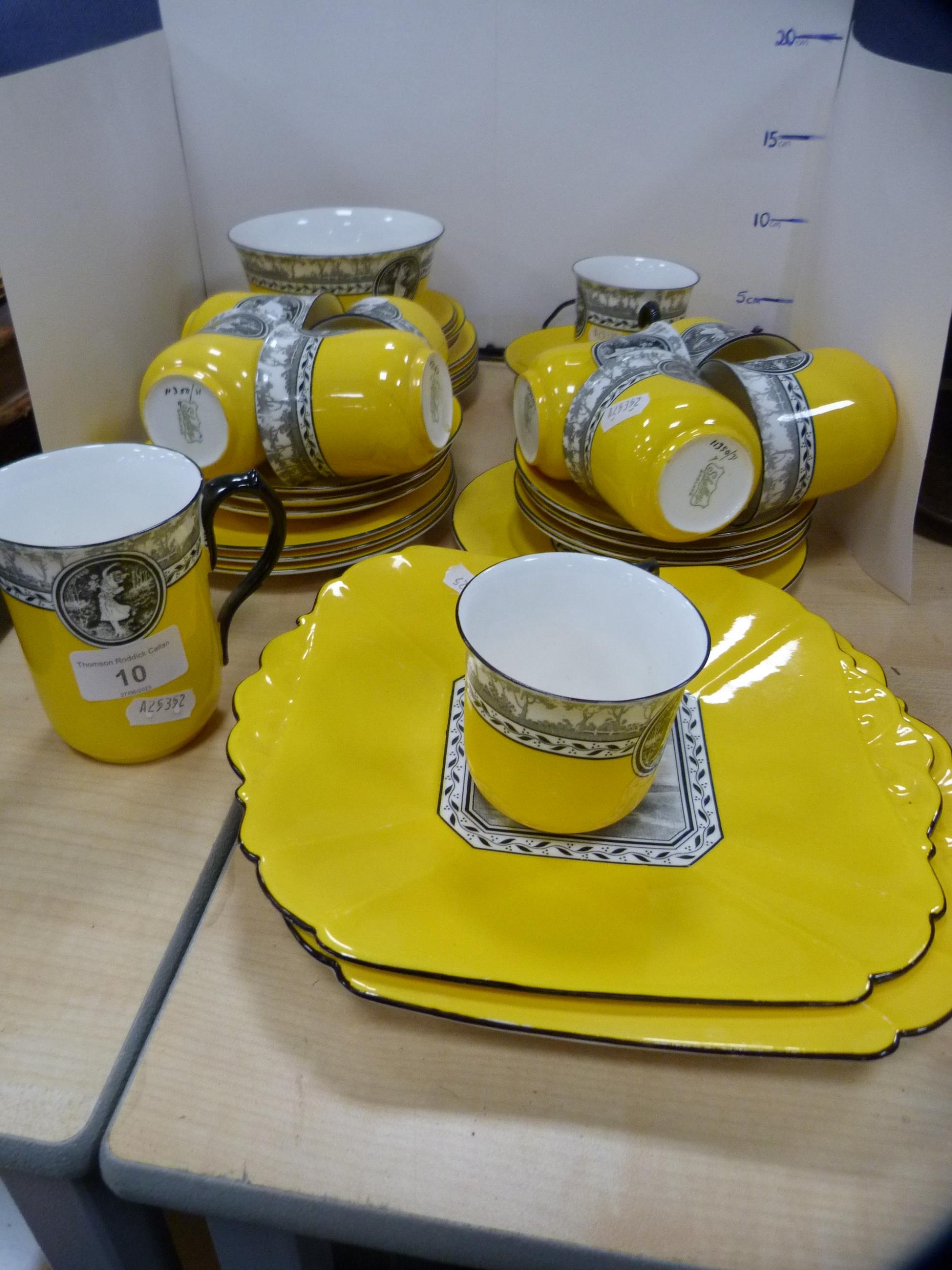 Shelley part tea set decorated with a pictorial scene of female dancers on a yellow ground. (39)