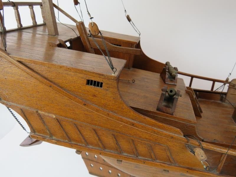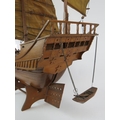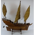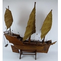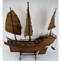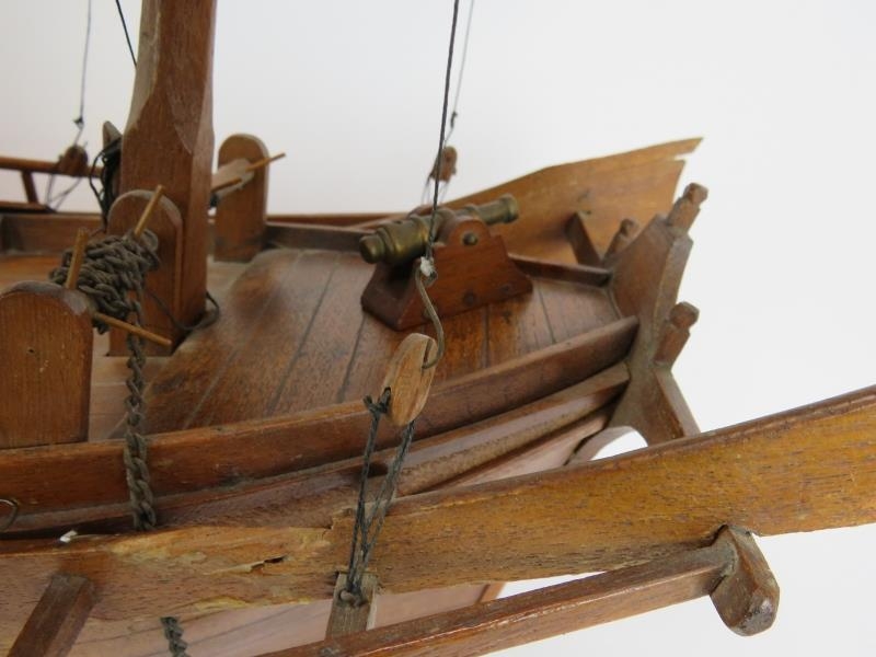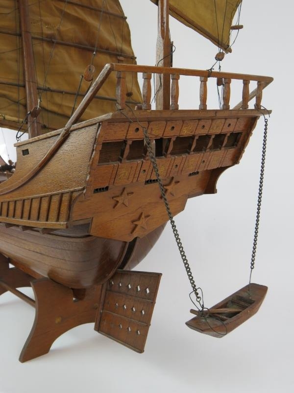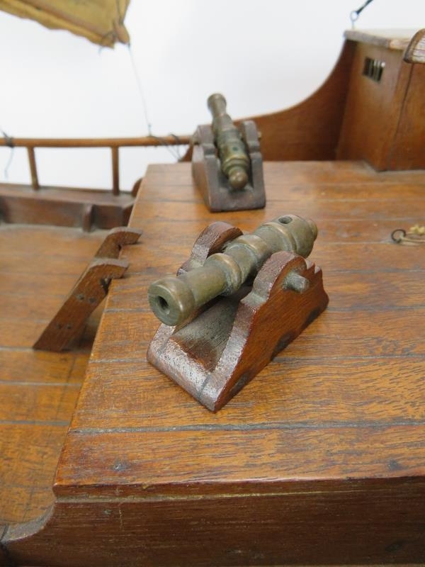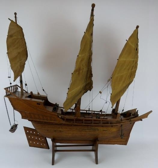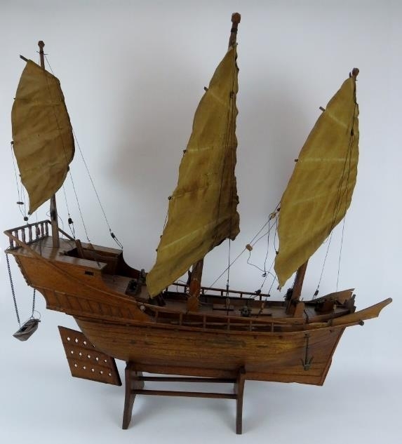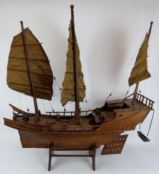 A wooden scale model of a Chinese junk complete with brass cannons. Brought back by the vendor's family in the 1930s. Height 91cm. Length 82cm.