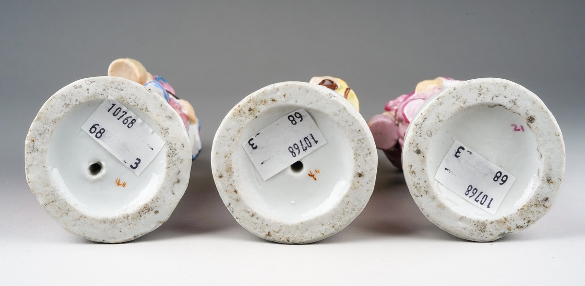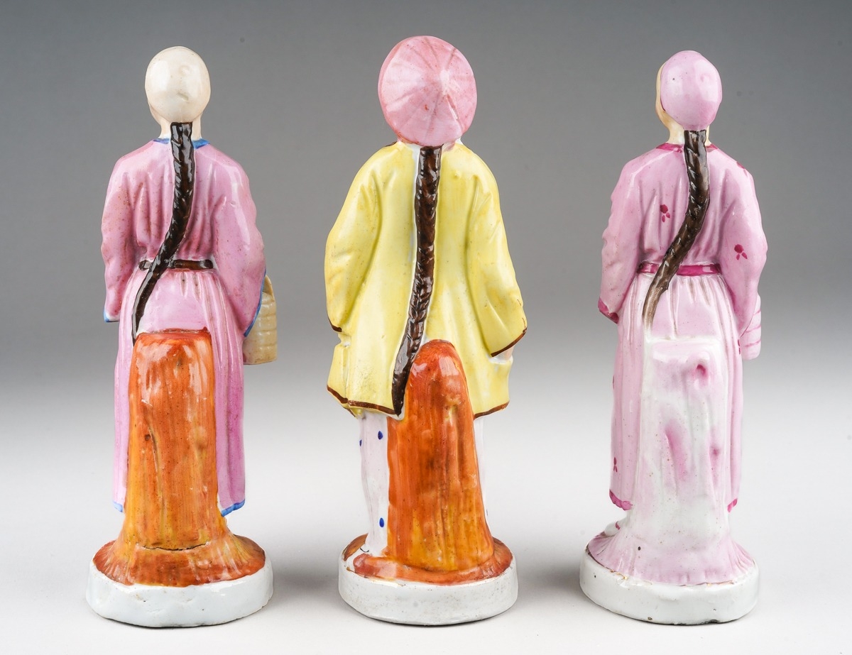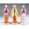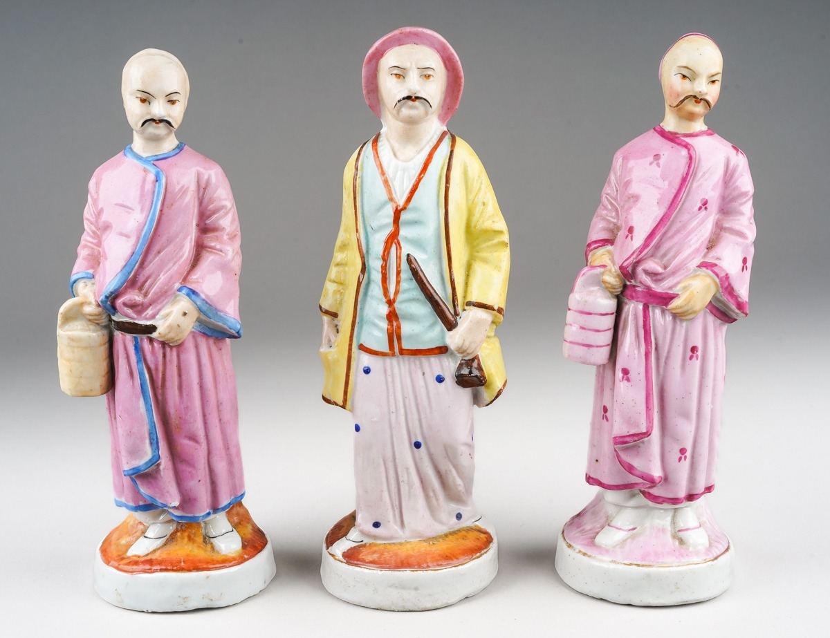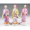 Three 19th Century hard paste Russian porcelain figures of Oriental males, two the same model with variations to the decoration, the third modelled holding a pipe, all on circular bases, painted arabic numerals to bases only, heights 17cm to 17.5cm (3)