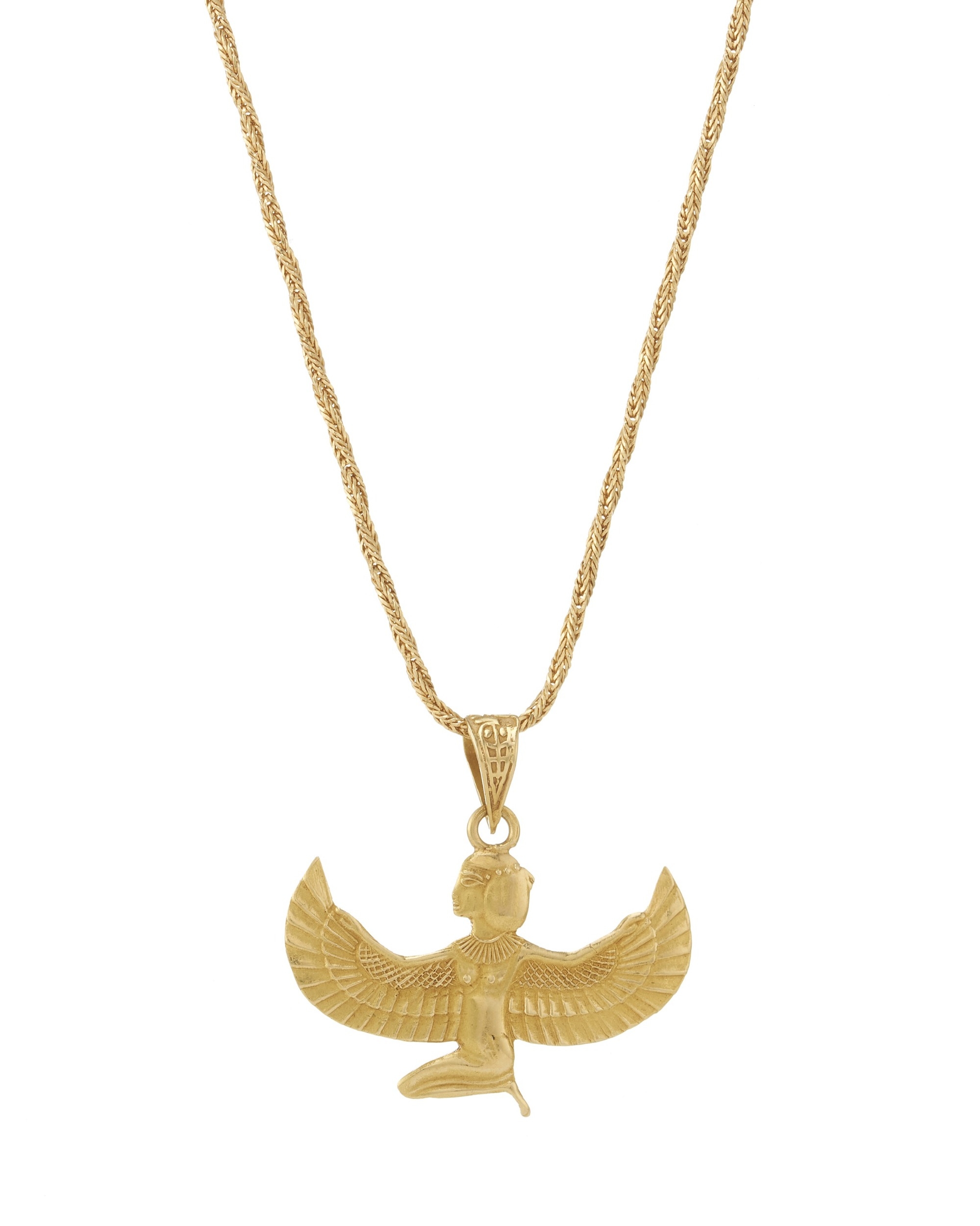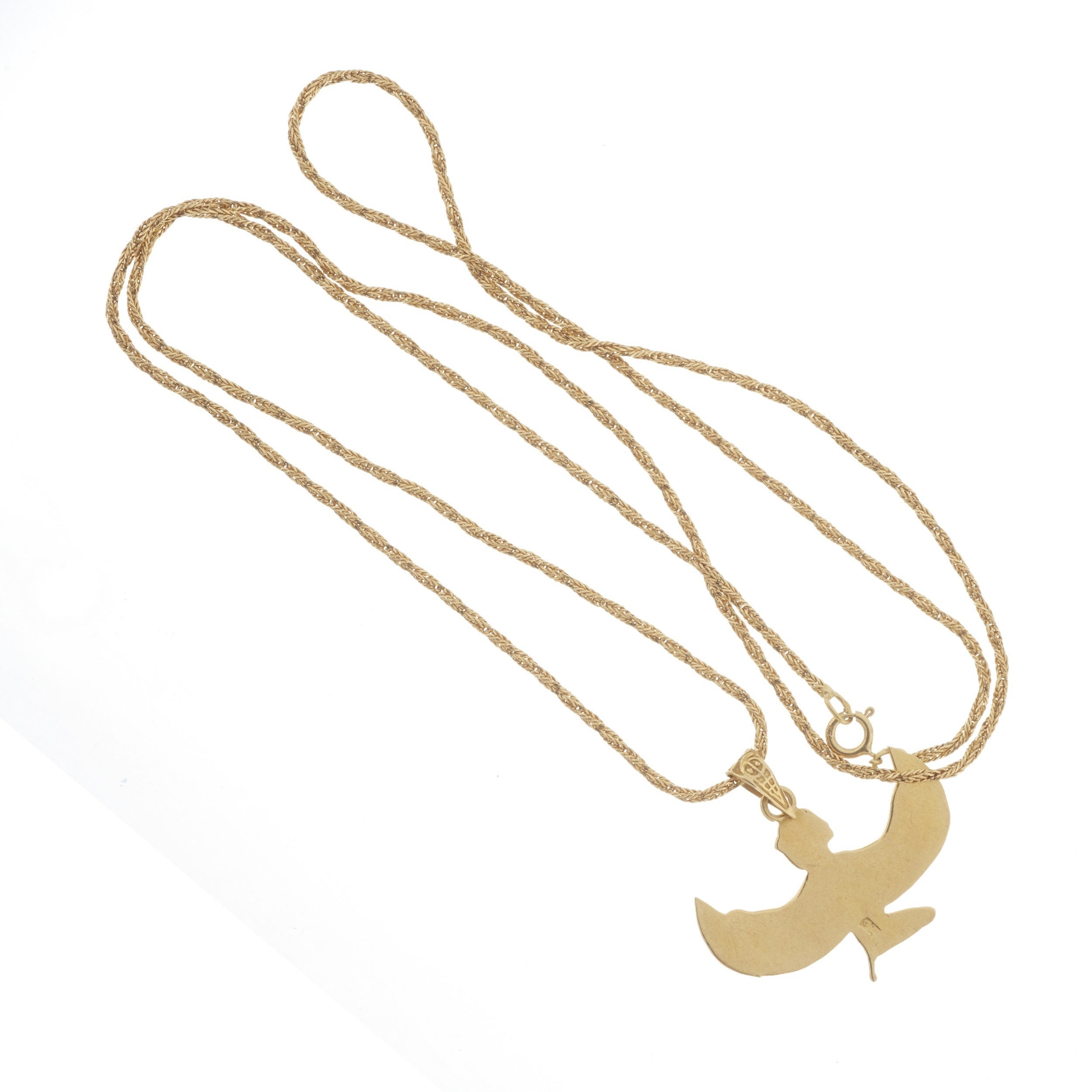 An Egyptian high carat gold pendant, with 18ct gold chain, Egyptian assay marks, clasp stamped 750, length of pendant 3cm, length of chain 66cm, 13.5g