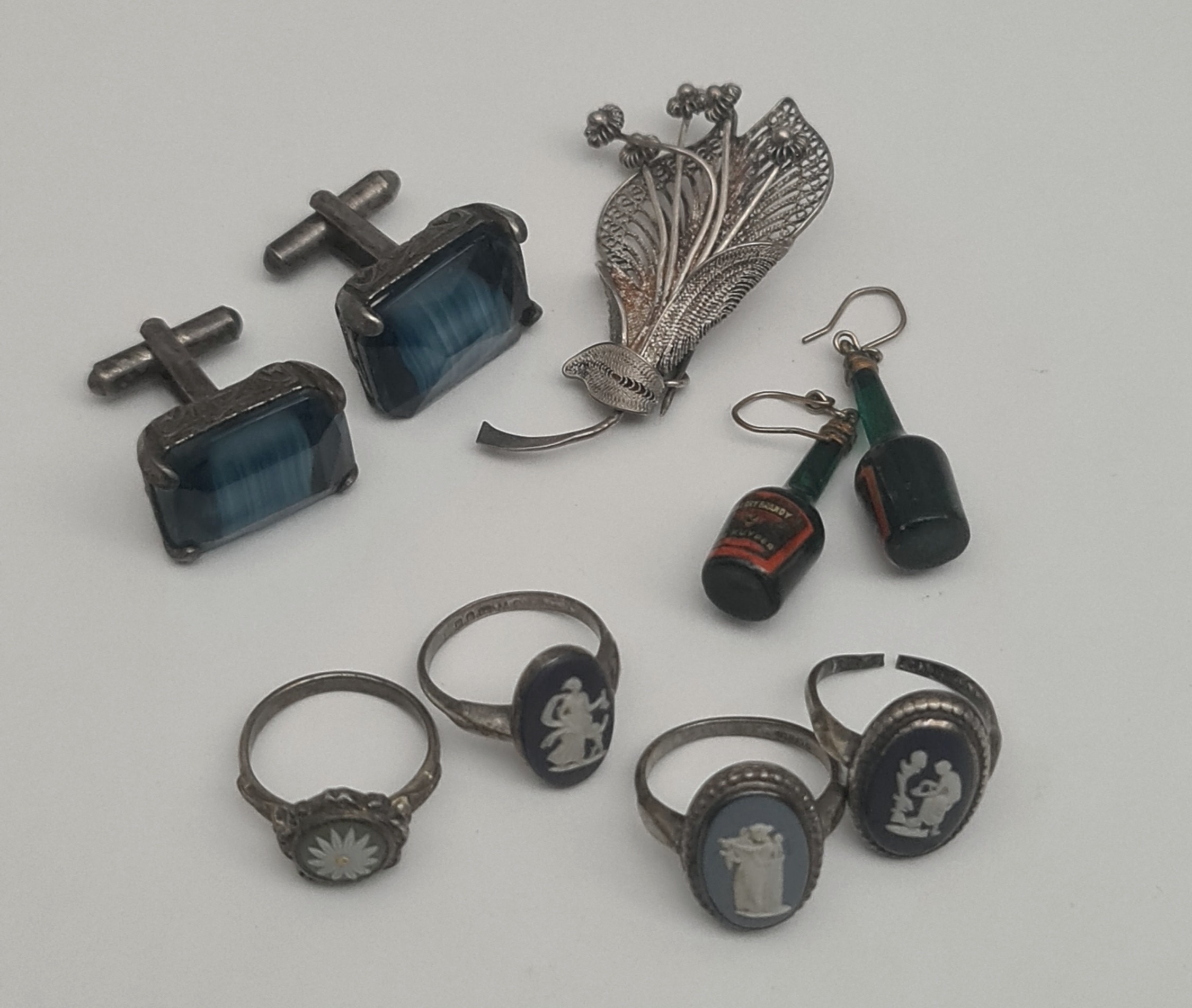 Vintage Jasper Style Rings Silver Coloured Metal De Kyper Novelty Earrings 1960's Celtic Style Cufflinks and a Brooch . Shipping is available. Please ask for a quote before bidding. Where possible we combine shipping costs. Remember, if you are the highest bidder above reserve on this Lot you have bought the item and are legally responsible for the item. Viewing is recommended in either person or via video link. Contact us to arrange. #JEW 040426-02