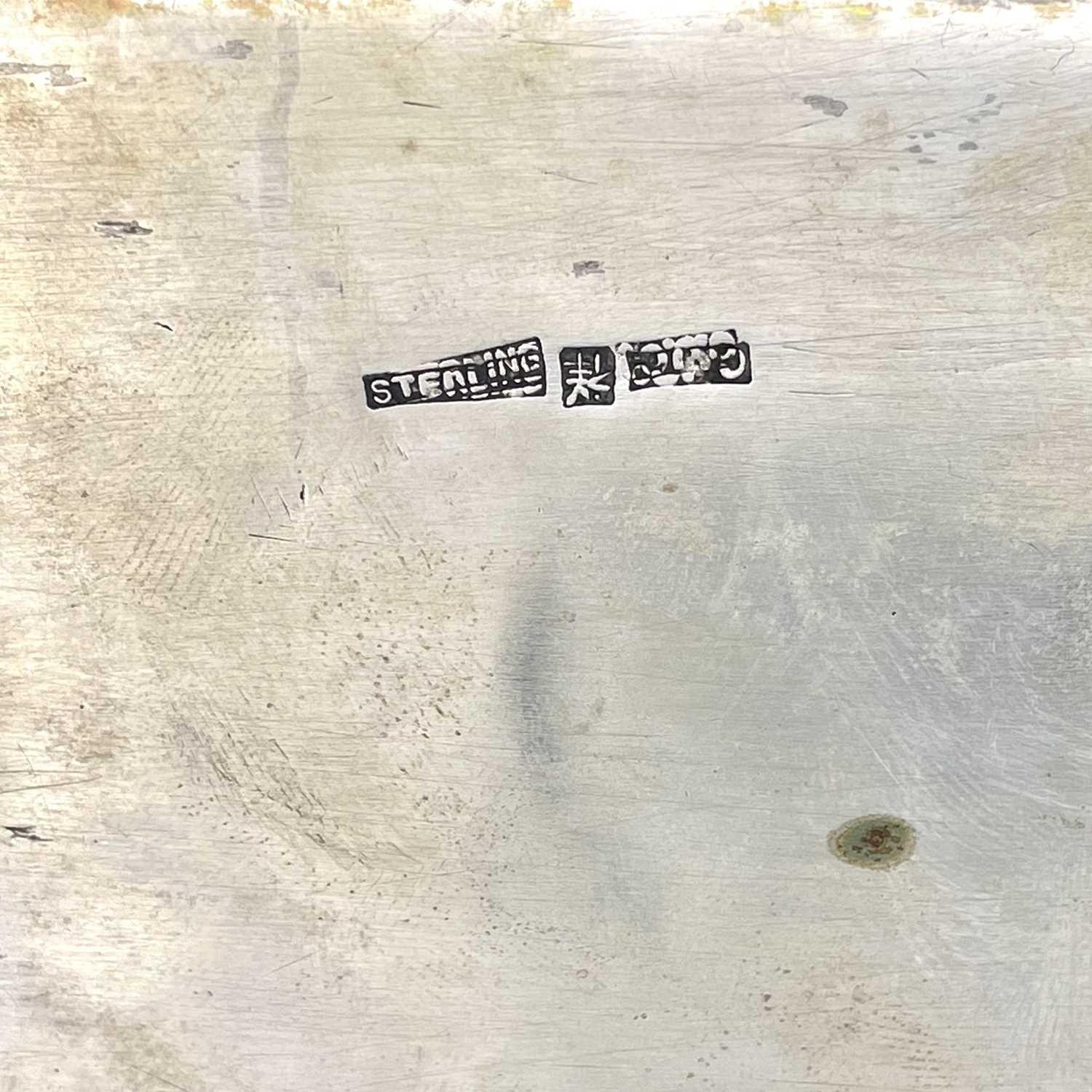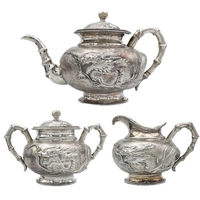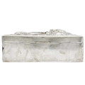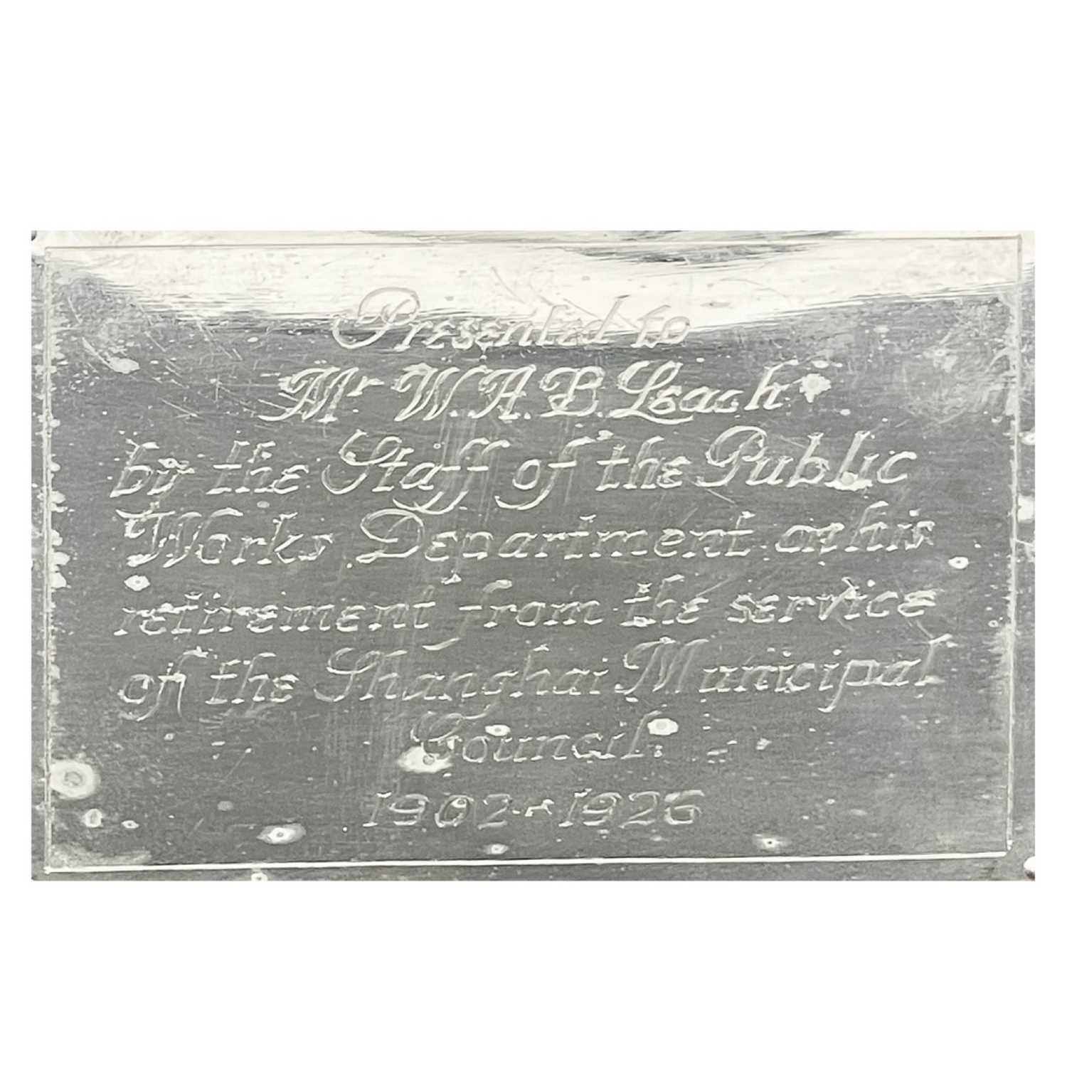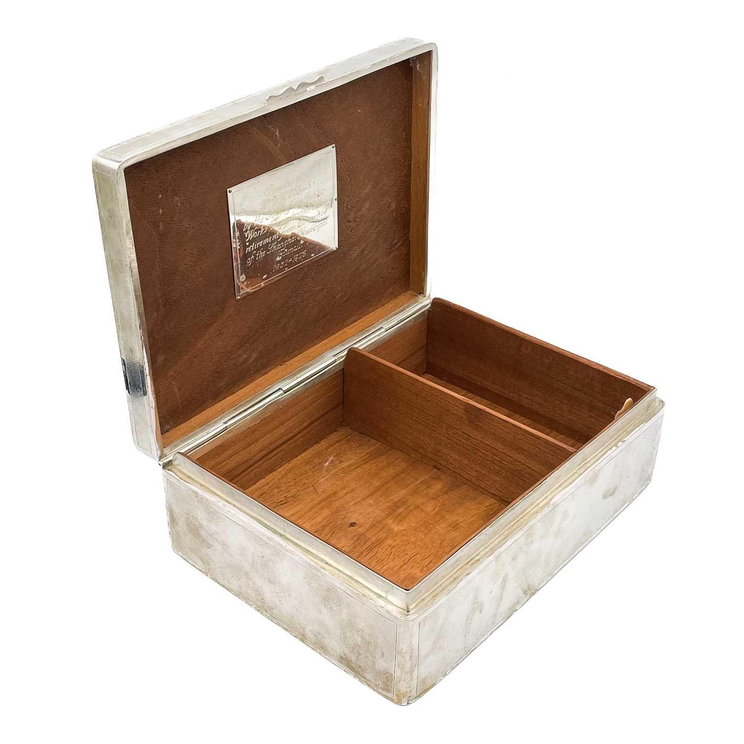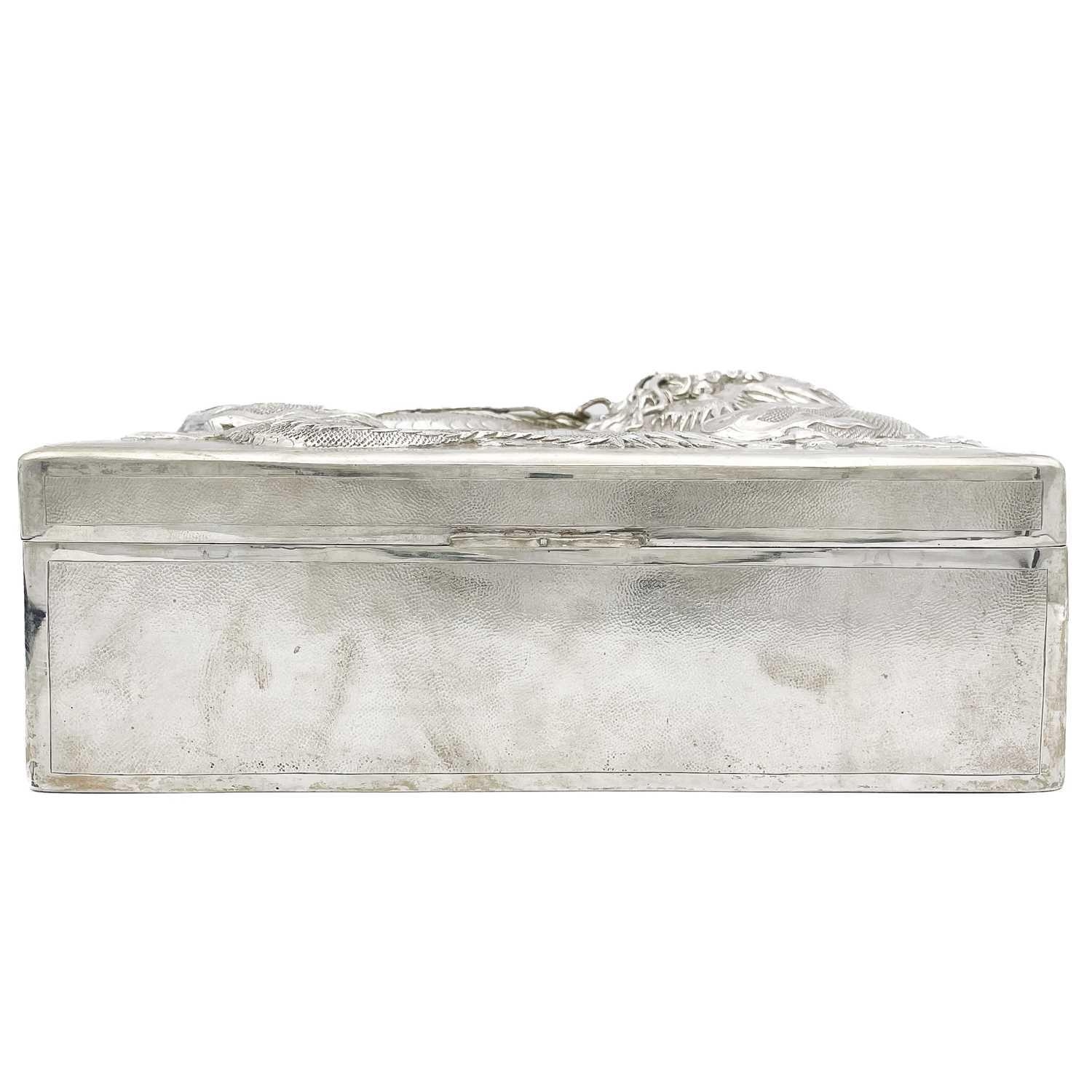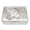 A Chinese sterling silver cigar box, circa 1900. The hinged cover decorated in high relief with a dragon chasing an initialled flaming pearl, the twin sectioned wooden interior with silver presentation plaque inscribed 'Presented to Mr W.A.B. Leach by the staff of the Public Works Department on his retirement from the service of the Shanghai Municipal Council 1902-1926', unidentified Shanghai makers mark,1875-1930, height 9cm, width 22cm, depth 16cm.
