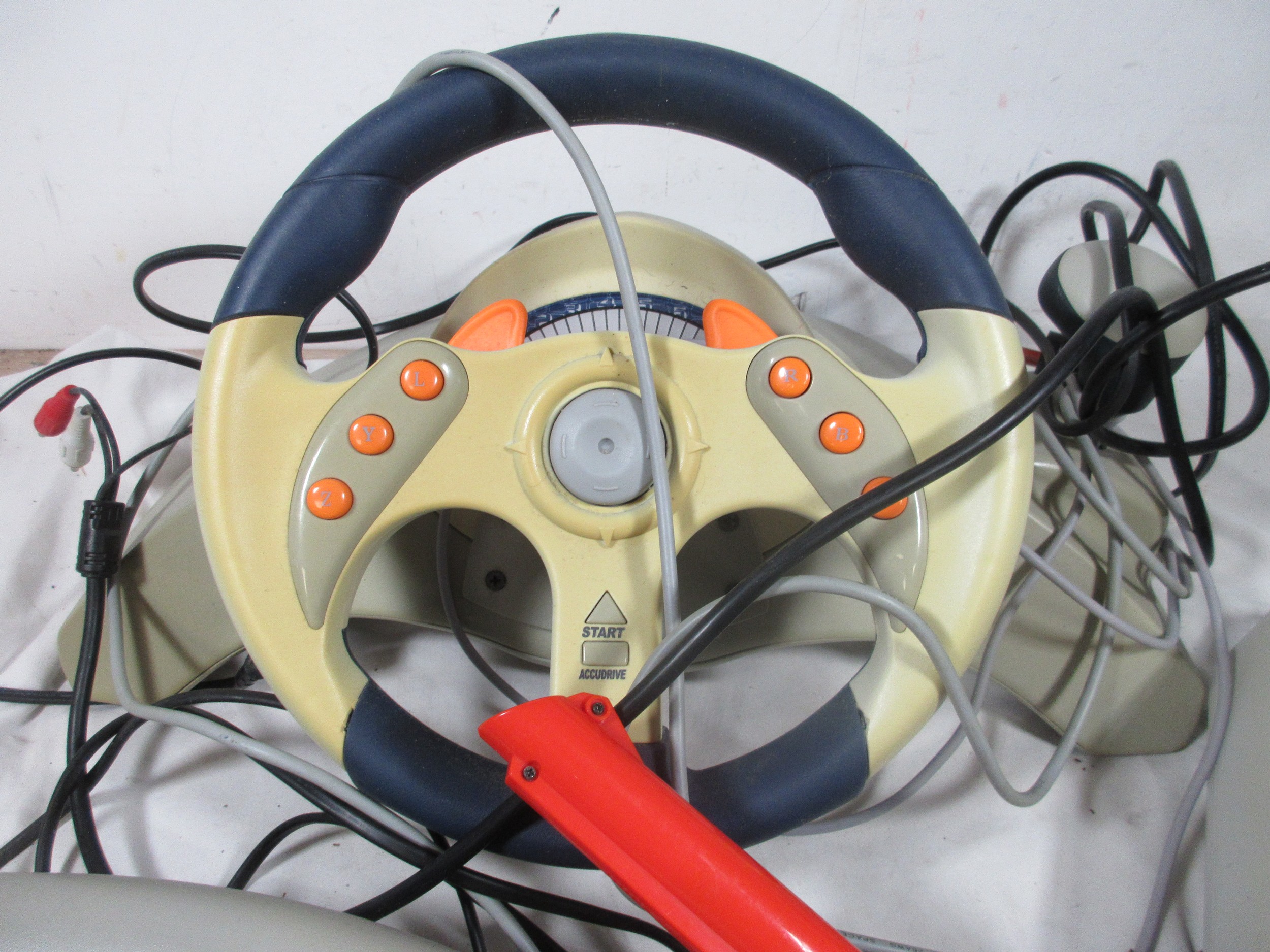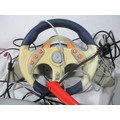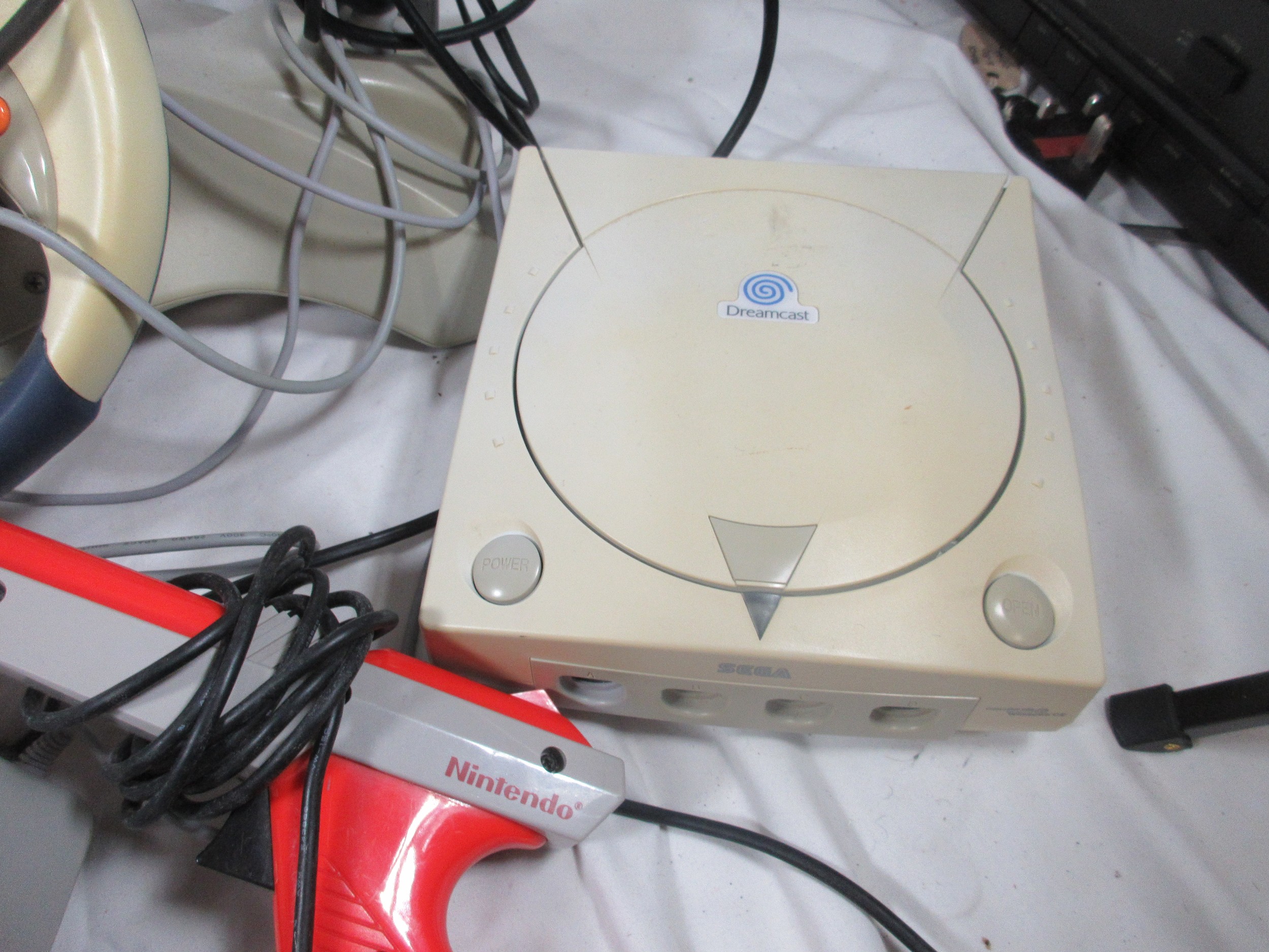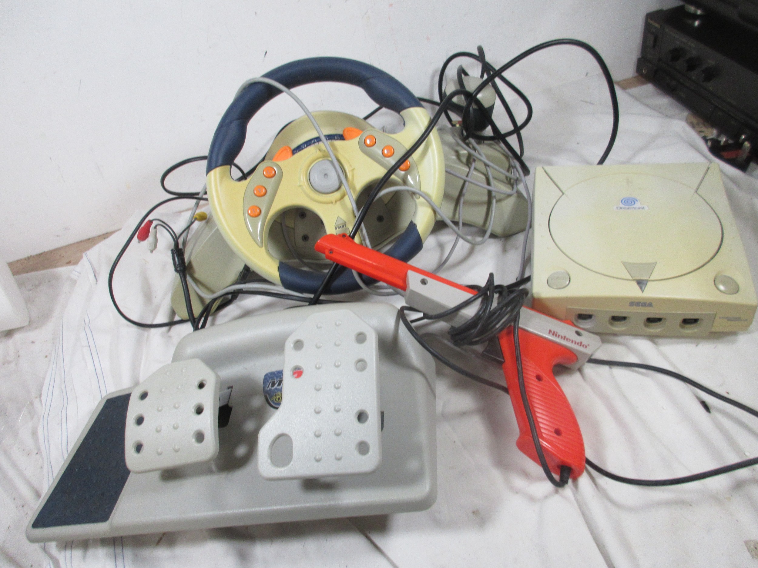 A Sega Dreamcast Set up to include foot pedals ,Steering wheel ,Disc holder and a separate Gun ,may or may not be related .