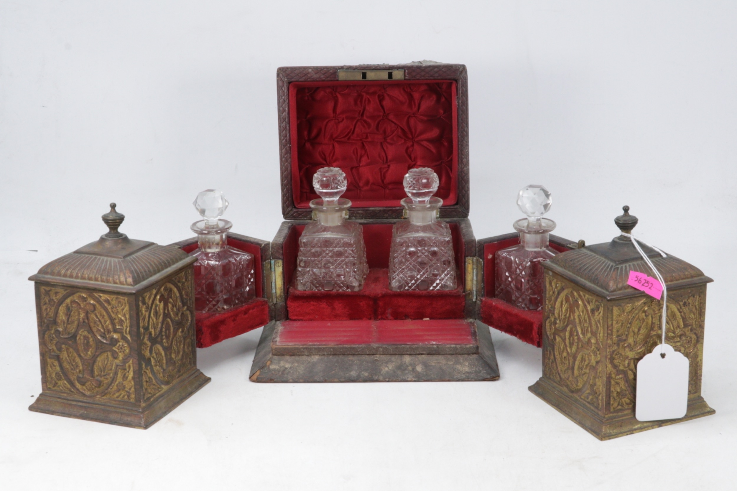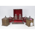 Antique pair of brass tea caddy's together with a vanity perfume set of bottles.