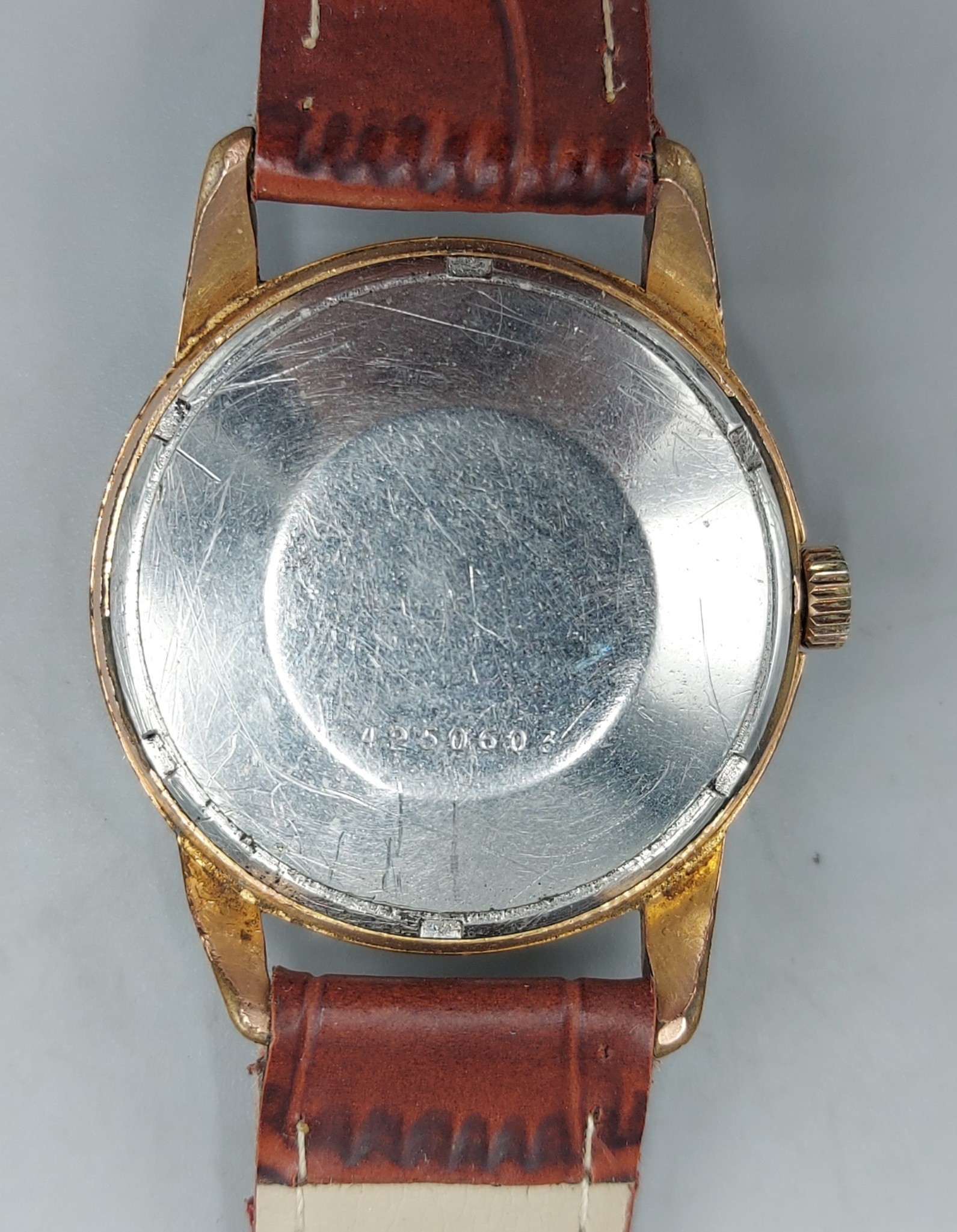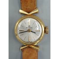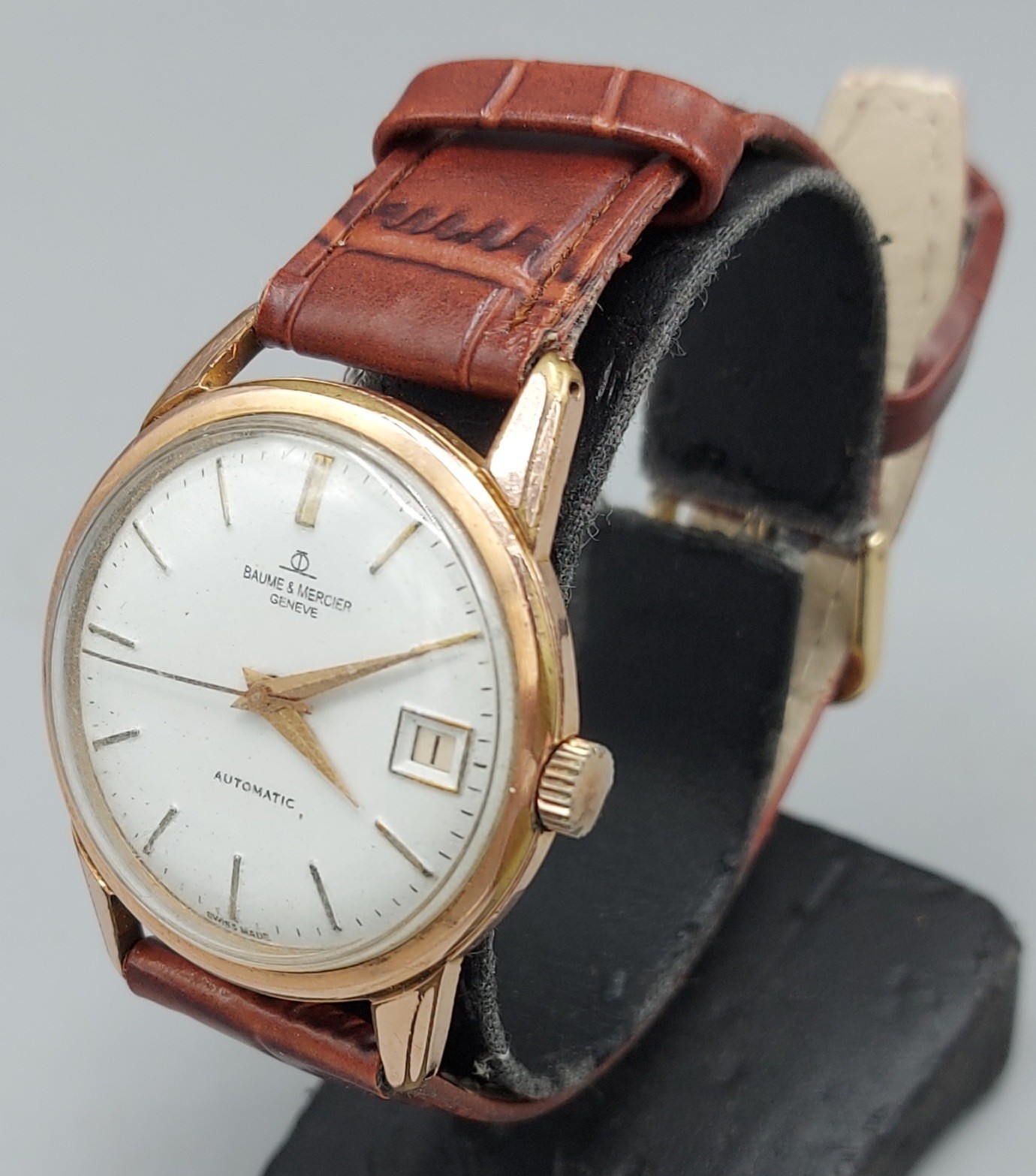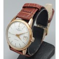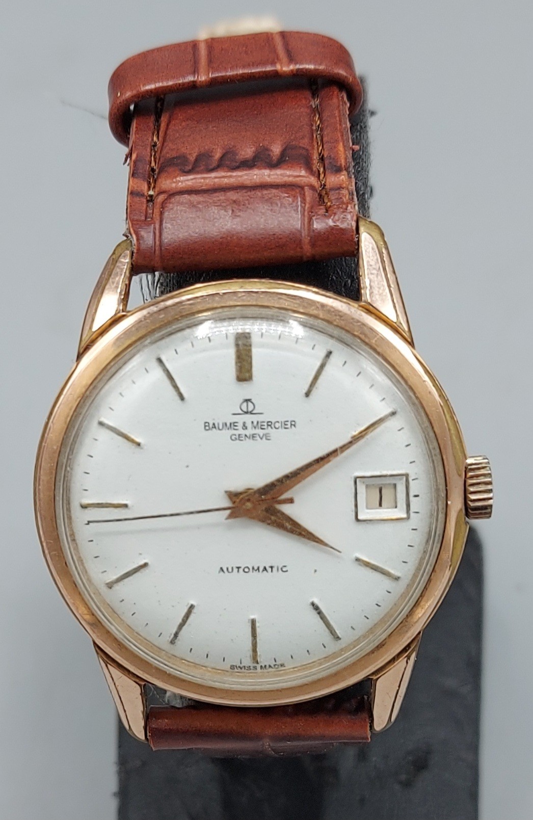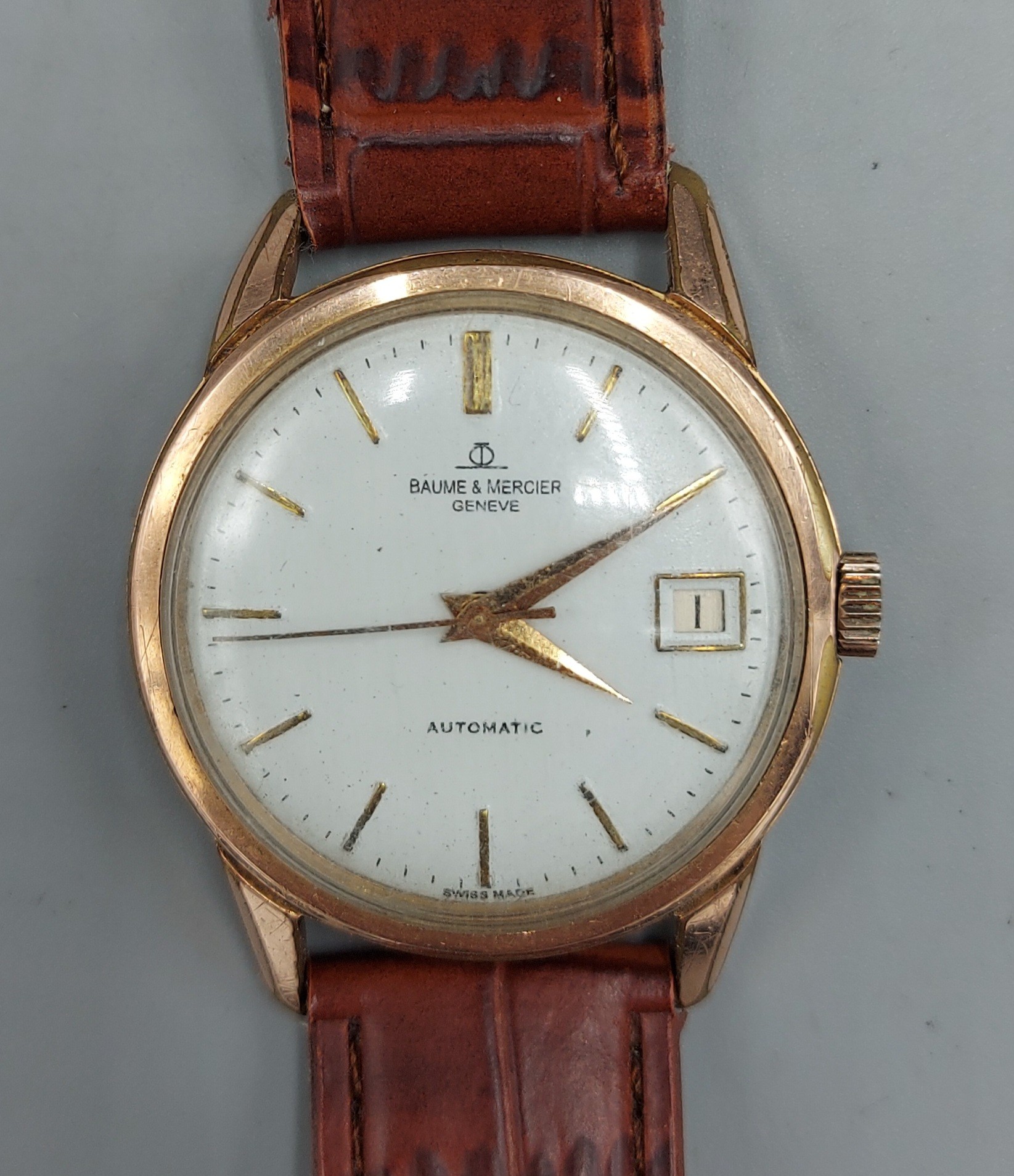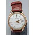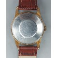 A gold plated gentlemans wristwatch by Baume and Mercier with leather strap