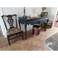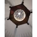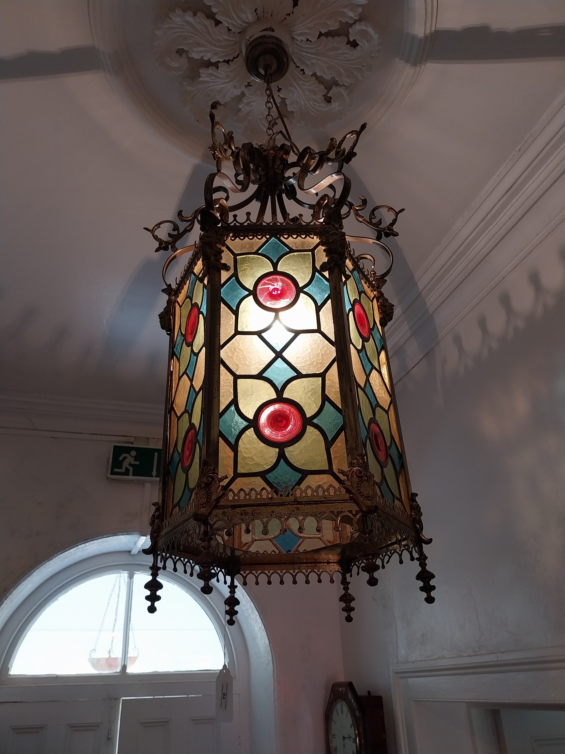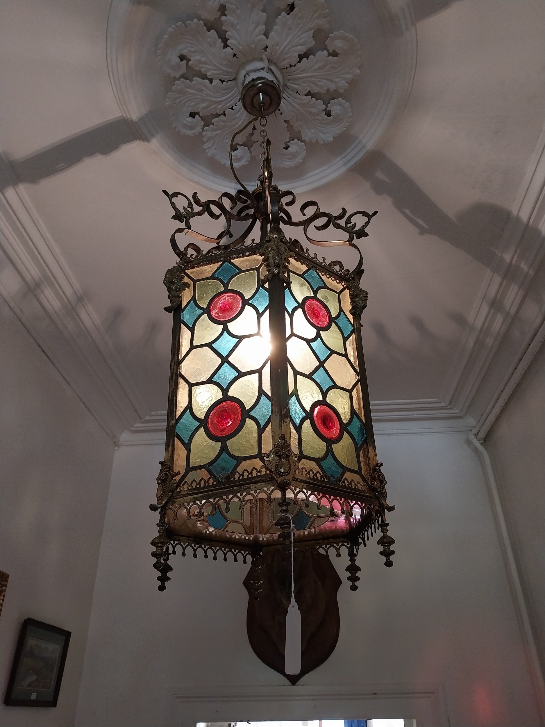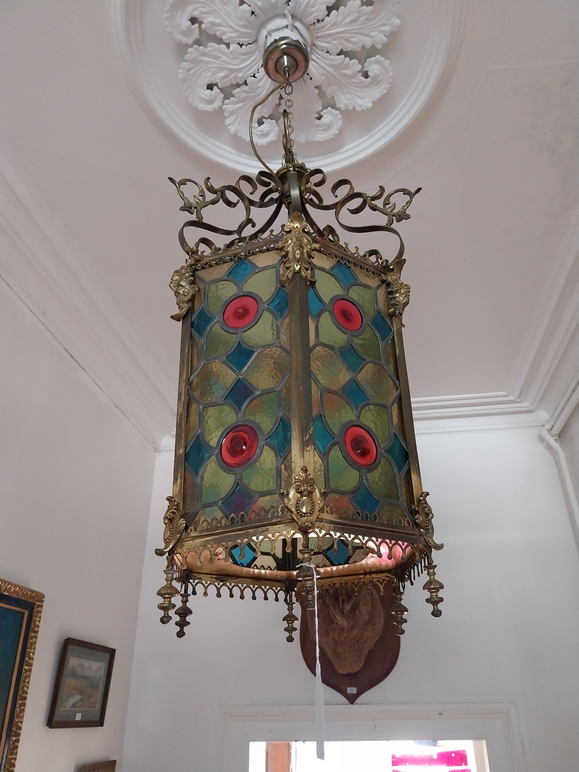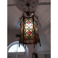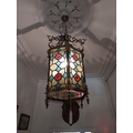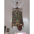 19th. C. gilded brass and stained glass hall lantern { 87cm H X 39cm Dia }.