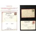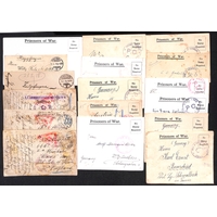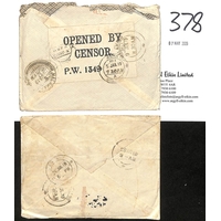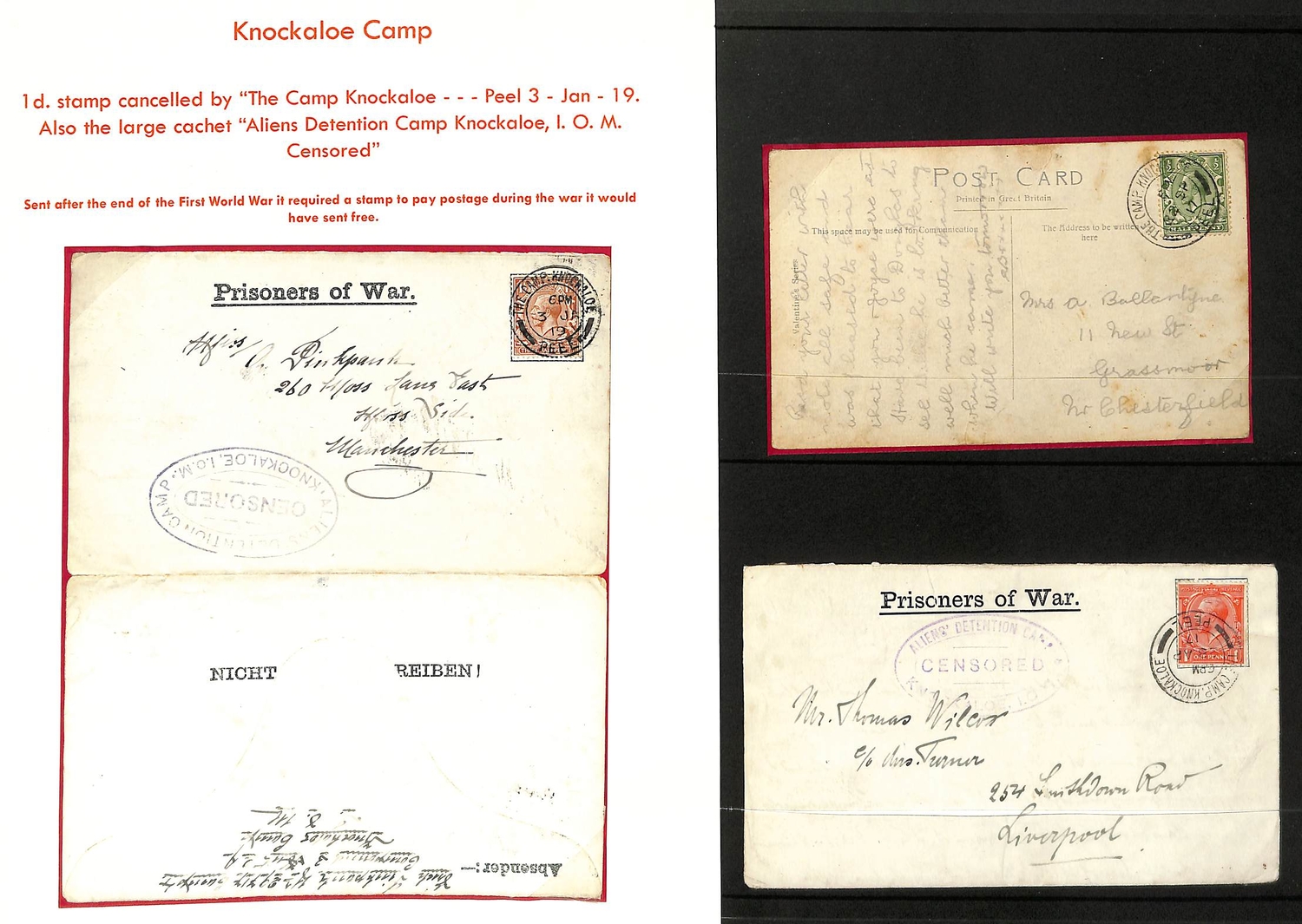 Isle of Man - Knockaloe. 1917-19 P.O.W Lettersheets franked 1d or 1½d both with differing oval "ALIENS DETENTION CAMP / CENSORED / KNOCKALOE, I.O.M" cachets, and a picture postcard of Douglas franked ½d, probably from a camp guard, all three cancelled double ring "THE CAMP, KNOCKALOE / PEEL" c.d.s. (3).