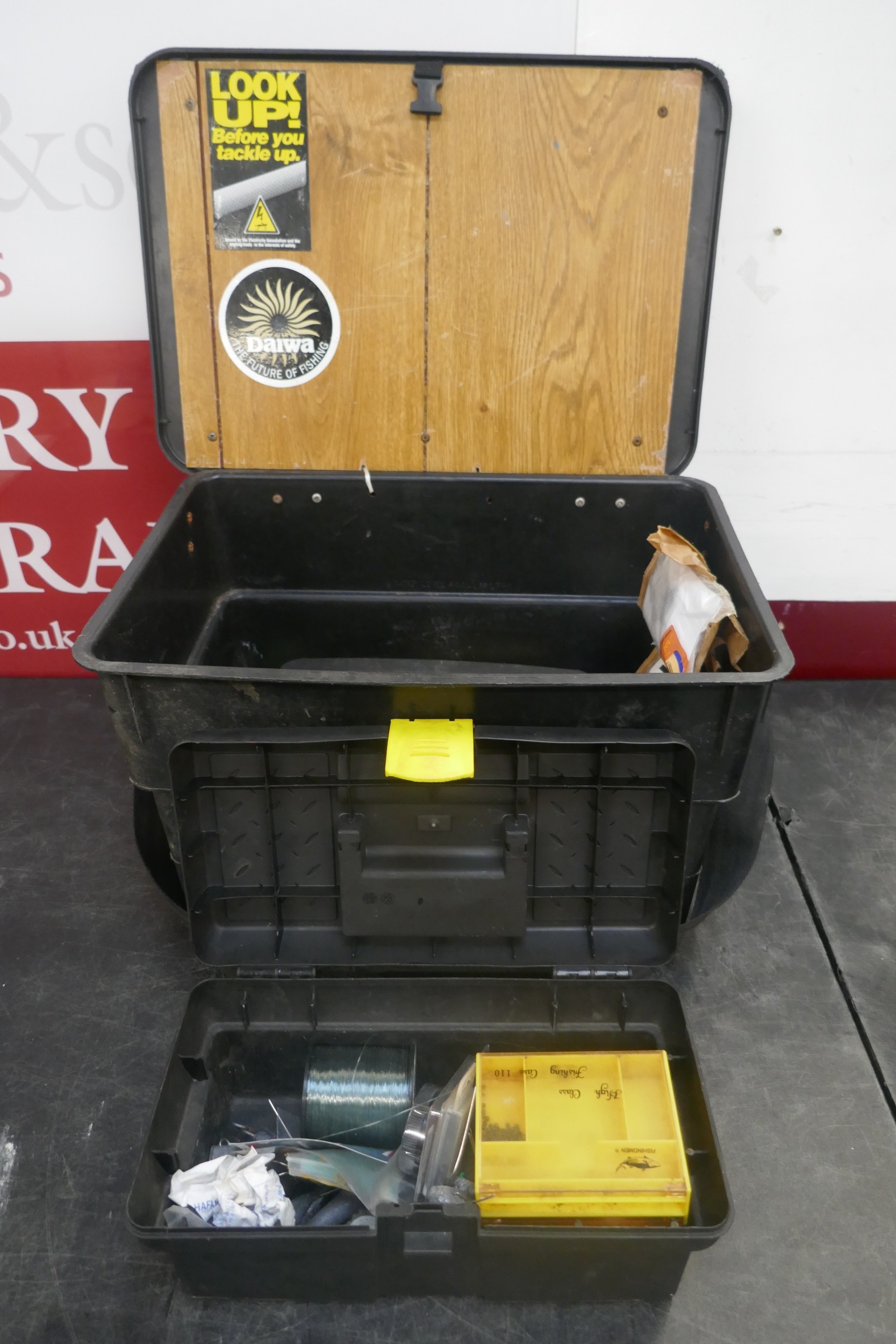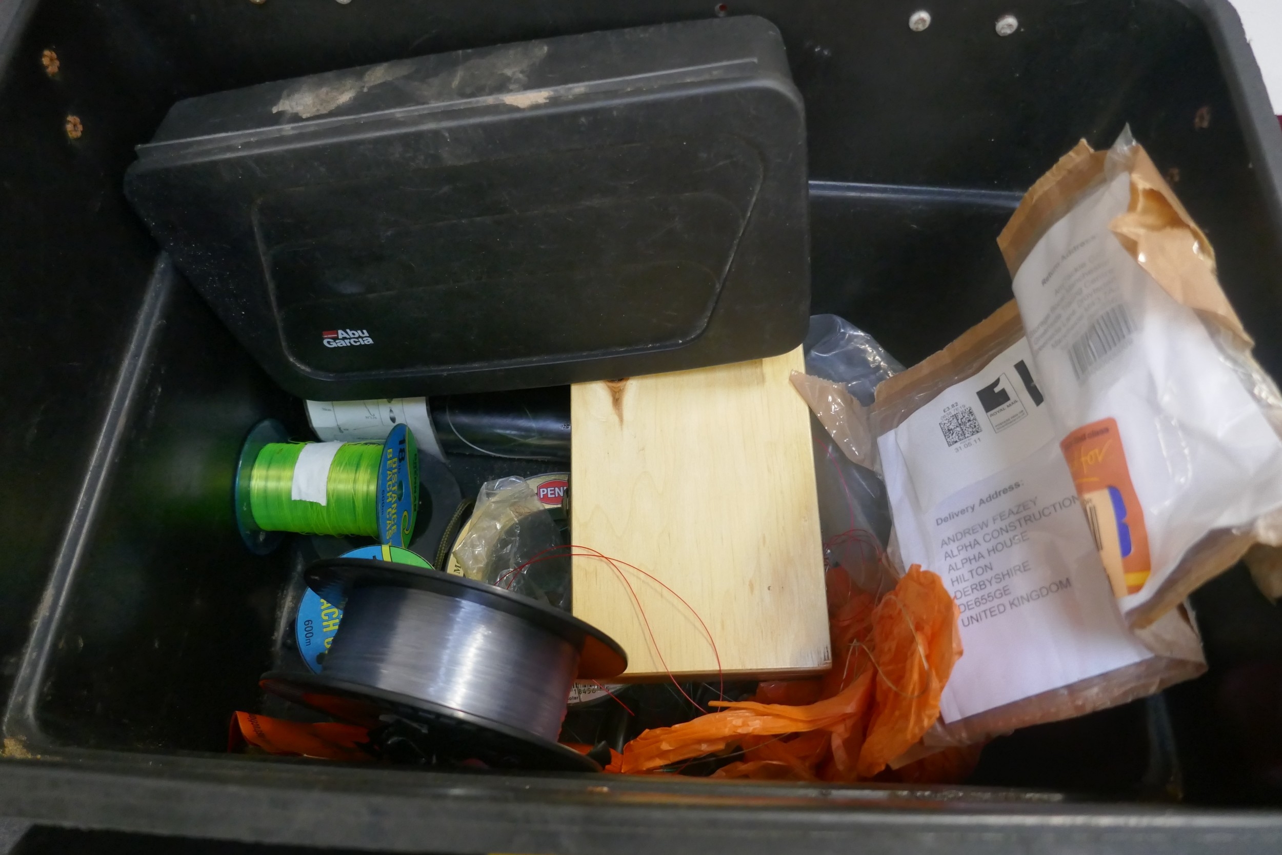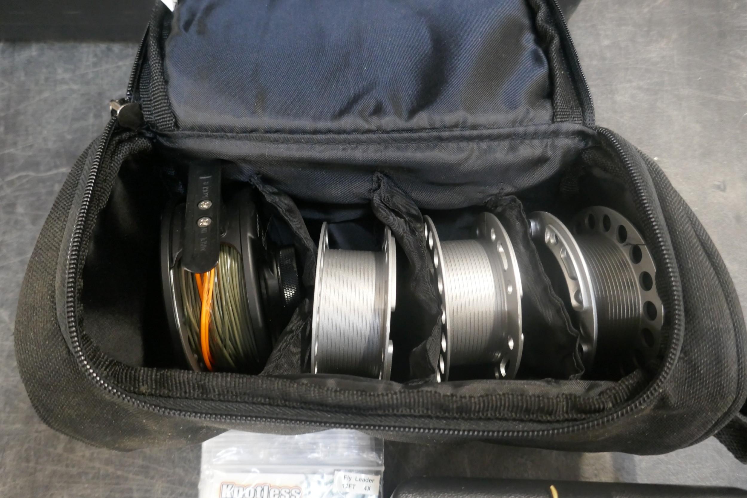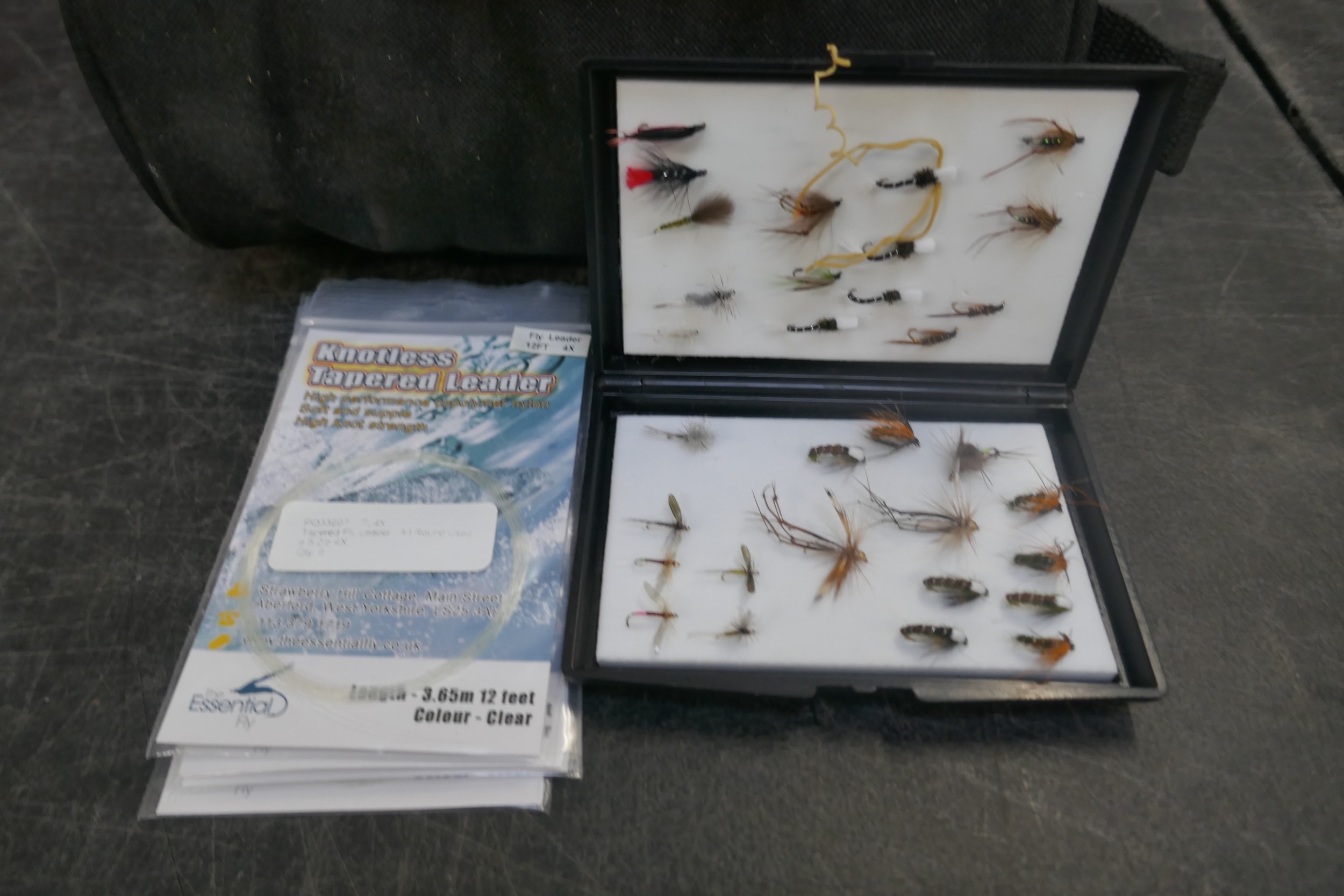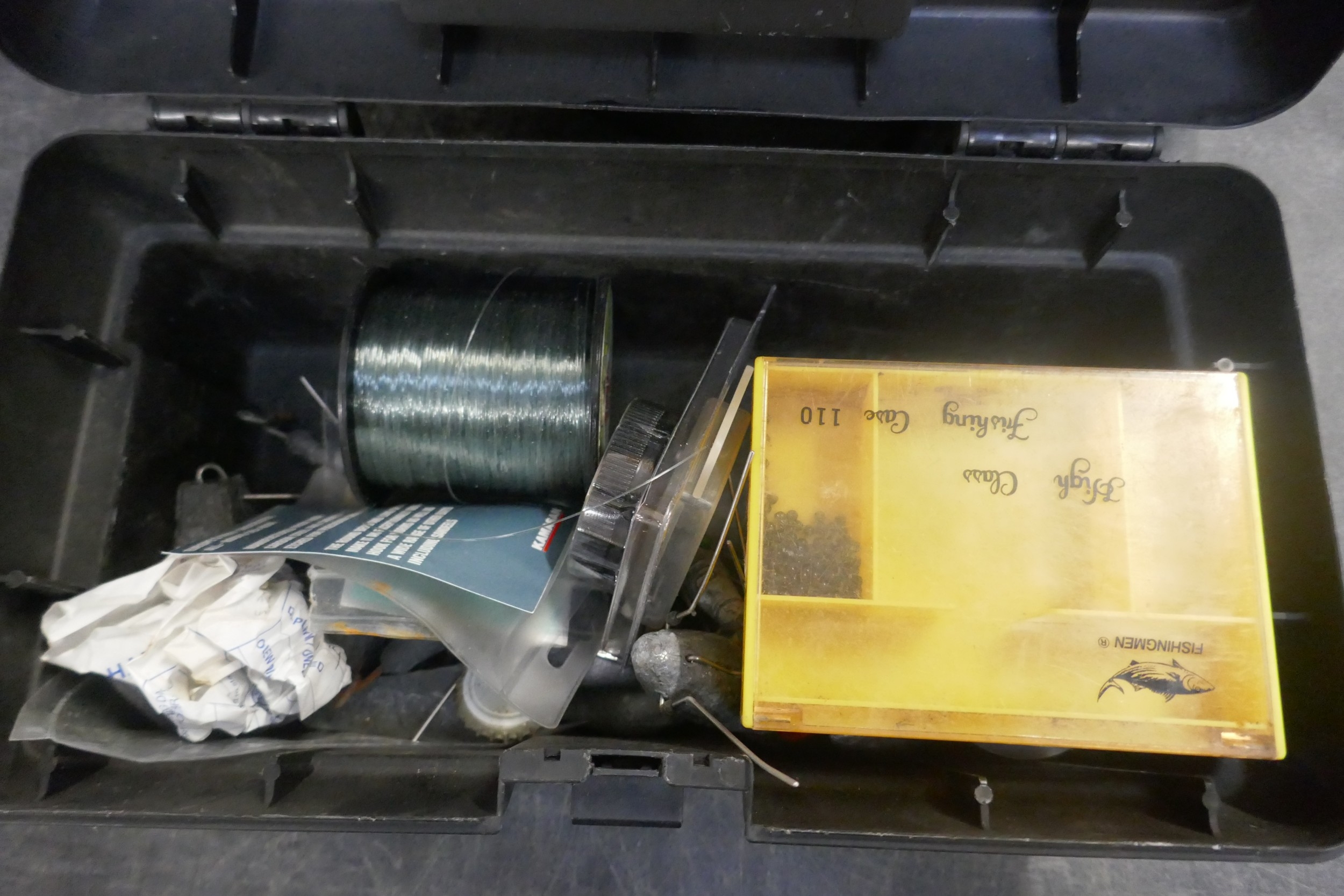 A quantity of assorted fishing items including rods, reels, knotless tapered leader nylon knots, tackle box, etc.