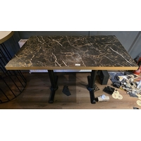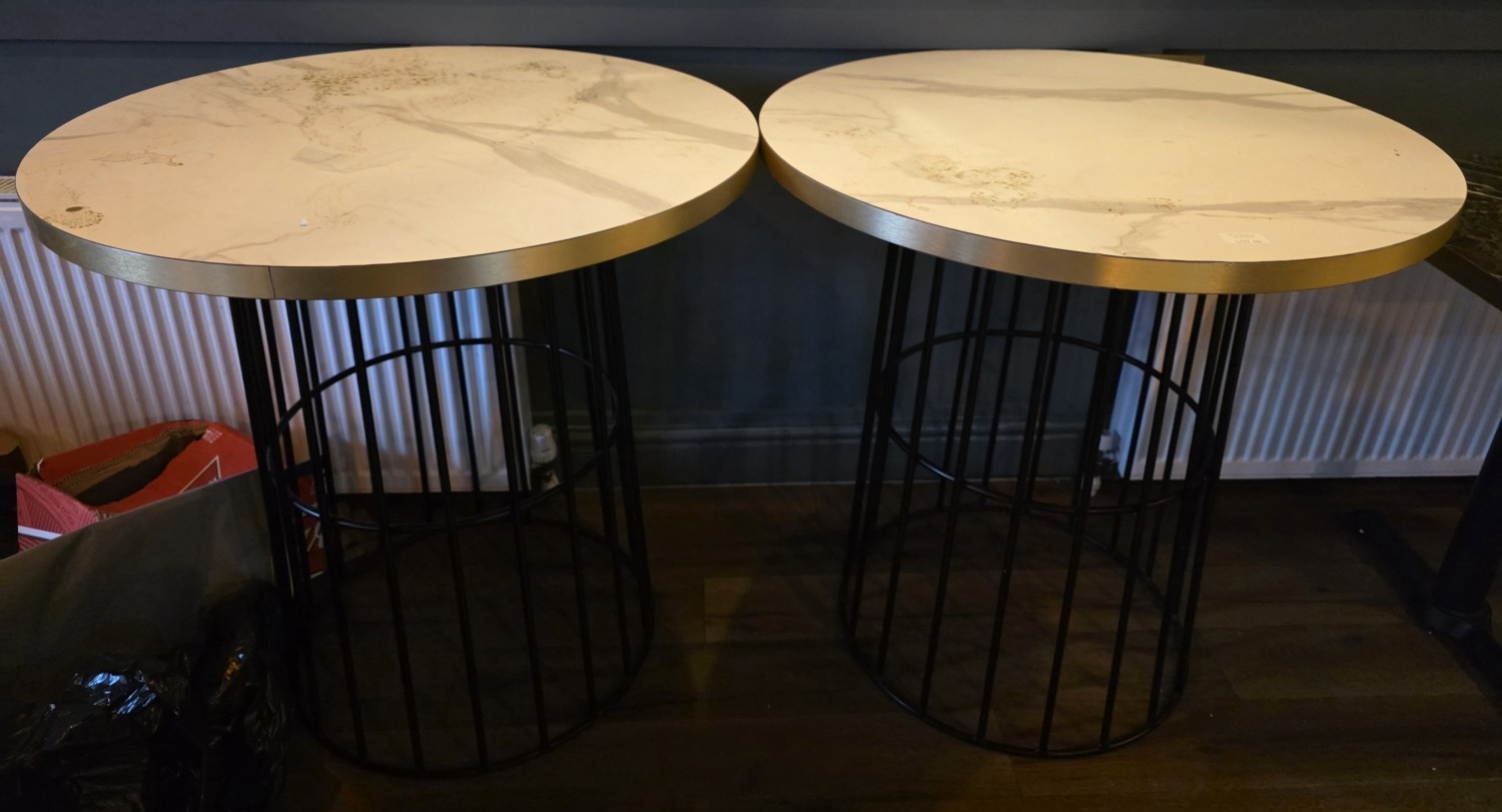 Two circular topped "Stand-at" bar tables, both with heavy metal bases (2)