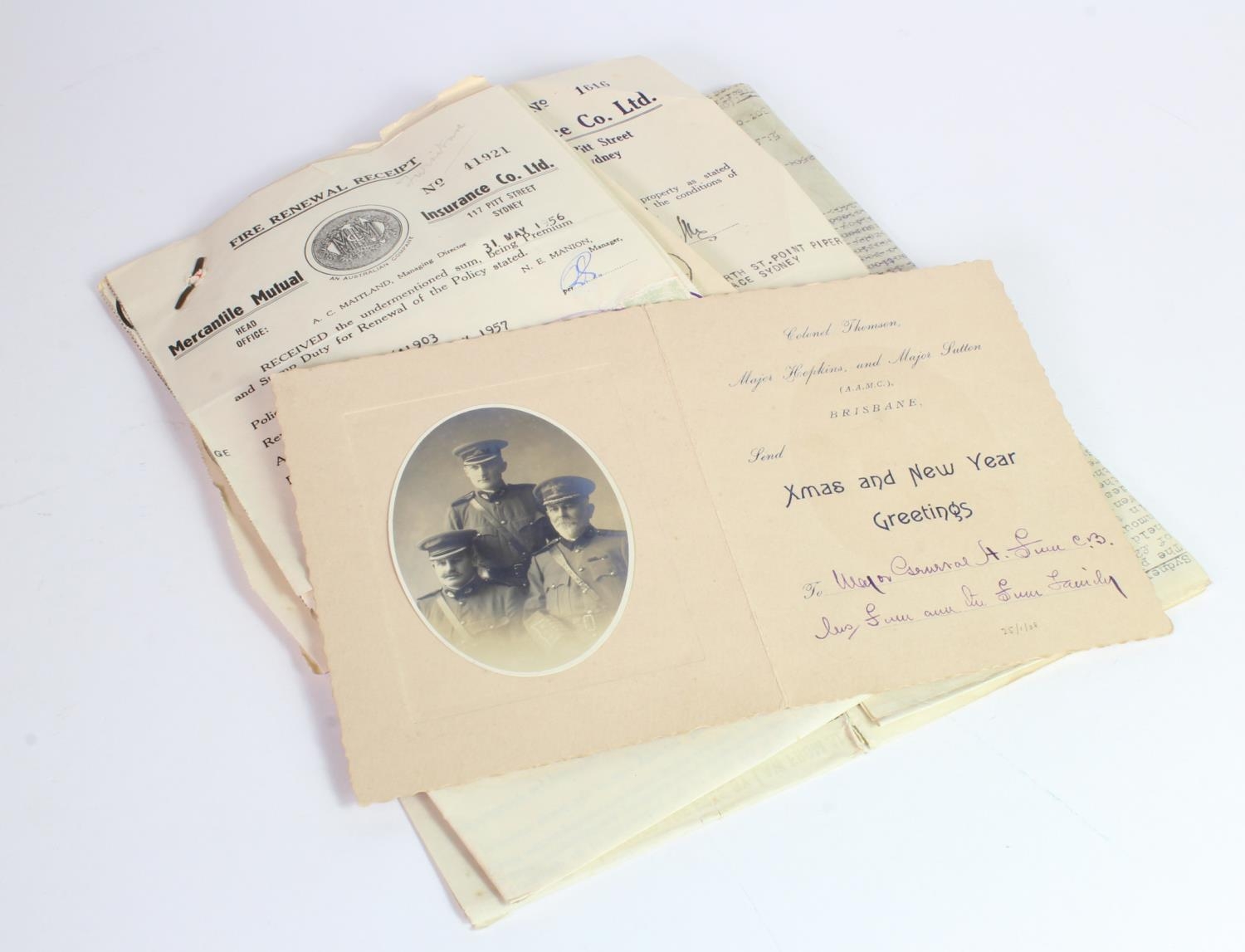 Australian Army Medical Corps - a superb Xmas & New Year Card from Col Thomson, Major Hopkins and Major Sutton, to Major General H Finn CB. With various original Insurance Documents named to General Harry Finn.. (qty)