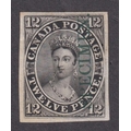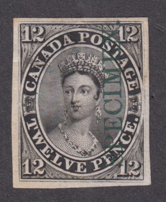 1851 12d black Plate Proof imperforate on India paper o/pt Specimen (vertically) in green. Some thinning (as is often the case as these were mostly affixed to card), attractive and scarce. Cat (Unitrade) $6500 Canadian. Unitrade 3piii.