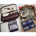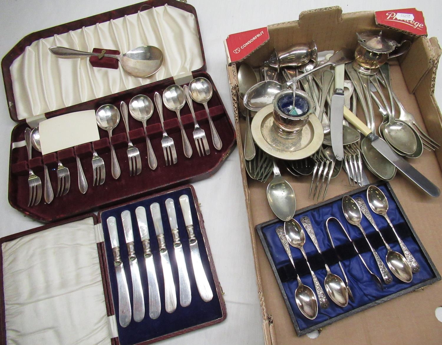 Selection of various silver plated cutlery, cruet set, dessert spoon & fork set etc.