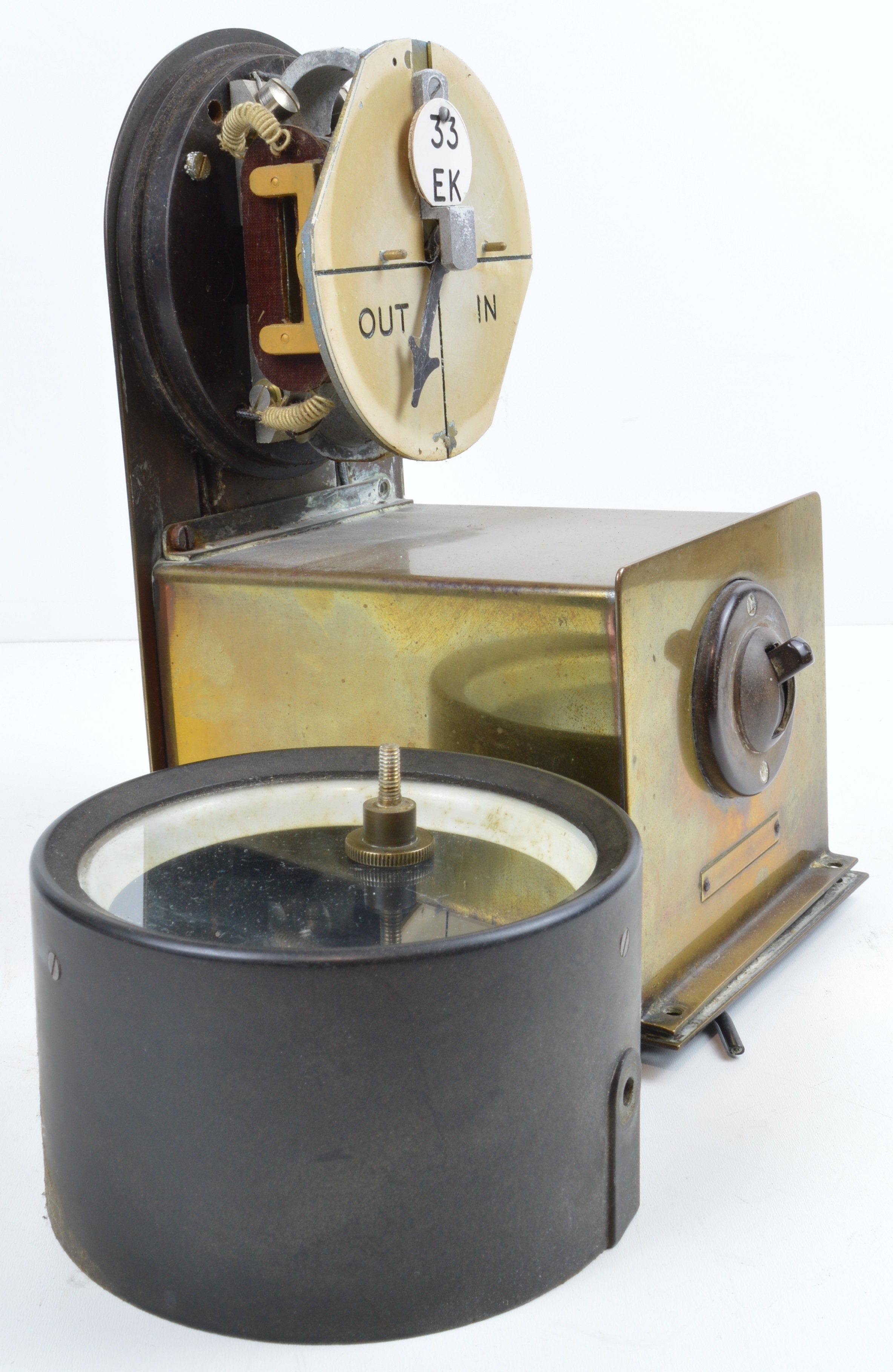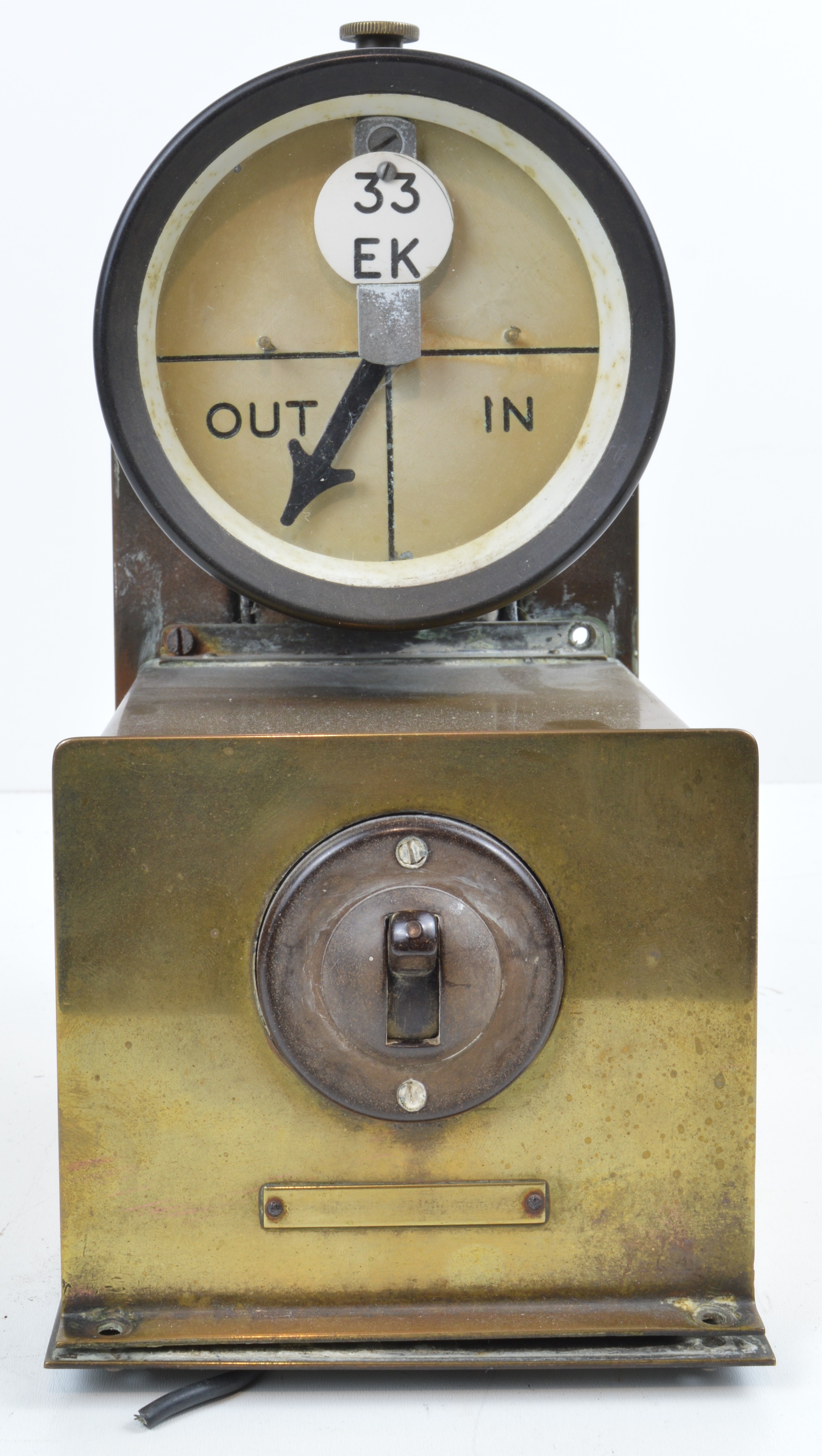Bakelite and brass cased switched signal box OUT IN (Power)indicator. Ex box condition, needle moves freely. Some case screws missing, 9 inches tall. Shipping band - C.