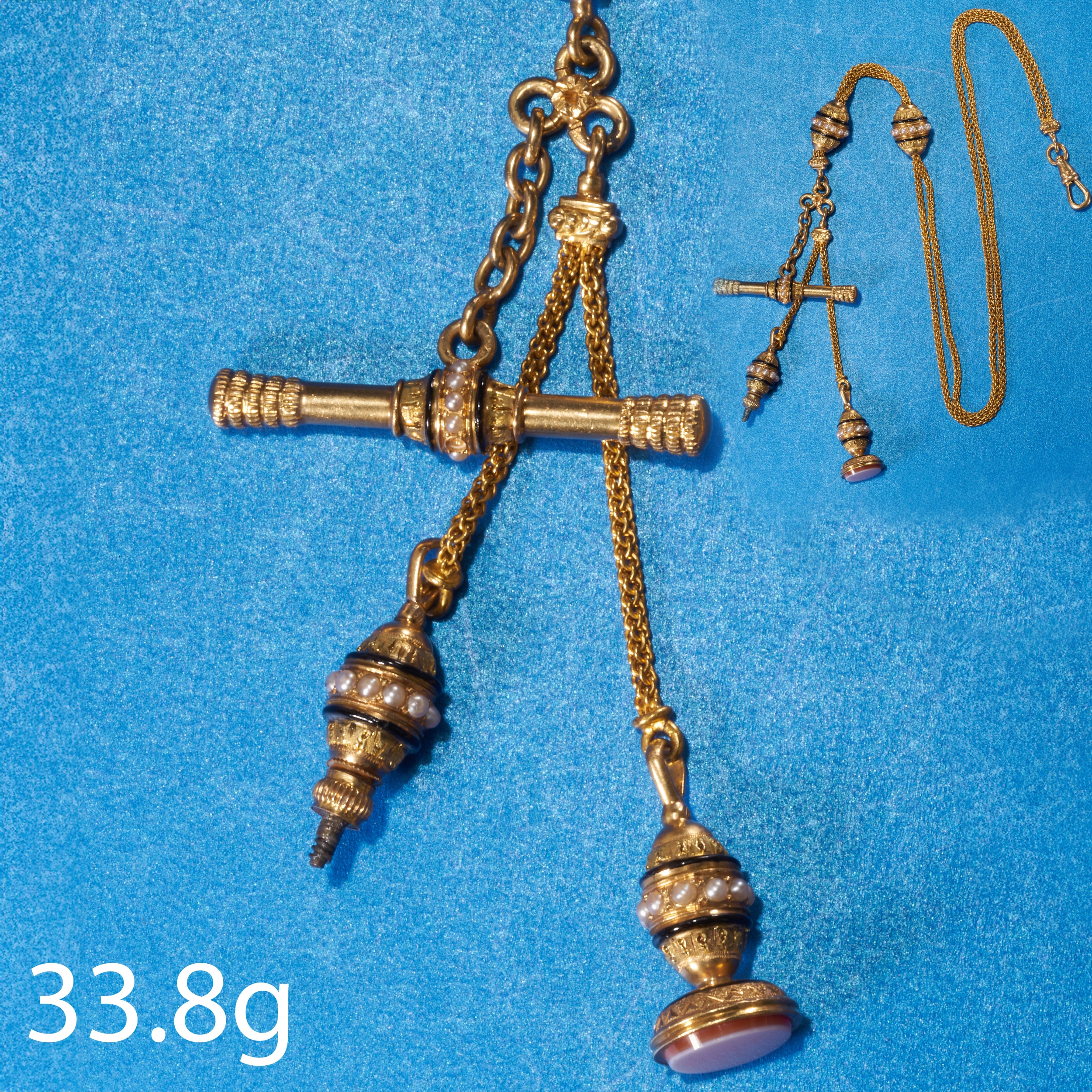 Fobs and Albert with enamel and pearls.