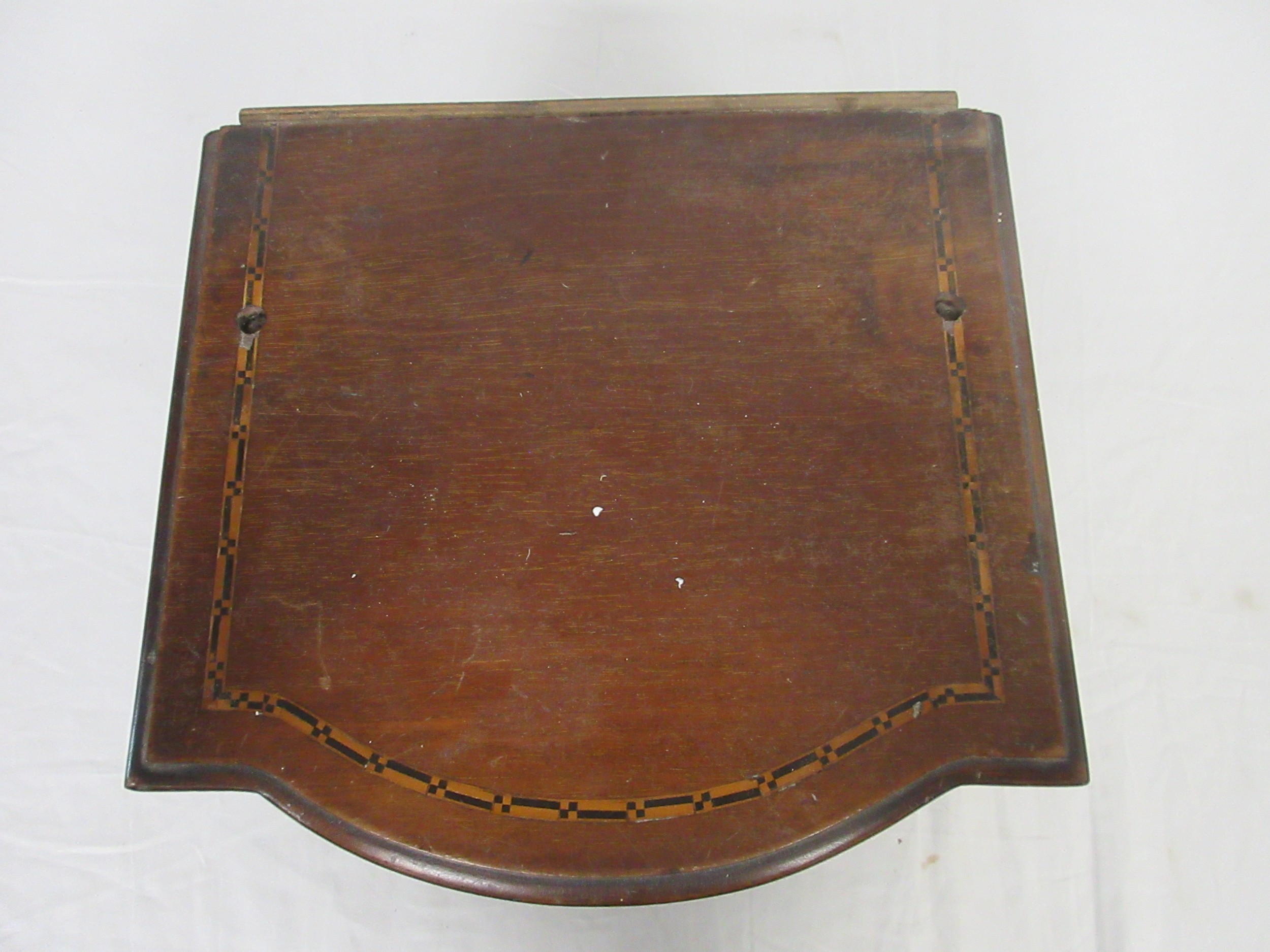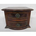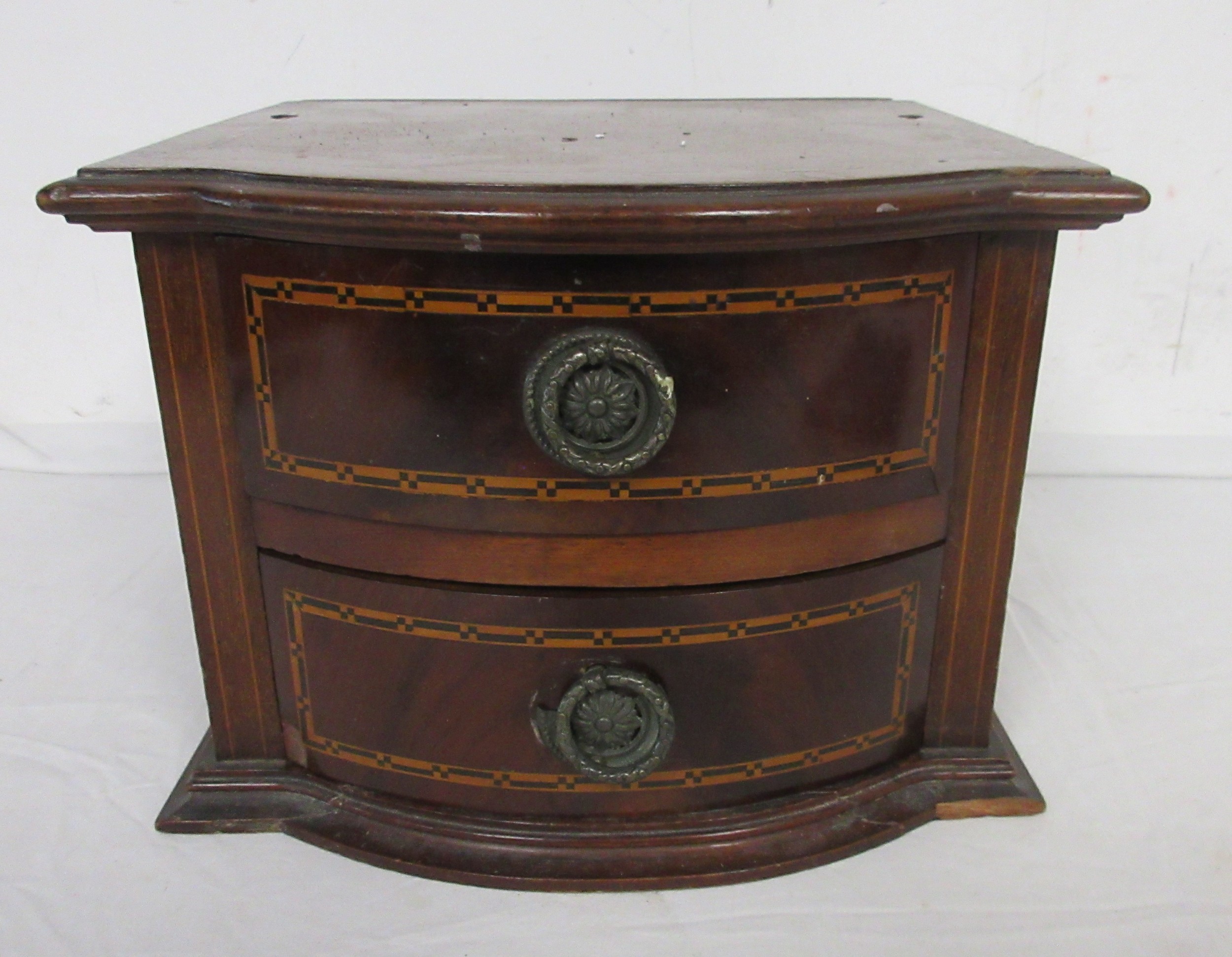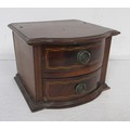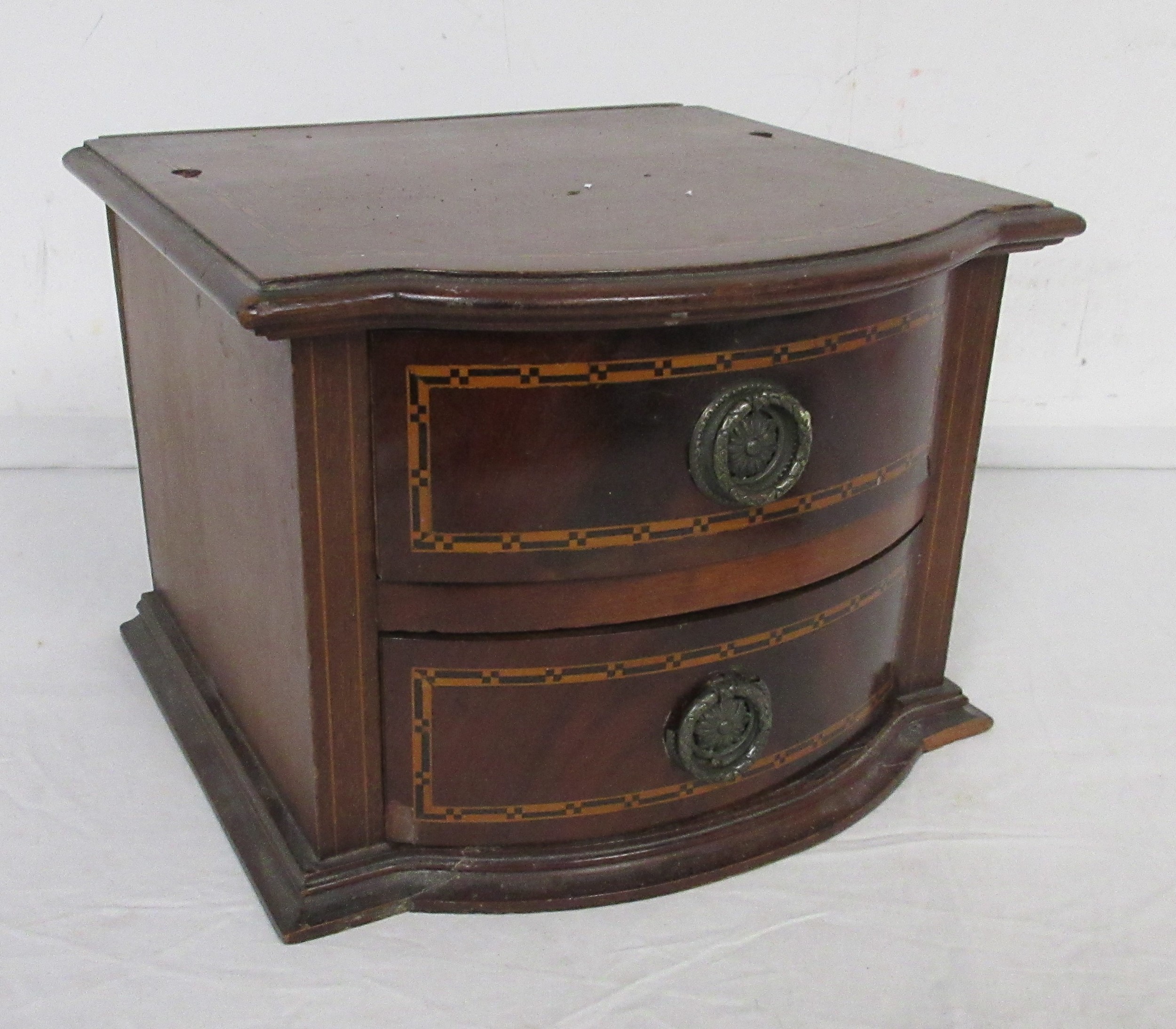 A tabletop bow front chest of two drawers, mahogany with ebony and boxwood stringing, height approx. 20cm. Some a/f chips and marks, the top is drilled with two holes which perhaps once supported a mirror
