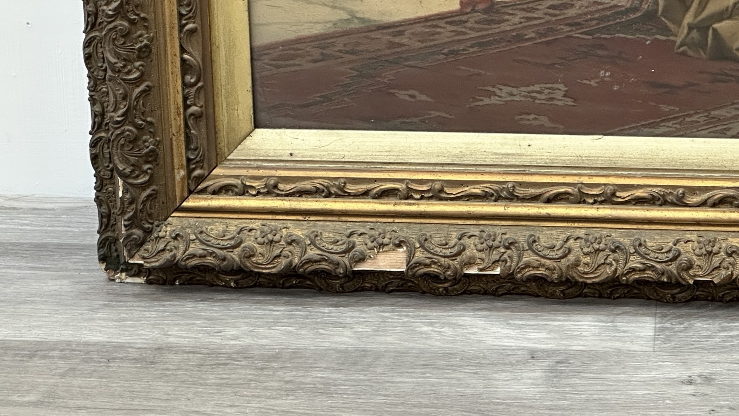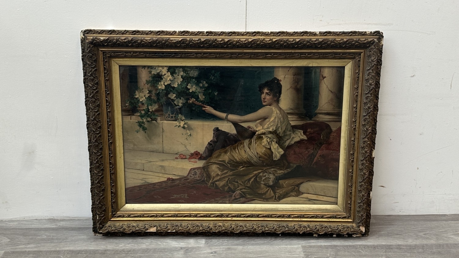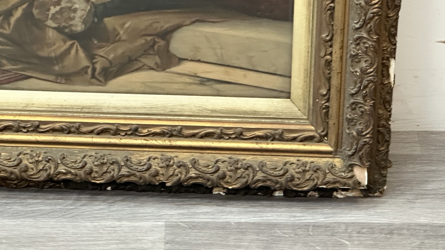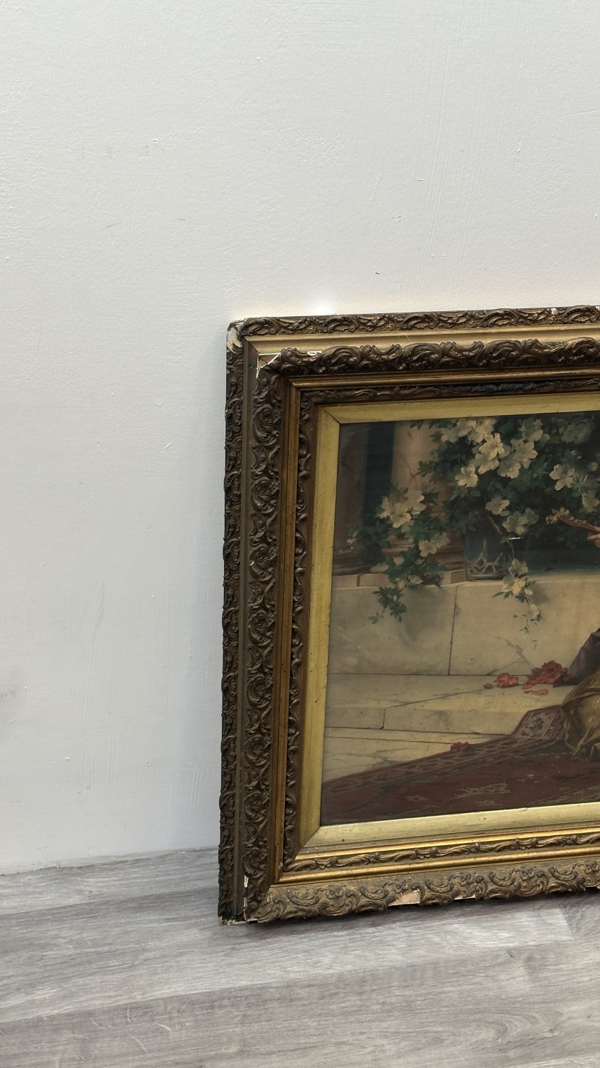 The frame is in need of restoration, various chips and losses can be seen and the reverse needs attention to wooden panelling.