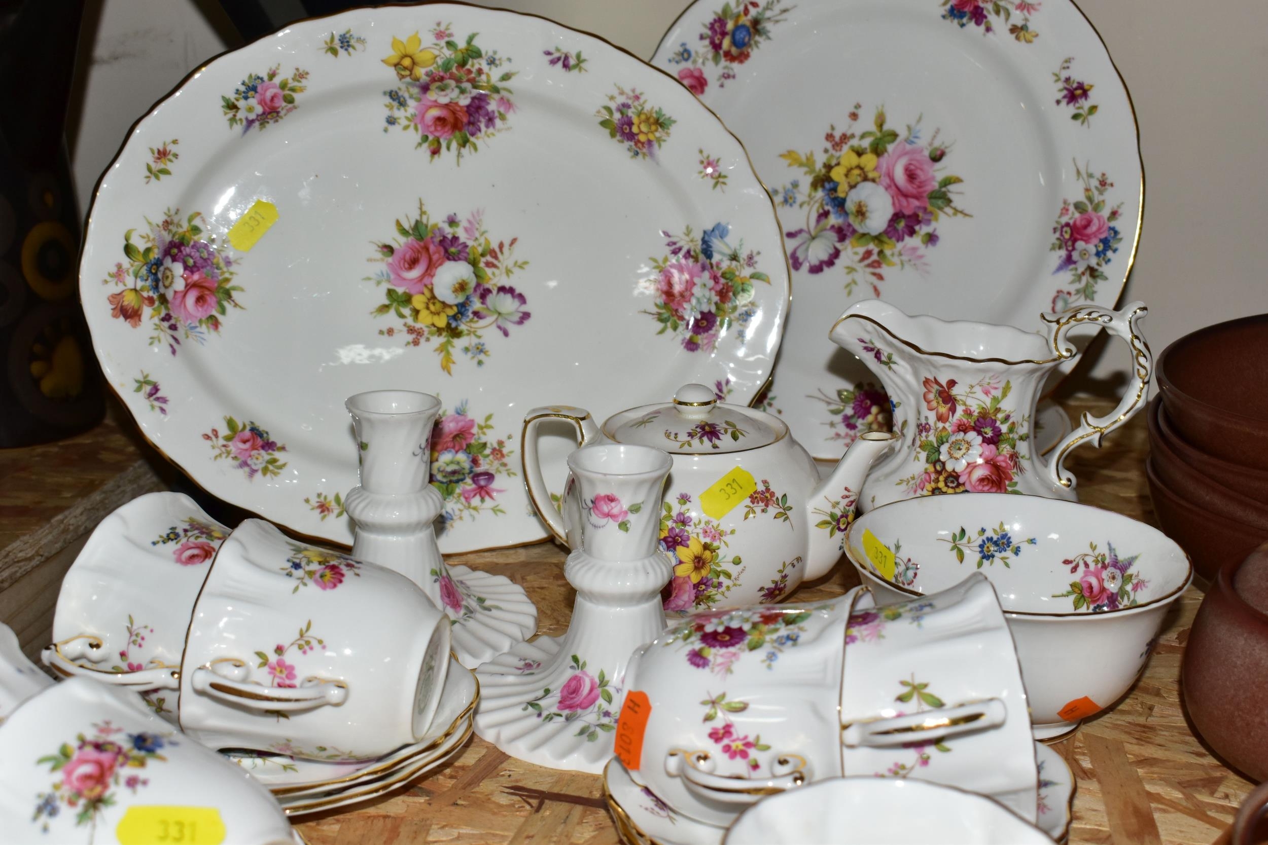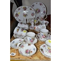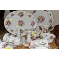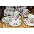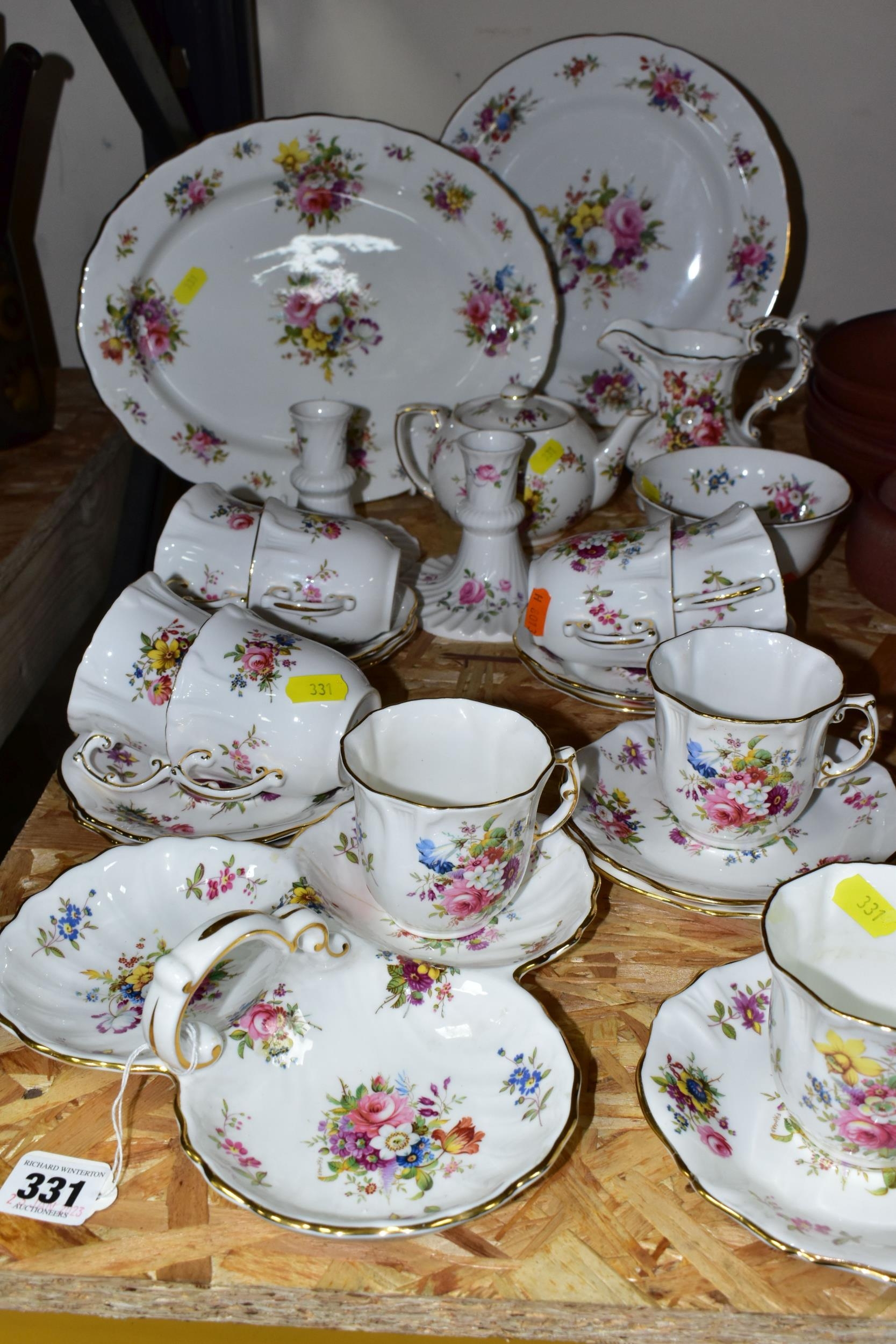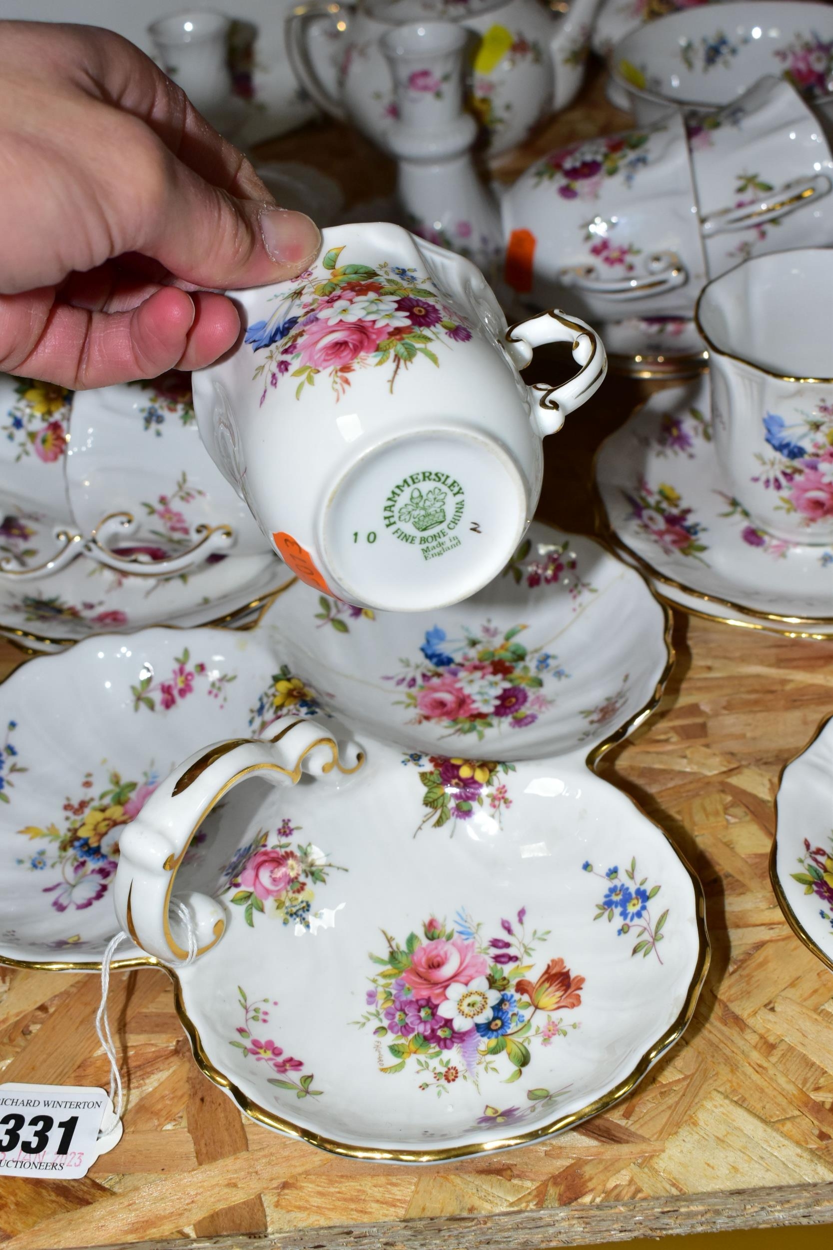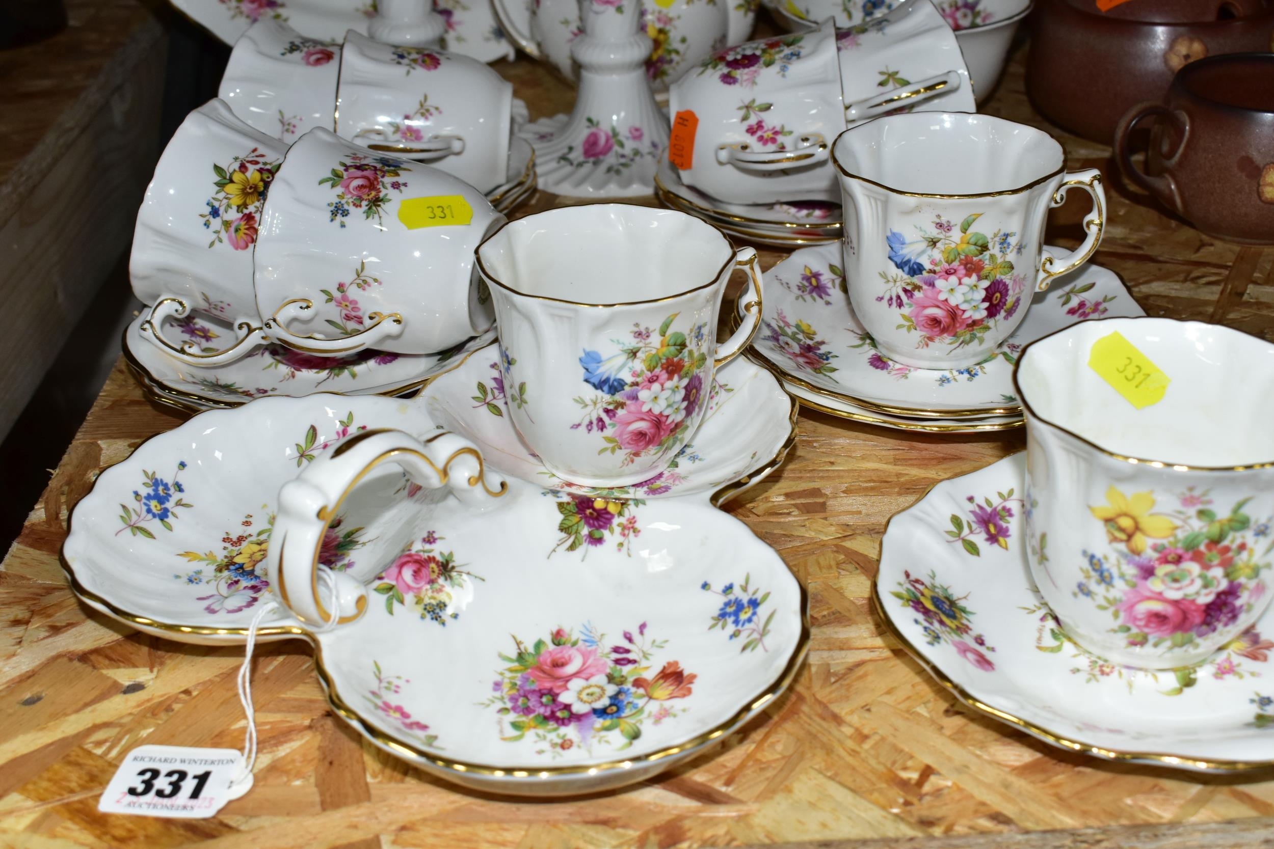A HAMMERSLEY DRESDEN FLORAL SPRAYS & GOLD 'EILEEN' PATTERN TEA SET, comprising a trefoil dish (broken and glued), two candle sticks, milk jug, sugar bowl, small tea pot (glued crack in the base and crazing), an ovel cake plate, three circular cake plates, nine cups, nine saucers (28) (Condition report: obvious damage is mentioned in description, most pieces have slight marks to gilding, light use, would benefit from a clean)