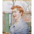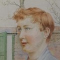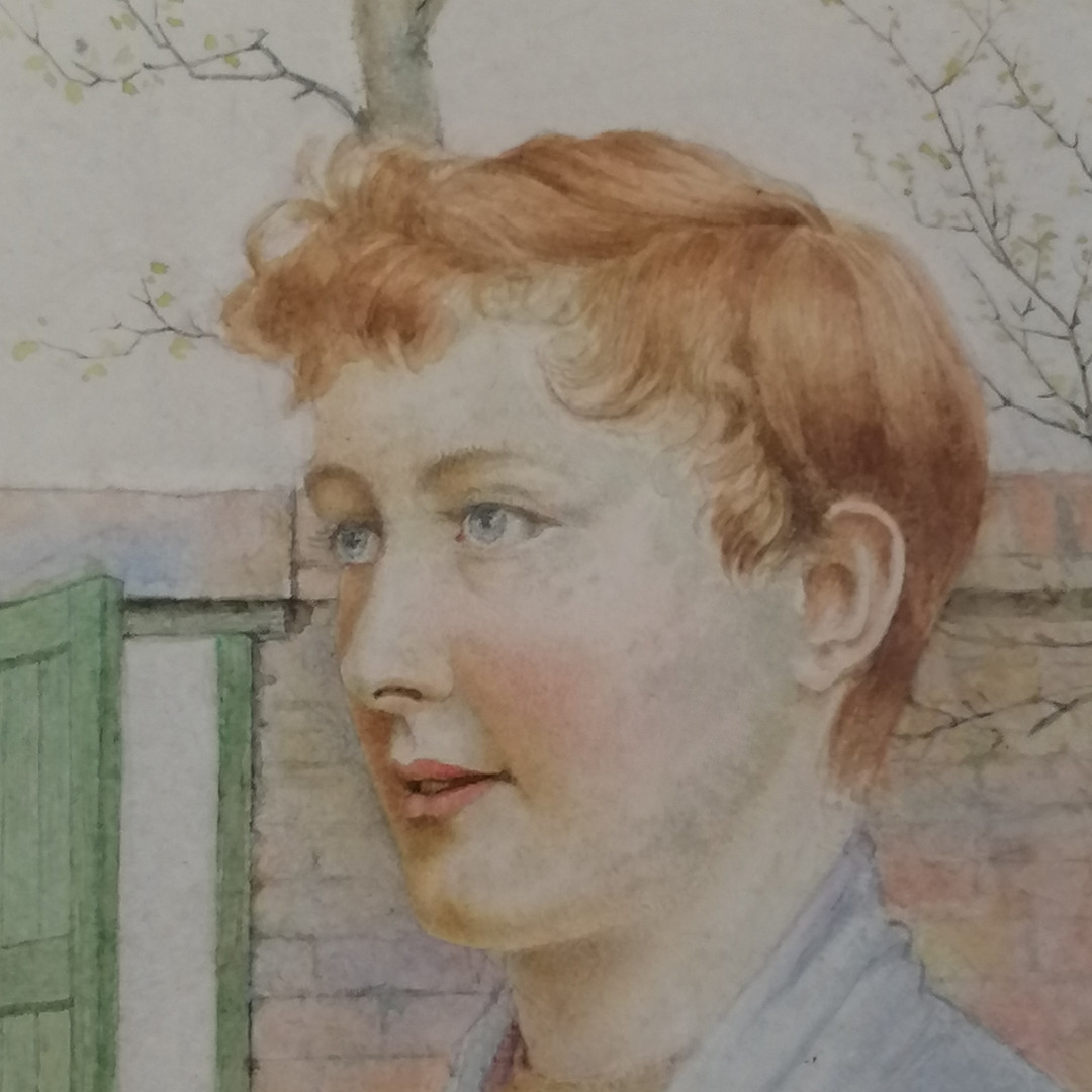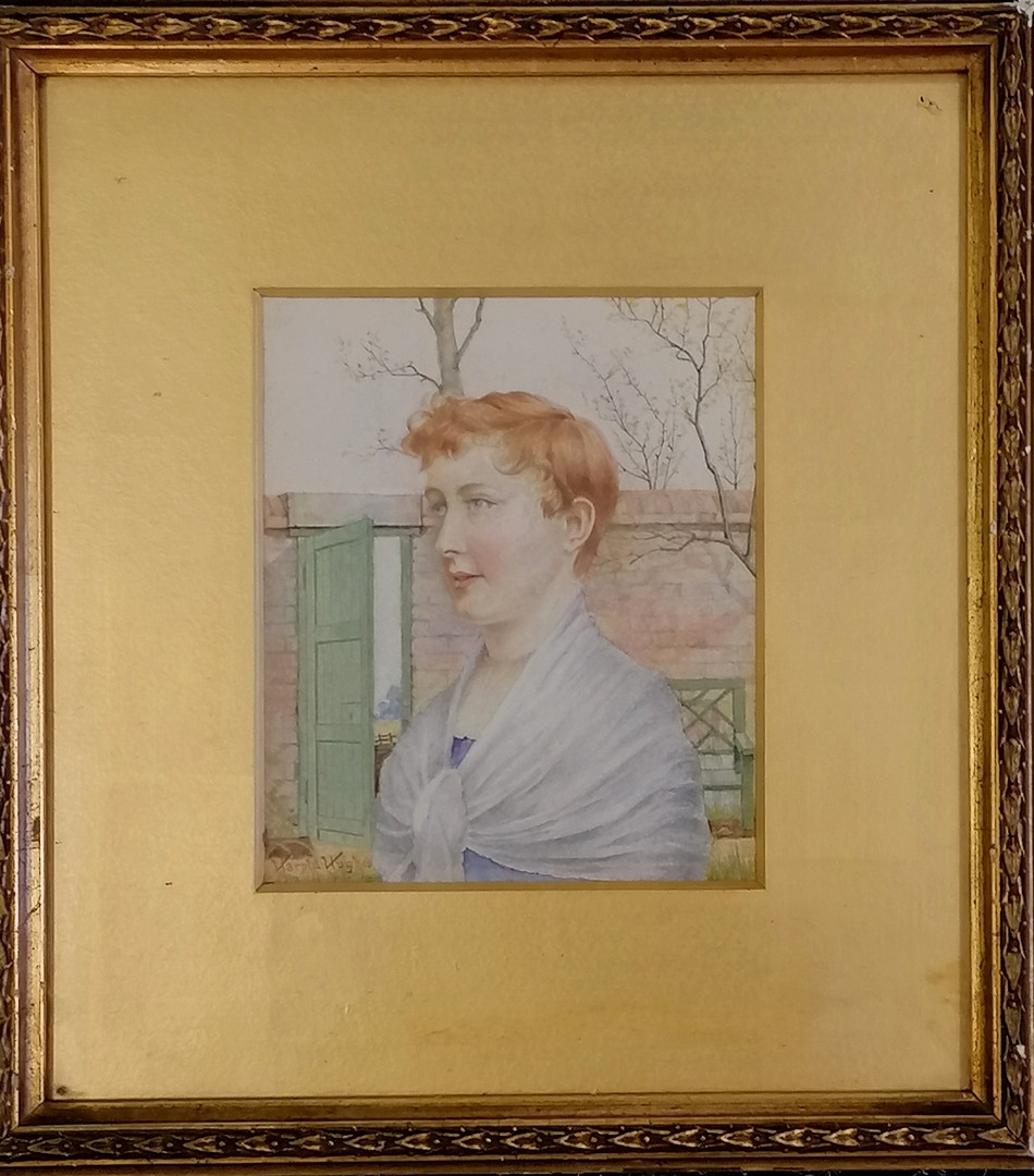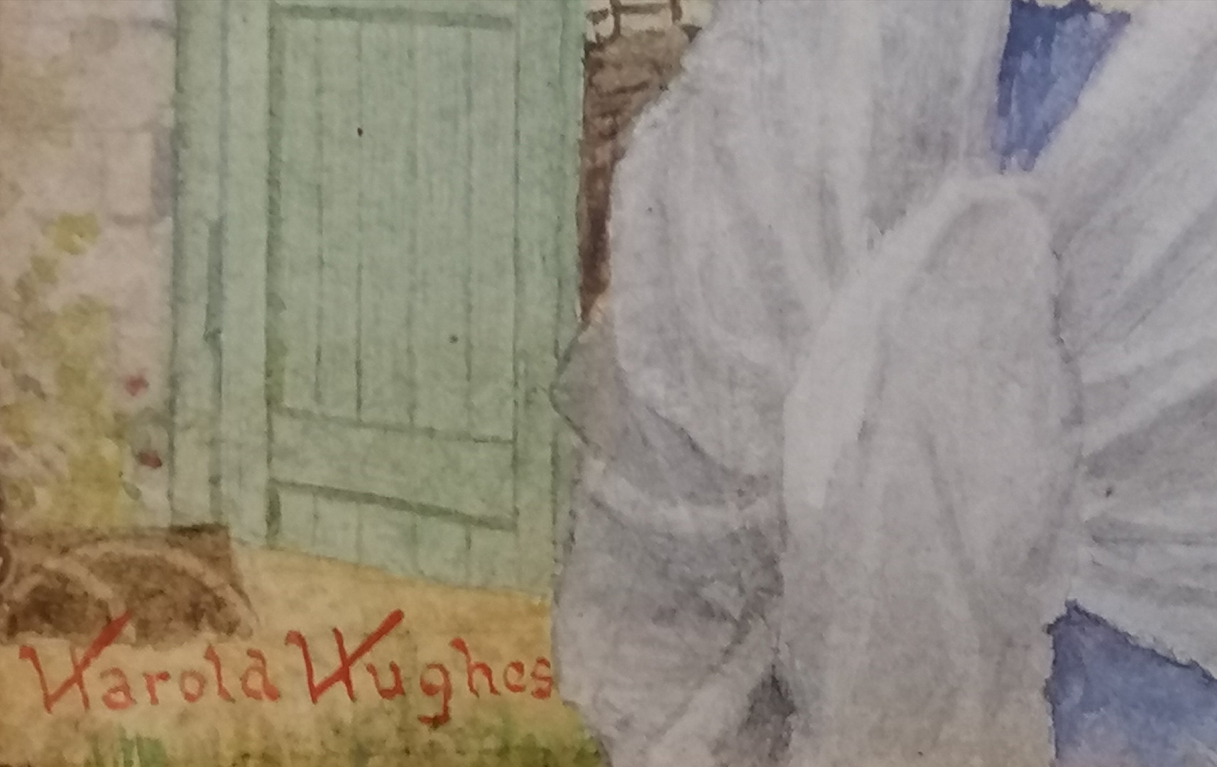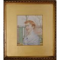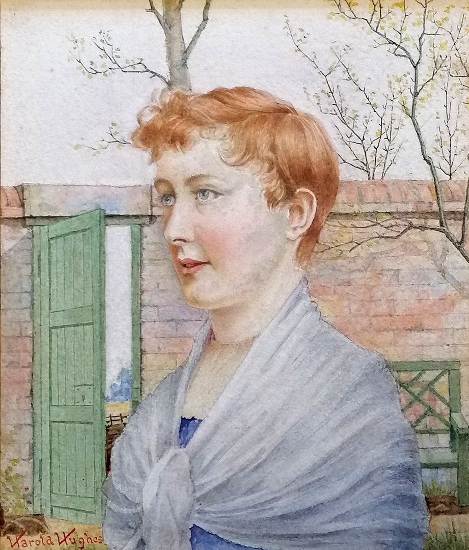 Harold Hughes watercolour painting of a girl by a garden wall - frame 28cm x 26cm.