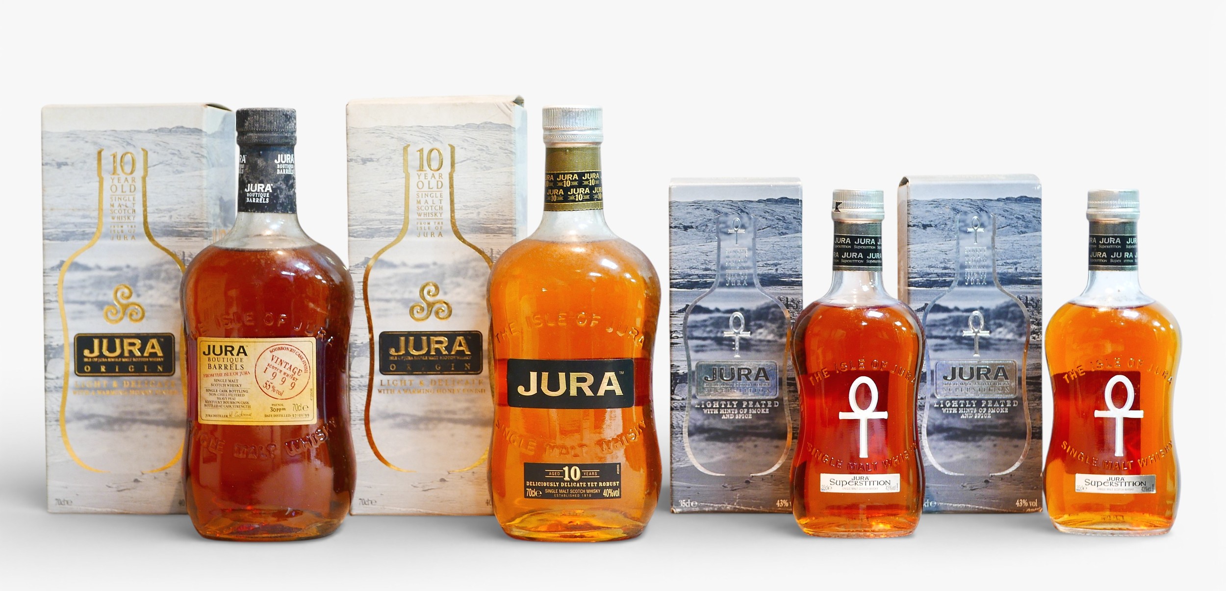 Four bottles of Jura single malt Scotch whisky, comprising two 70cl bottles of 10 year old and two 35cl bottles of Superstition, all with boxes. (4)