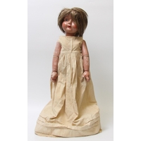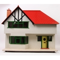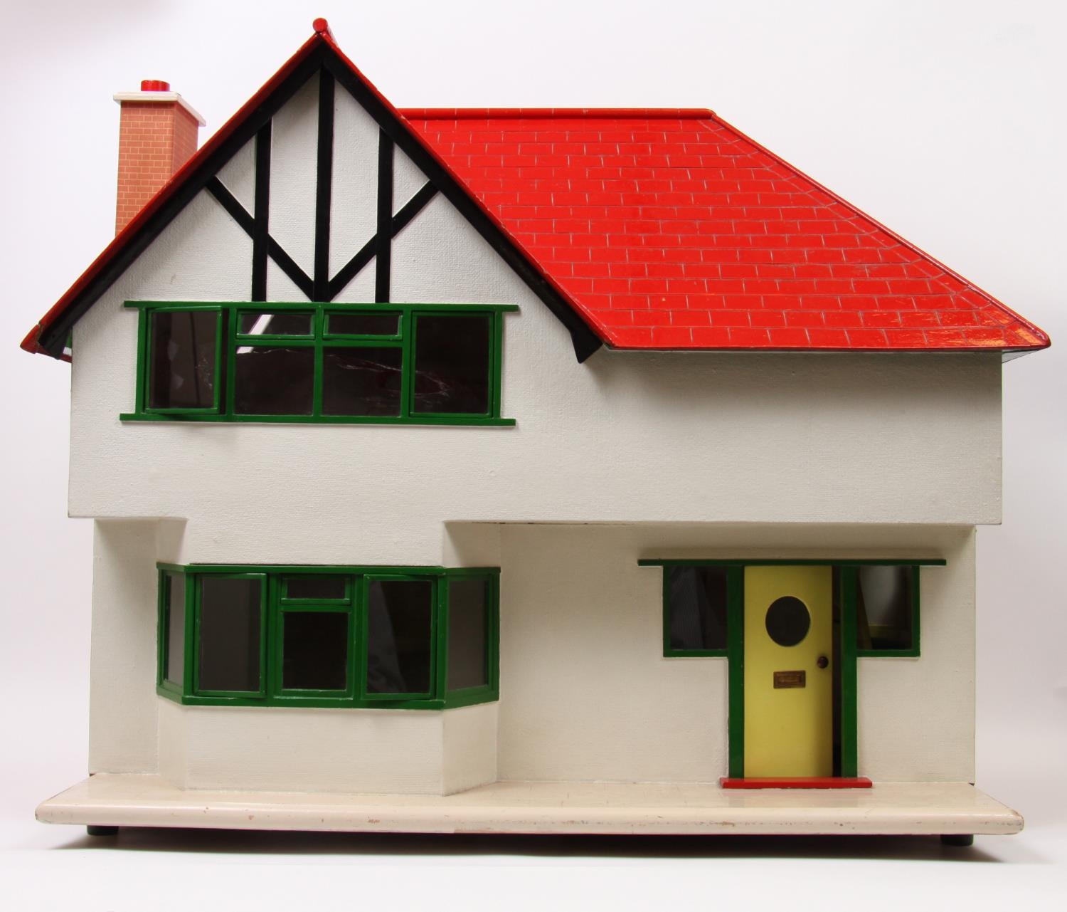 A large hand painted 1940's style dolls house replica of a property in Chaddesden Derby, bright red painted roof, off-set white brick front, green window frames and edges, yellow front door, designed and built by Lesley Olsabrook, partly furnished 85cm wide by 68.5cm high