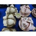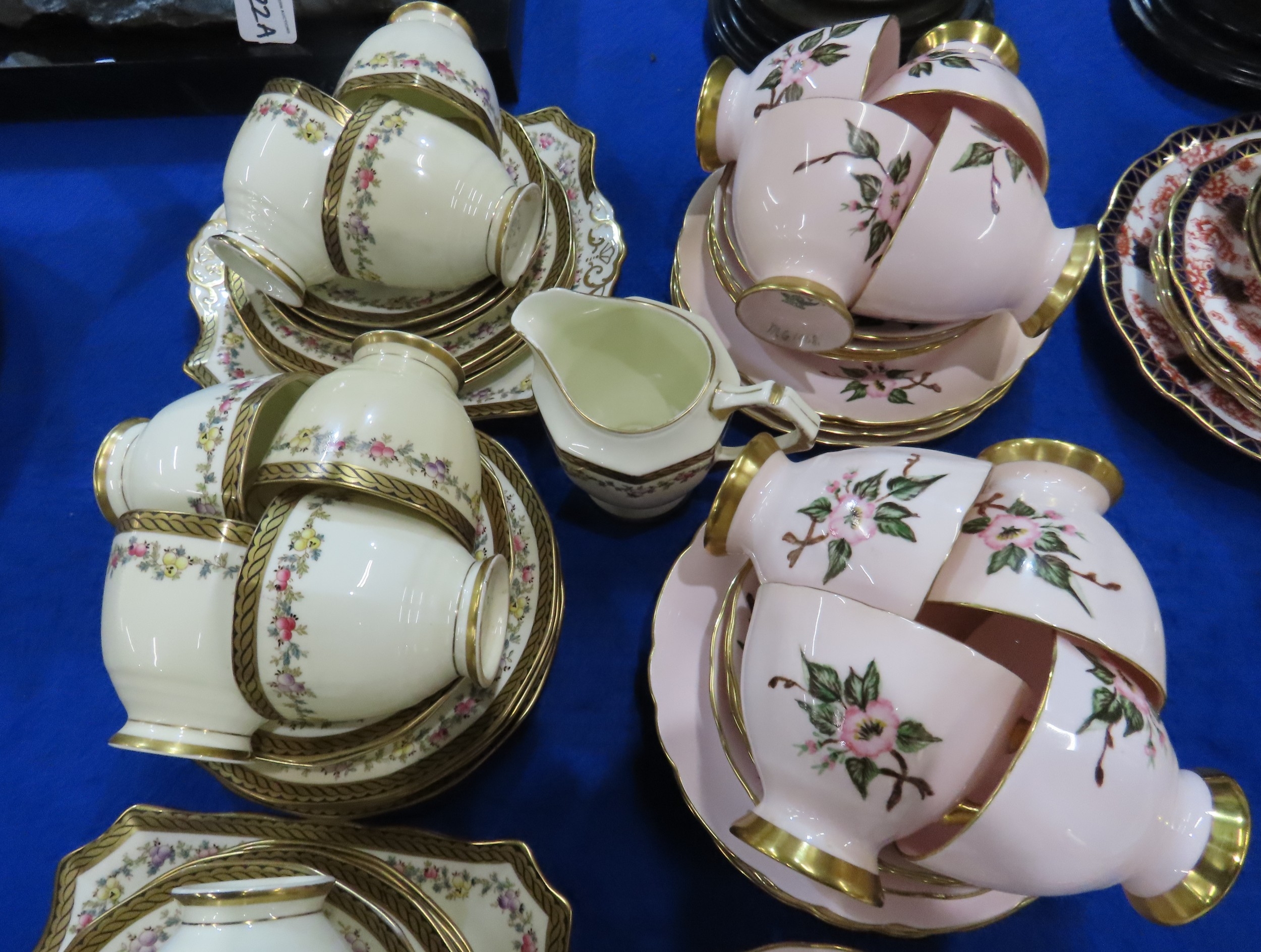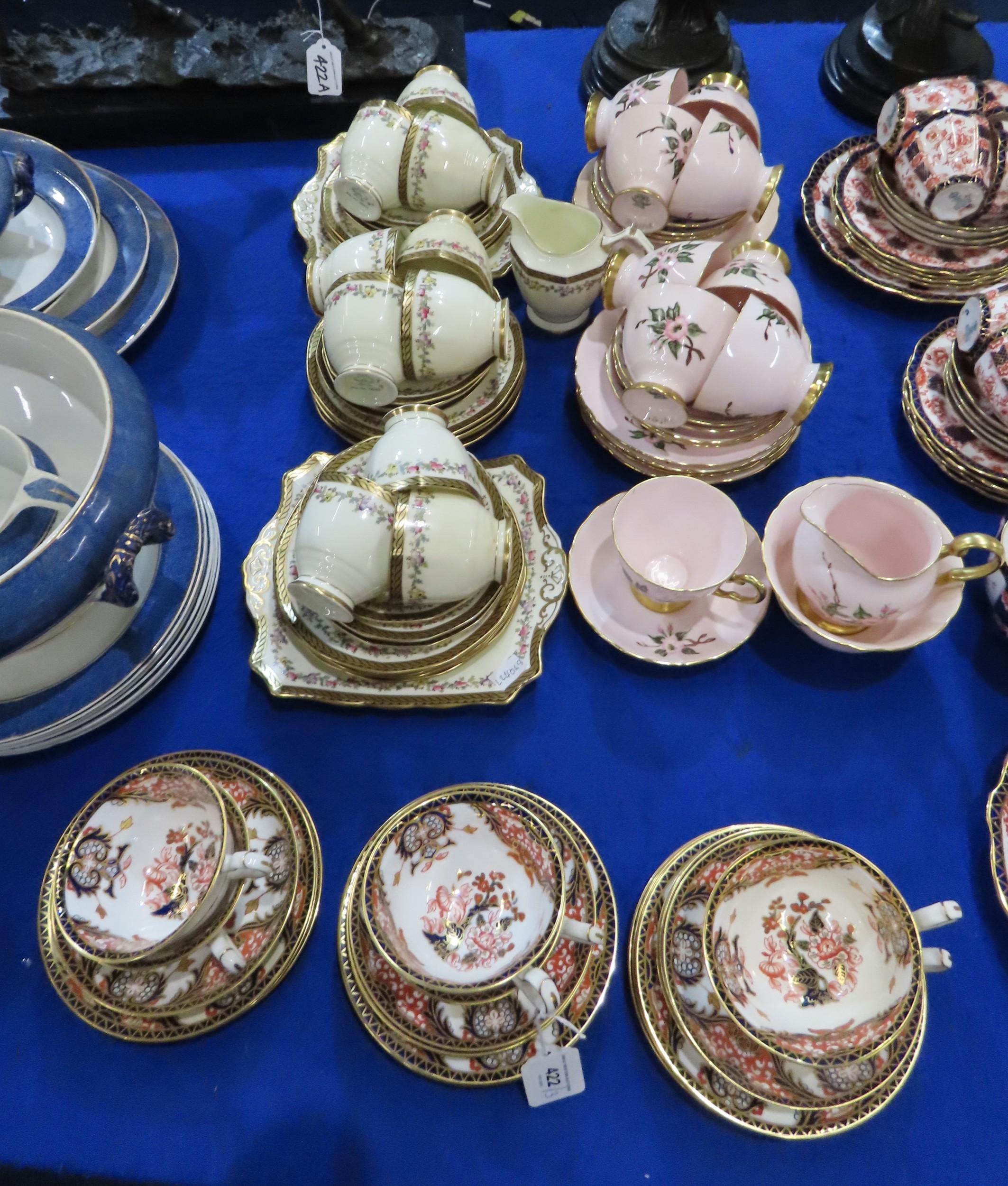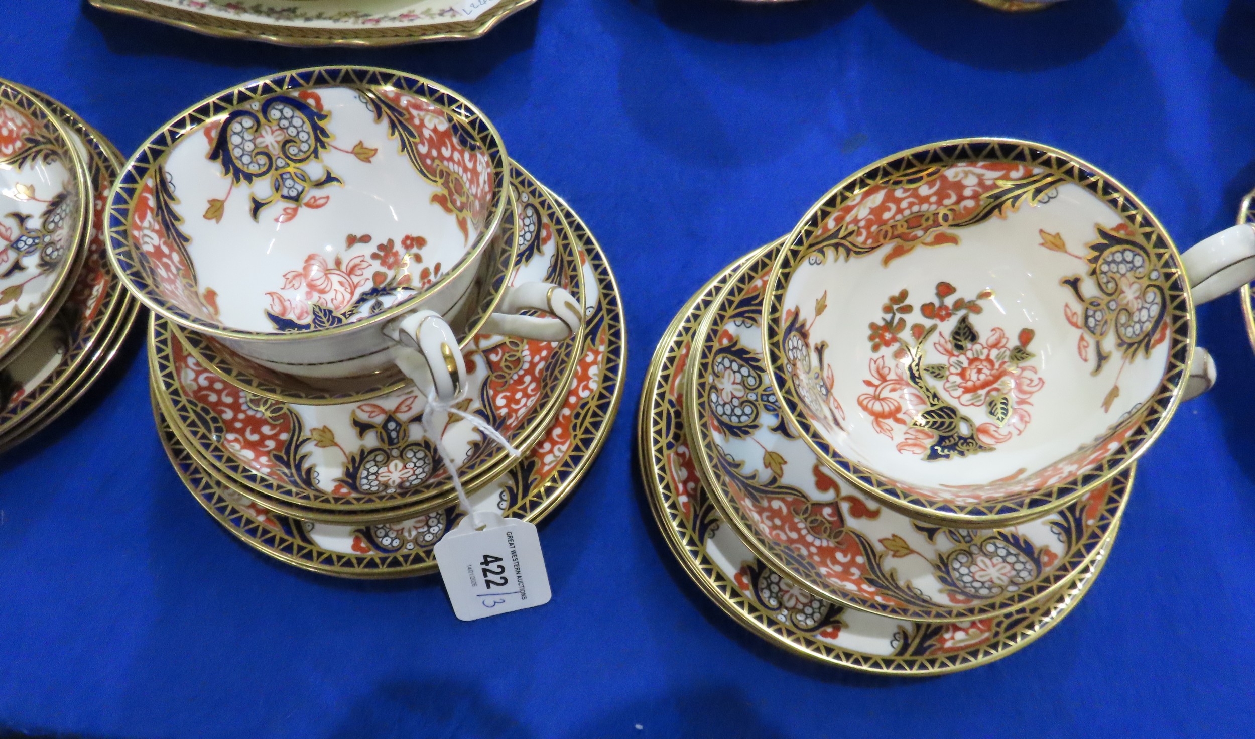 Six Royal Crown Derby 383 imari pattern cups, saucers and plates together with a lady artist painted Tuscan tea set and a Plant Tuscan tea set with fruit detail
