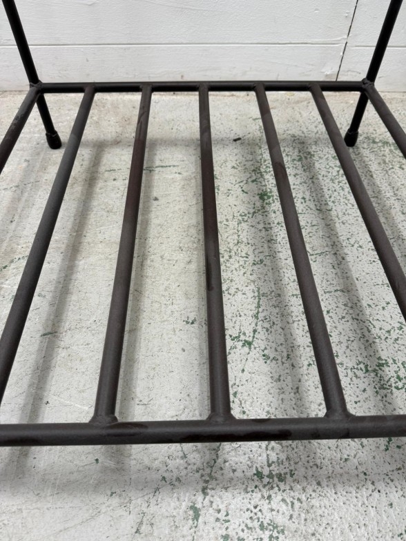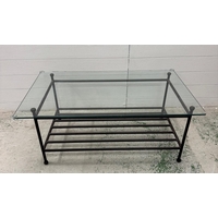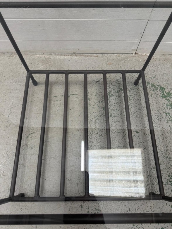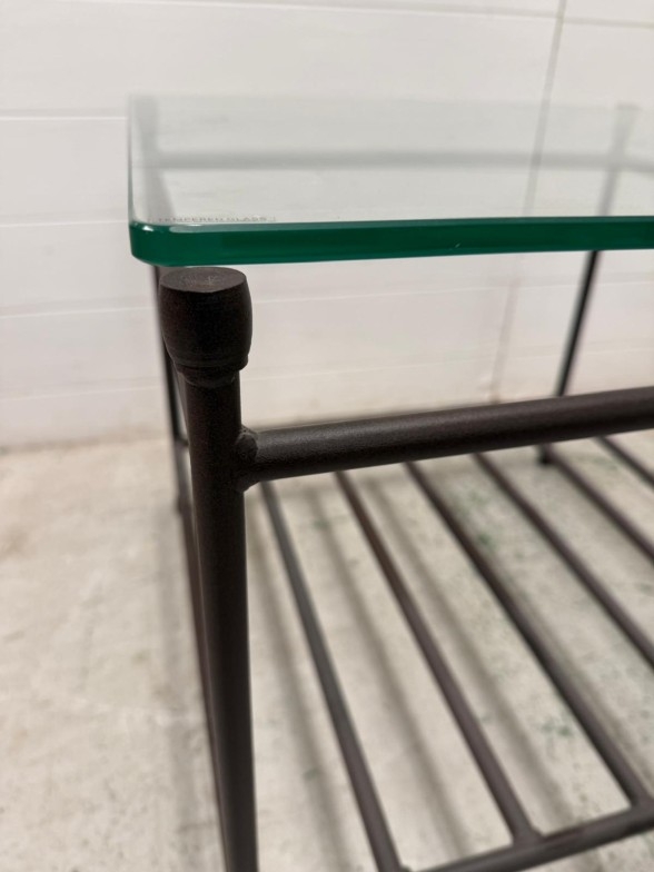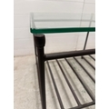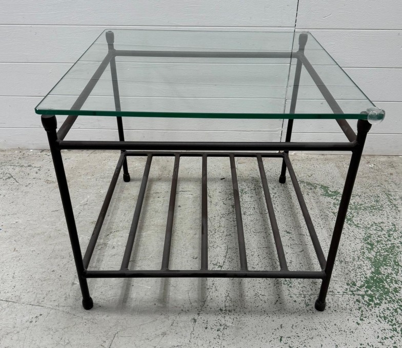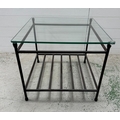 A wrought iron glass topped side table with shelf under (H51cm W60cm D60cm)