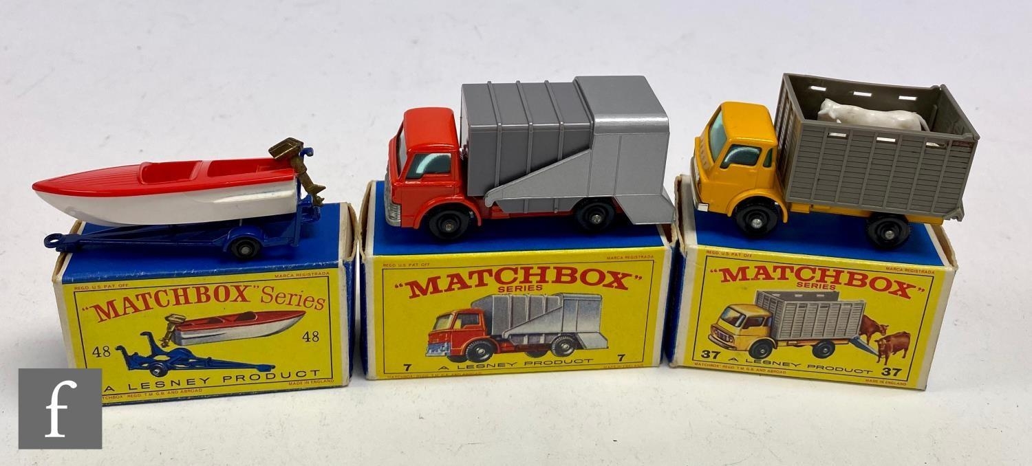 Three Lesney Matchbox diecast models, comprising 7c Refuse Truck with orange-red body, 37c Dodge Cattle Truck complete with cattle and 48b Sports Boat and Trailer with dark blue trailer with black plastic wheels, all boxed. (3)