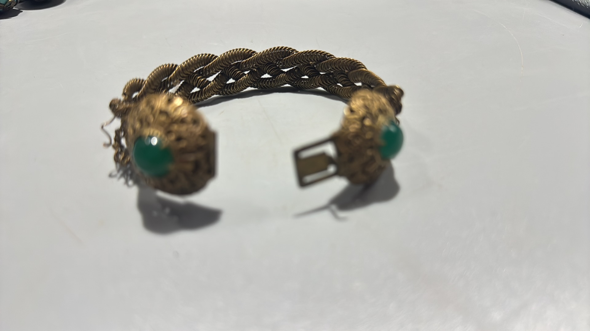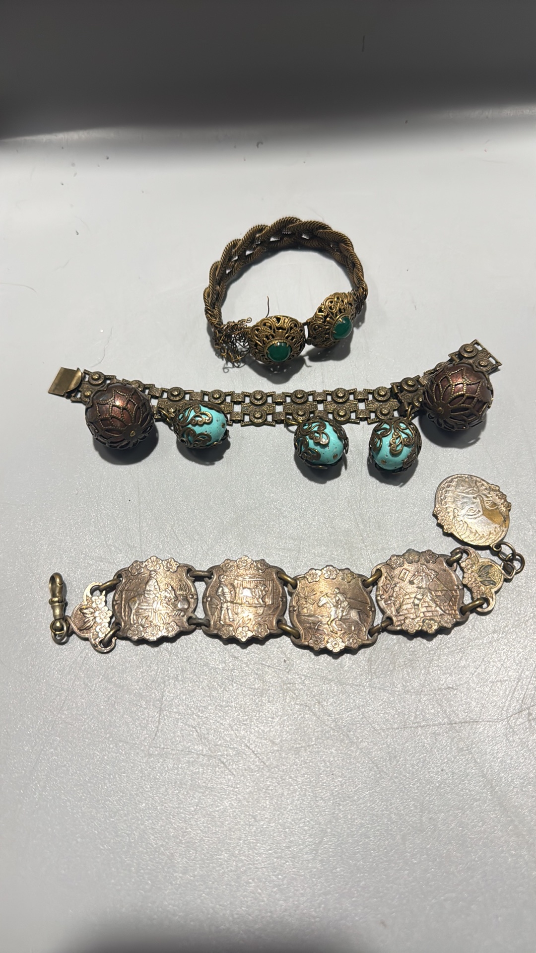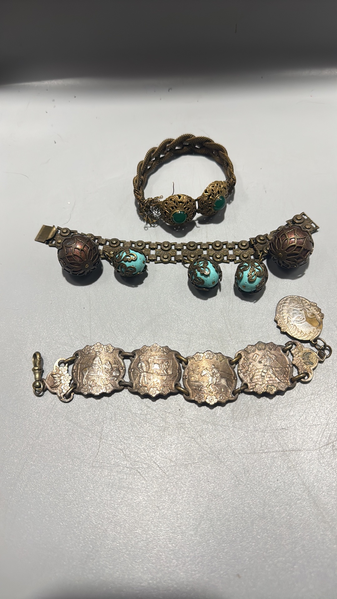 Group of three Chinese export-style gilt metal bracelets: braided rope filigree example with green cabochon glass terminals; panel bracelet with repoussé figural scenes and attached mask charm; articulated link bracelet suspending filigree-caged turquoise glass beads.