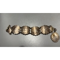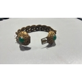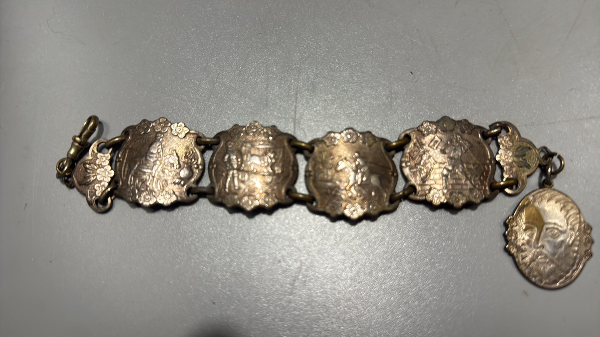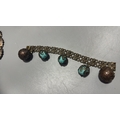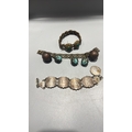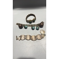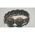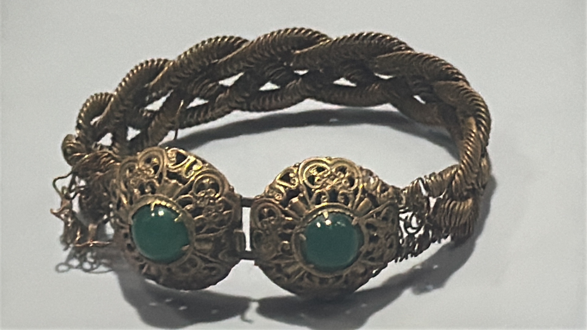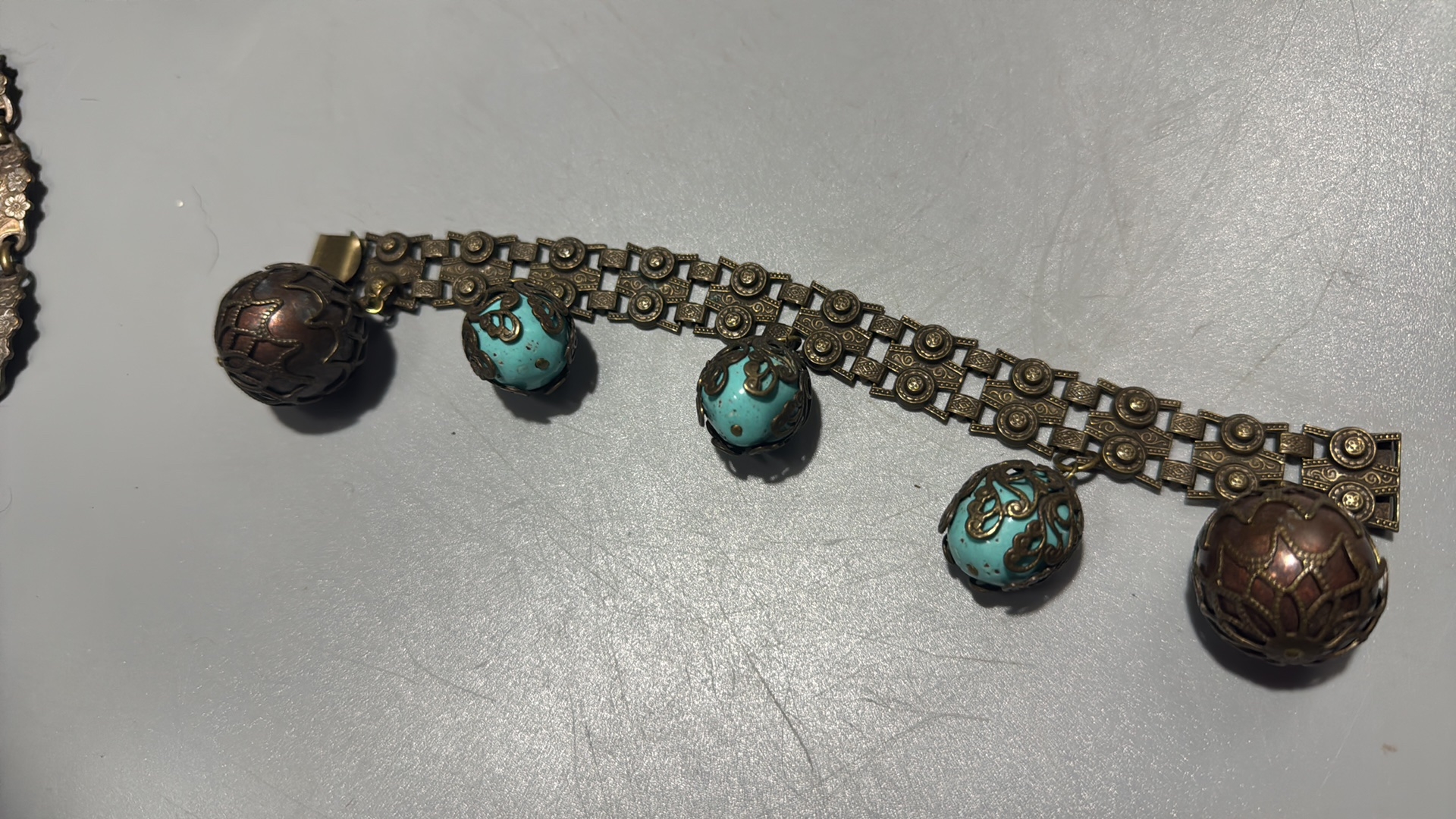 Group of three Chinese export-style gilt metal bracelets: braided rope filigree example with green cabochon glass terminals; panel bracelet with repoussé figural scenes and attached mask charm; articulated link bracelet suspending filigree-caged turquoise glass beads.
