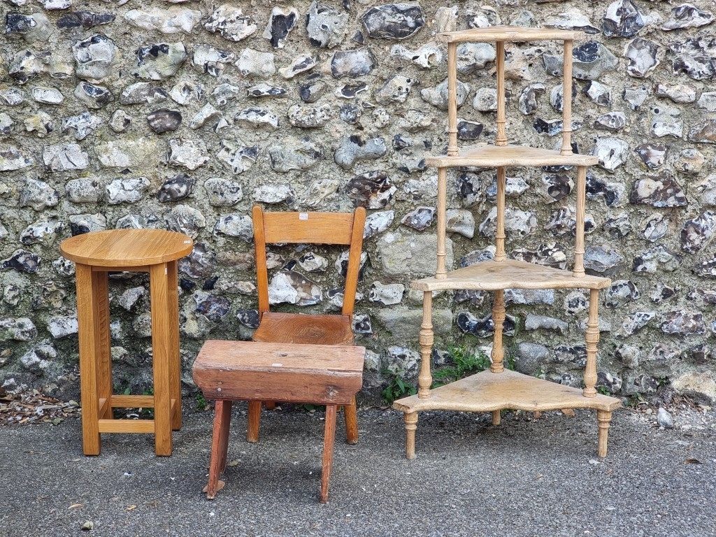 A pine four-tier corner whatnot, 110.5cm high; together with an elm seated child's chair; and two stools. (4)