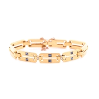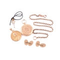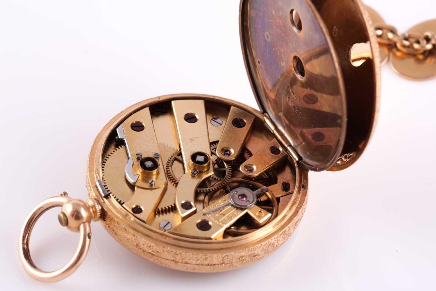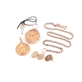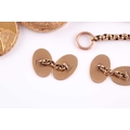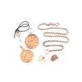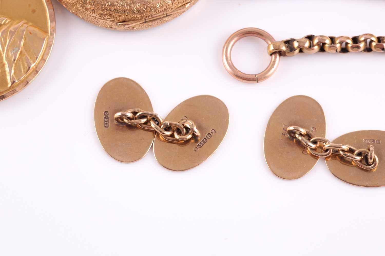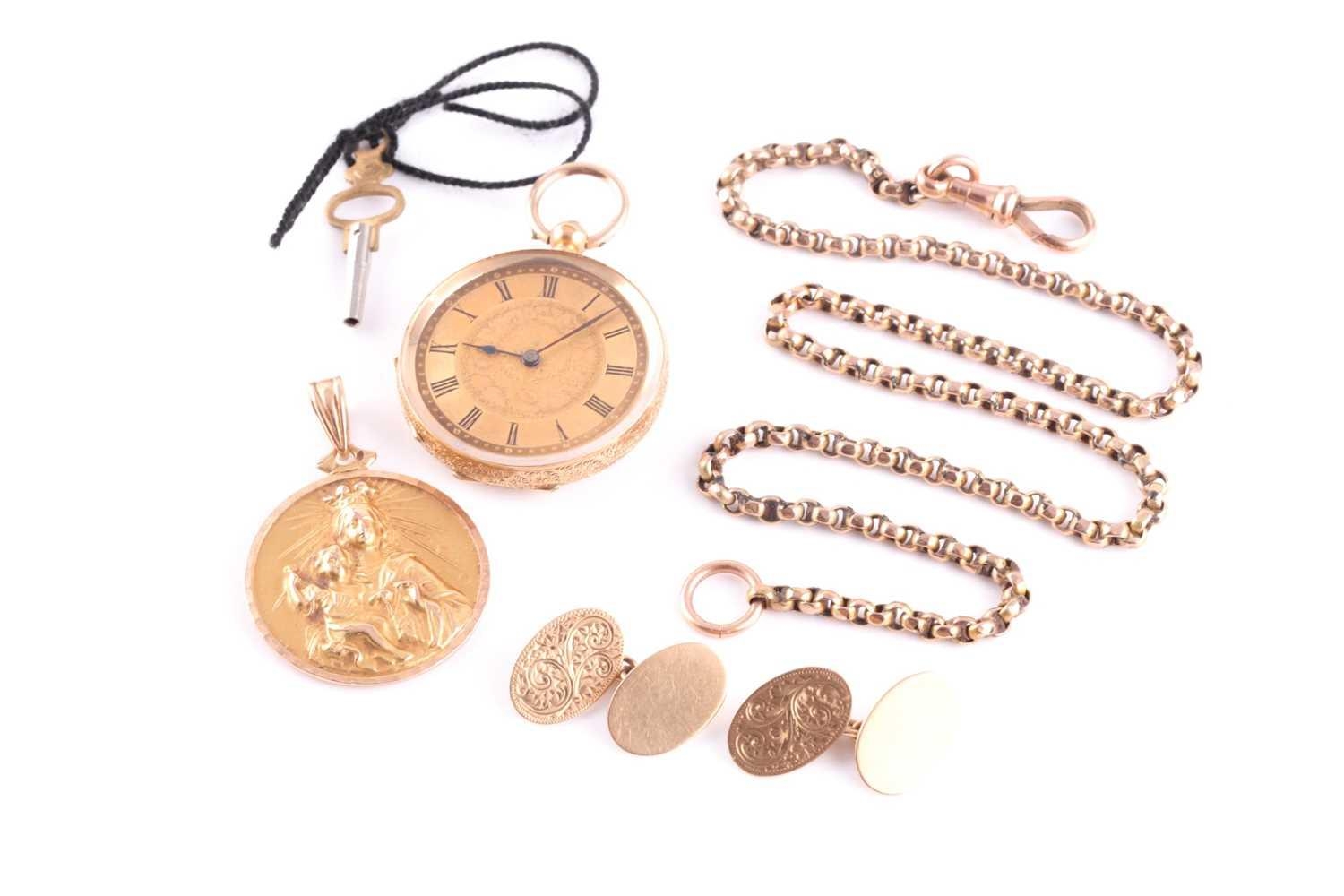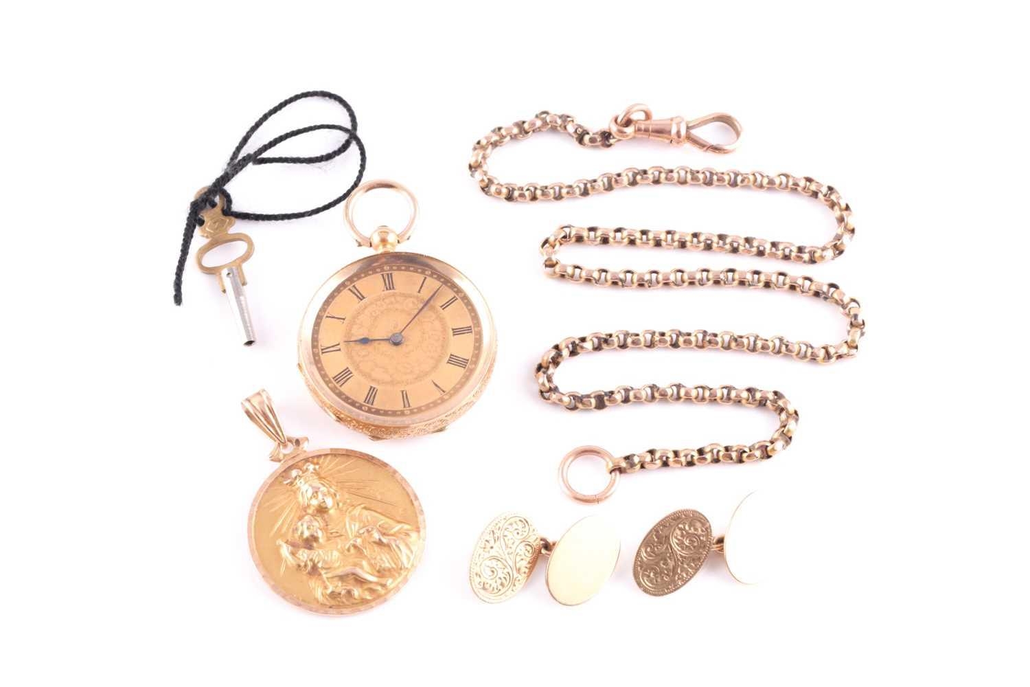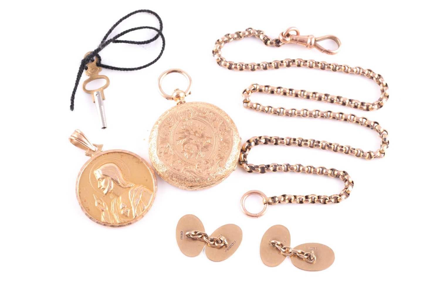 A yellow metal pendant depicting the Virgin Mary with the Infant Jesus, depicting Jesus as an adult to verso, suspended on a Victorian yellow metal watch chain necklace, together with a pair of 9ct yellow gold cufflinks, and a 18ct yellow gold cased fob watch, with engraved case, base metal jump ring.