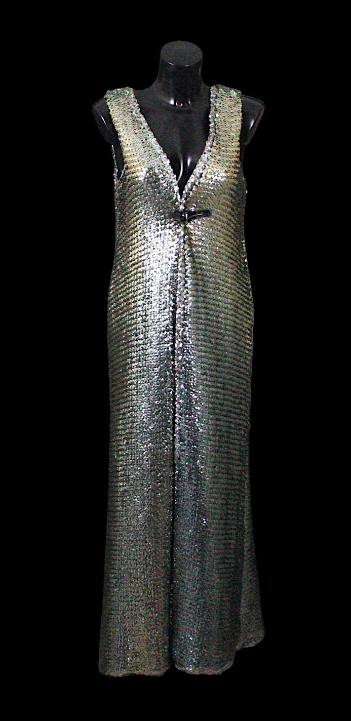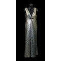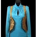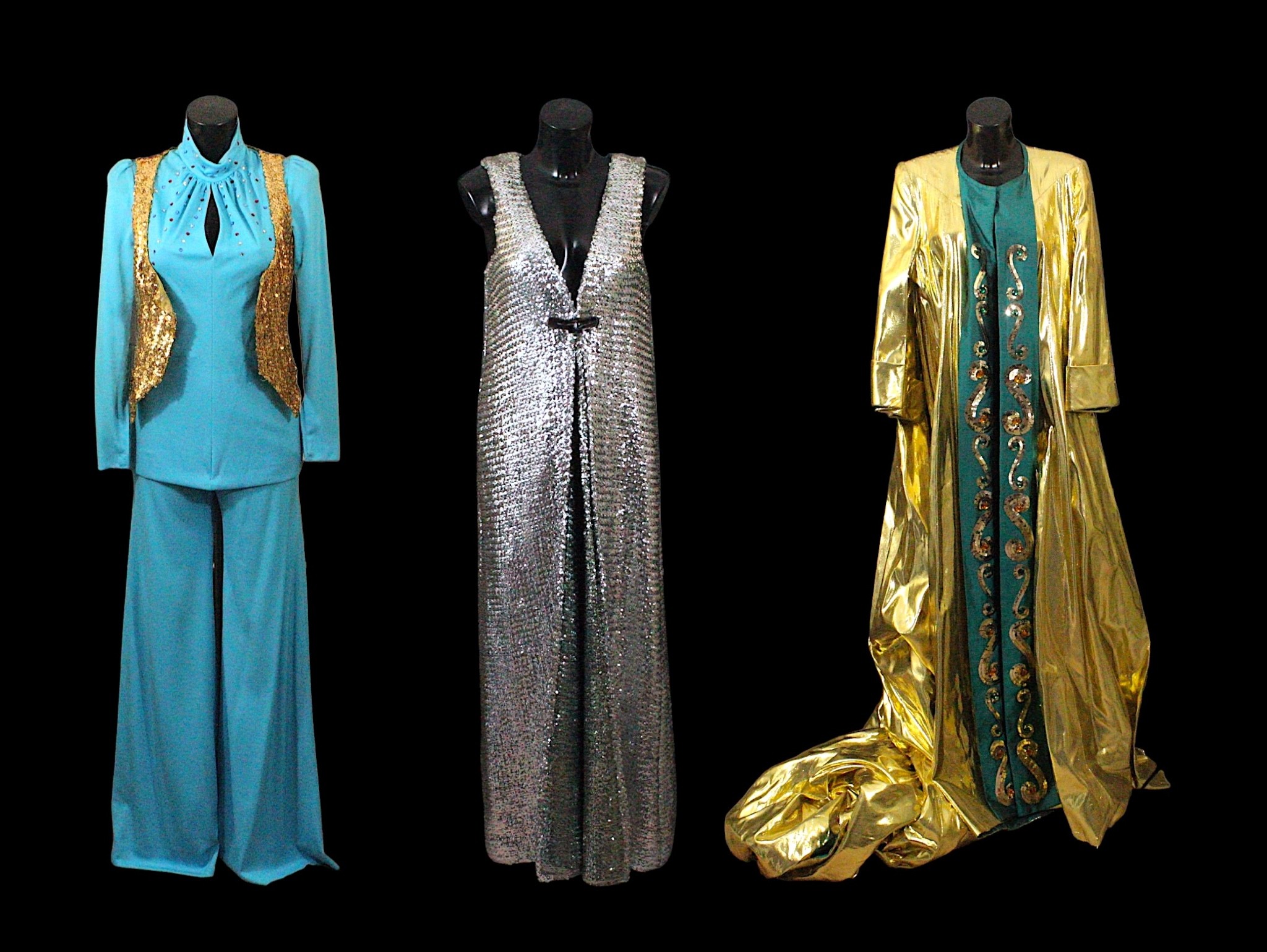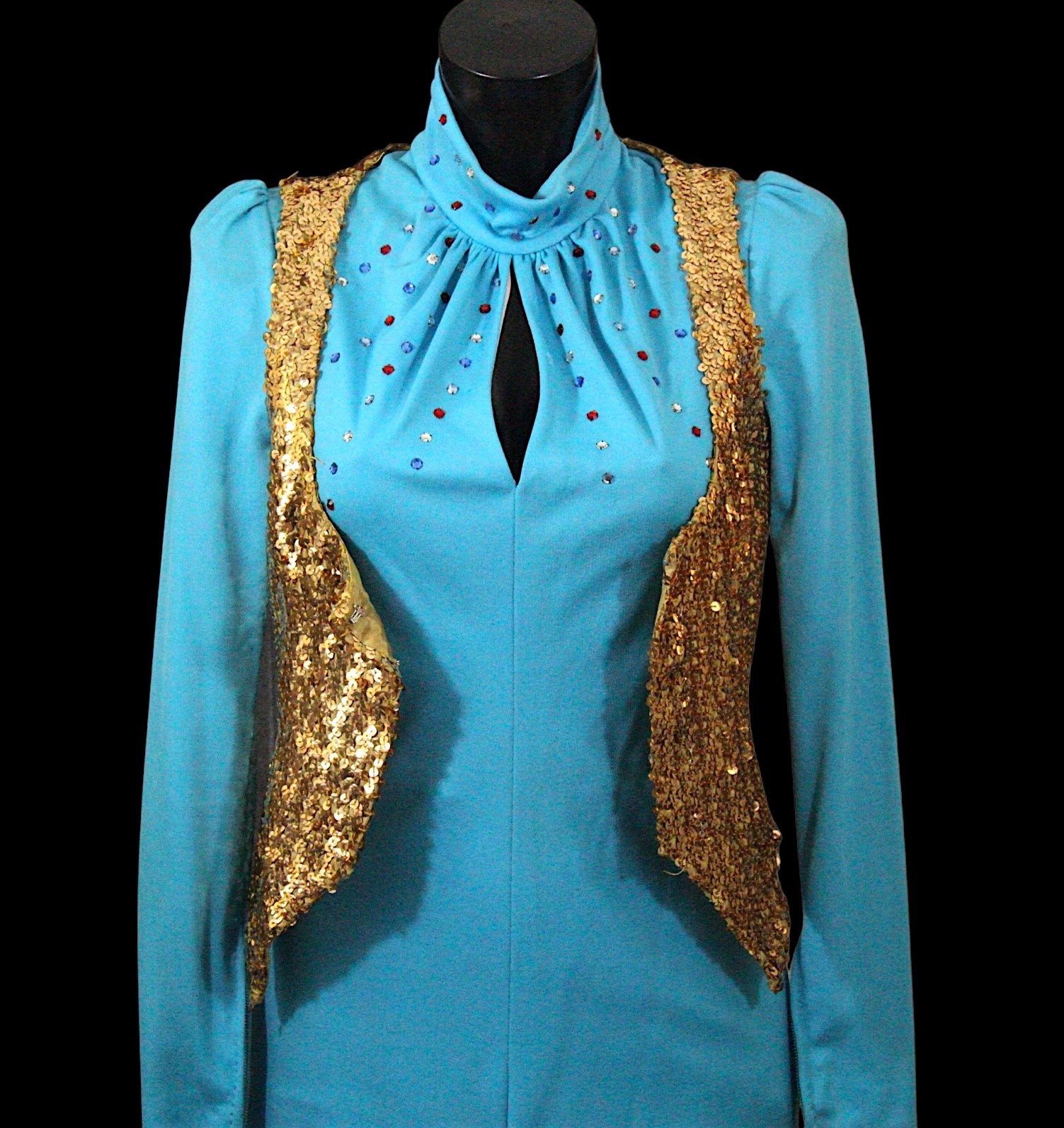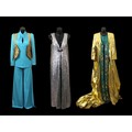 including; an oversized full length coat with train in gold lame type fabric, jade green lining, embellished with sequins, velcro fastening to neck; a full length silver sequin sleeveless coat; a blue long sleeve turtleneck tunic and matching trousers, polyester, top embellished with multicoloured diamantés, trousers waist flat approximately 32cm, together with a gold sequin waistcoat (5)