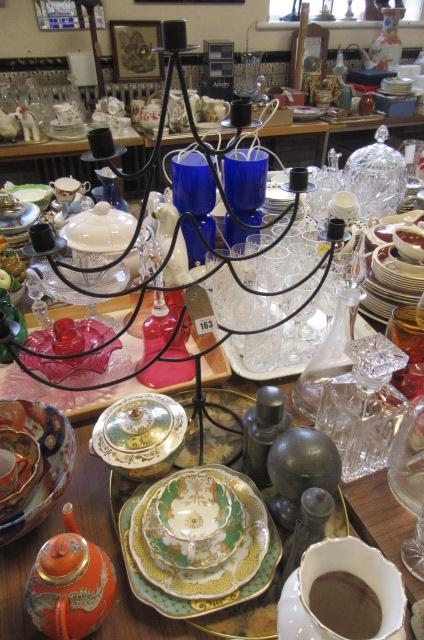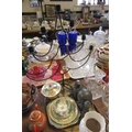 TRAY OF CERAMICS WITH PEWTER AND CANDLE HOLDER