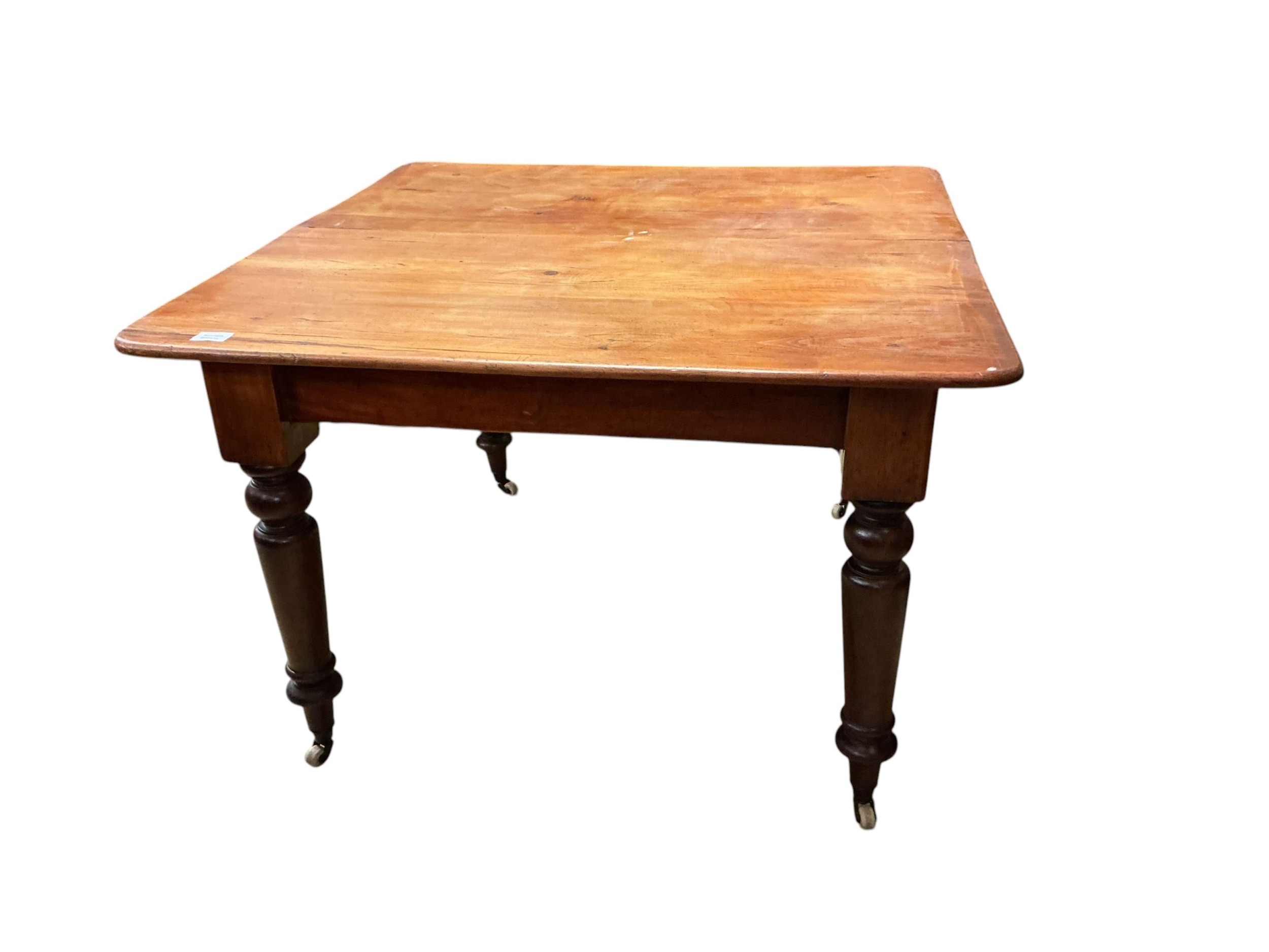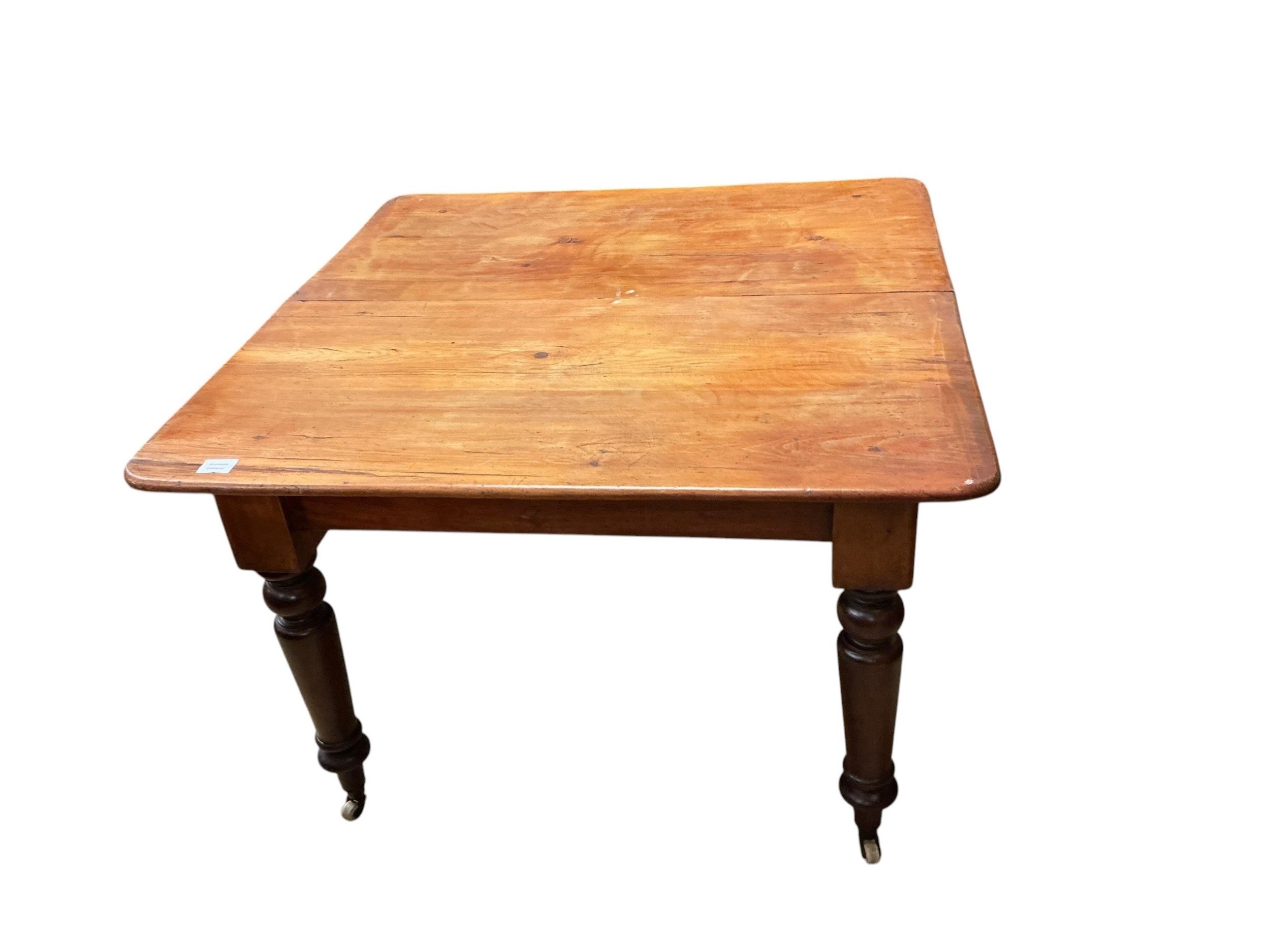 A Victorian pine extending dining table, width 103cm, 145cm extended, depth 104cm, height 70cm (one spare leaf)