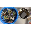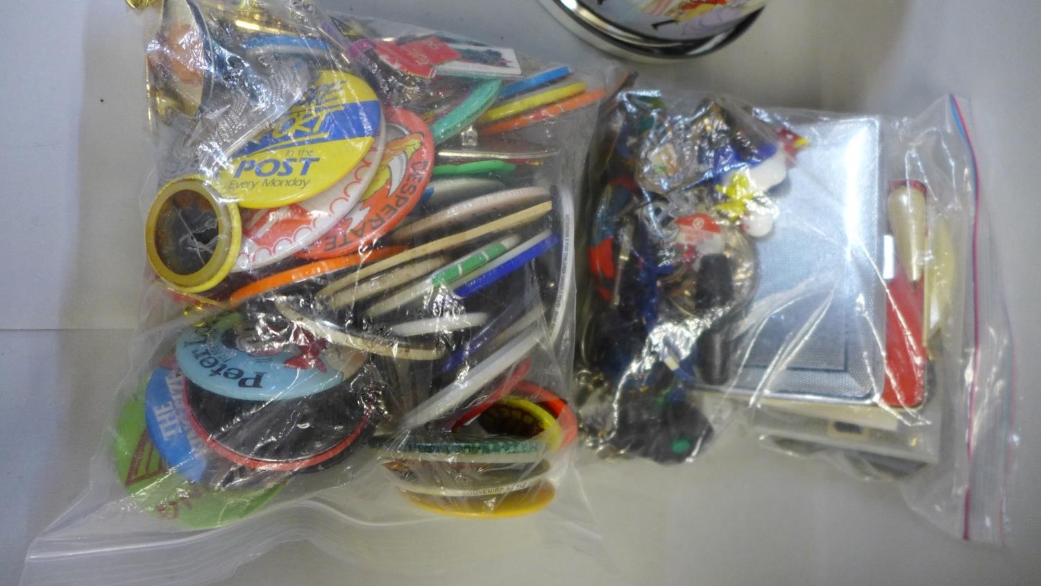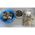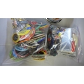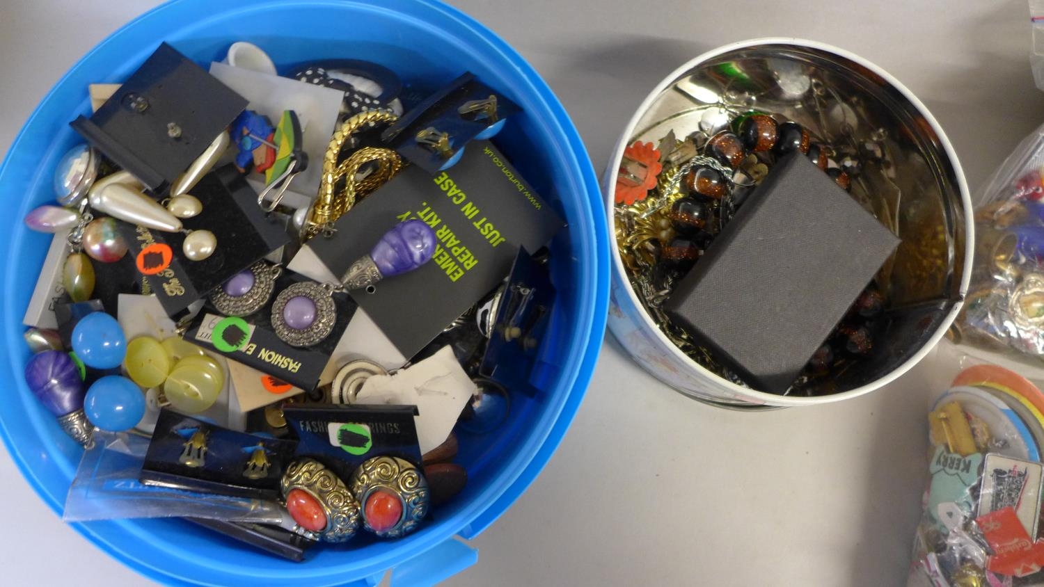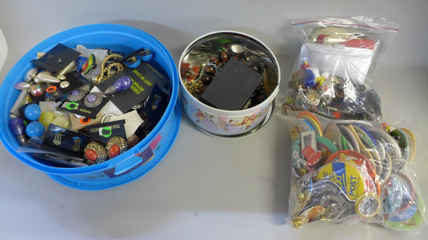 A tub of fashion earrings, a bag of pin badges, medallions, vintage costume jewellery, etc.