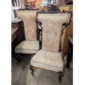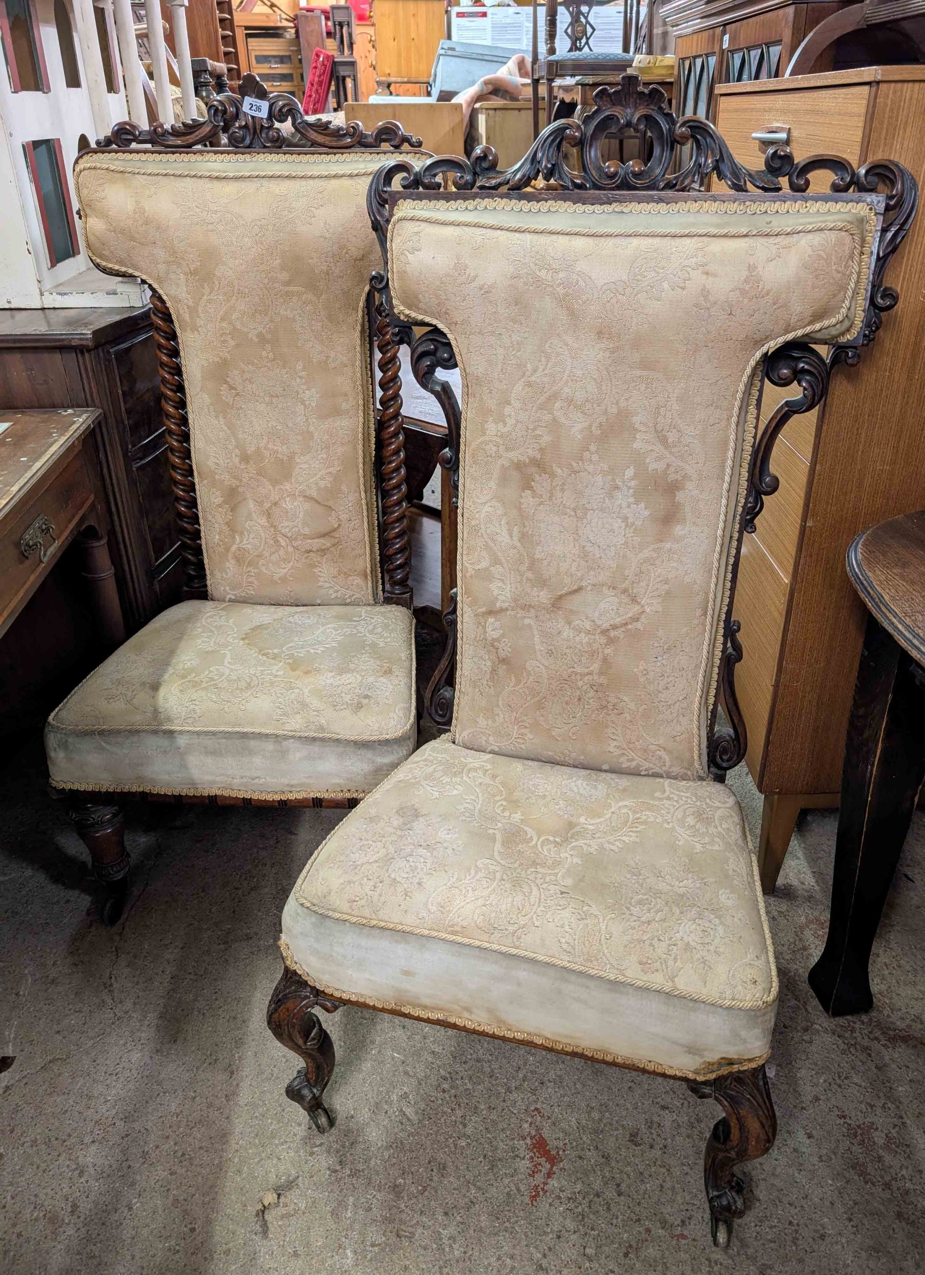 Two similar Victorian part show frame prie-dieu chairs, both with pierced scroll top rails, matching tapestry upholstery and cross shaped backs, set on castors