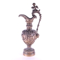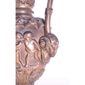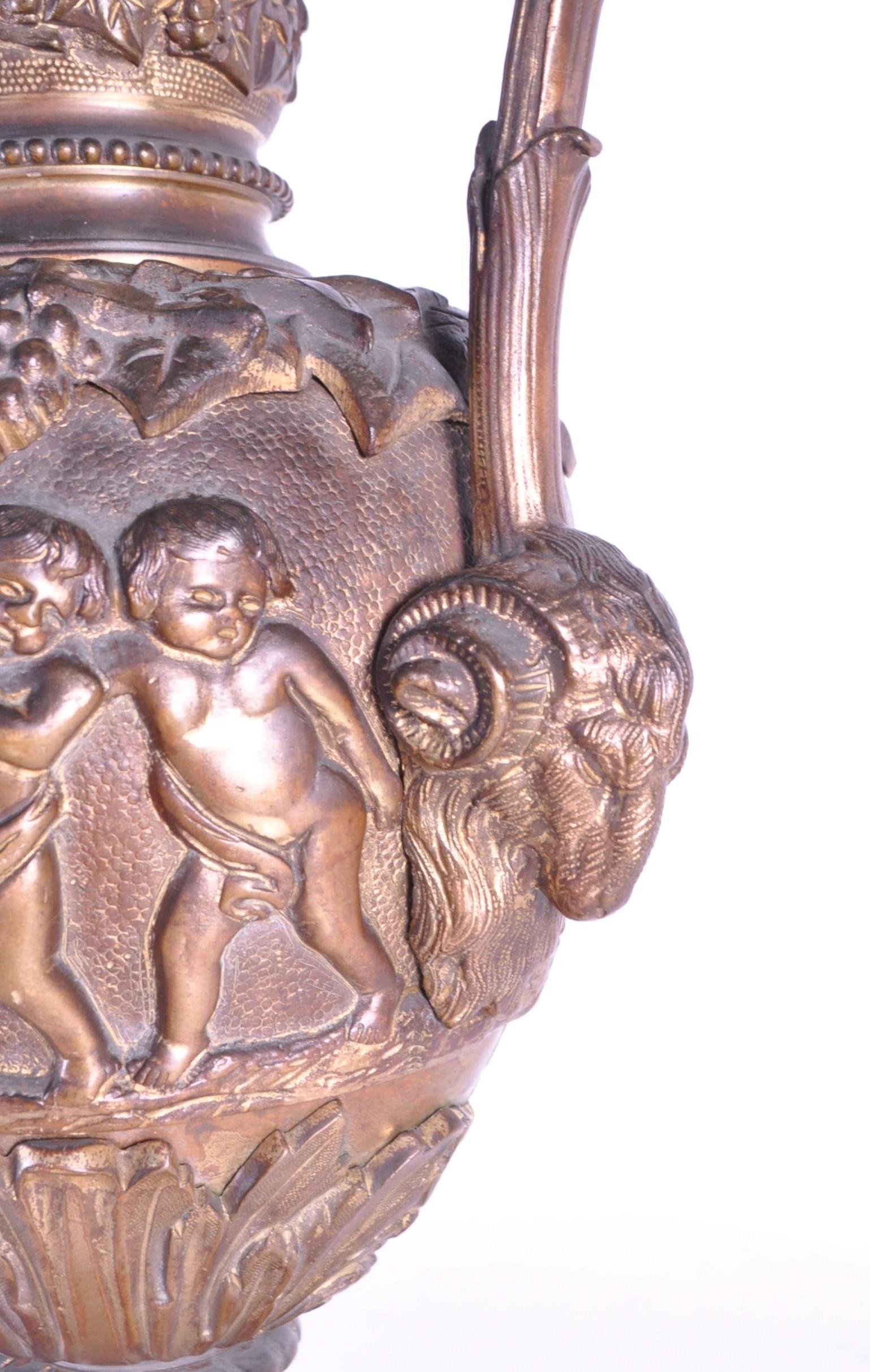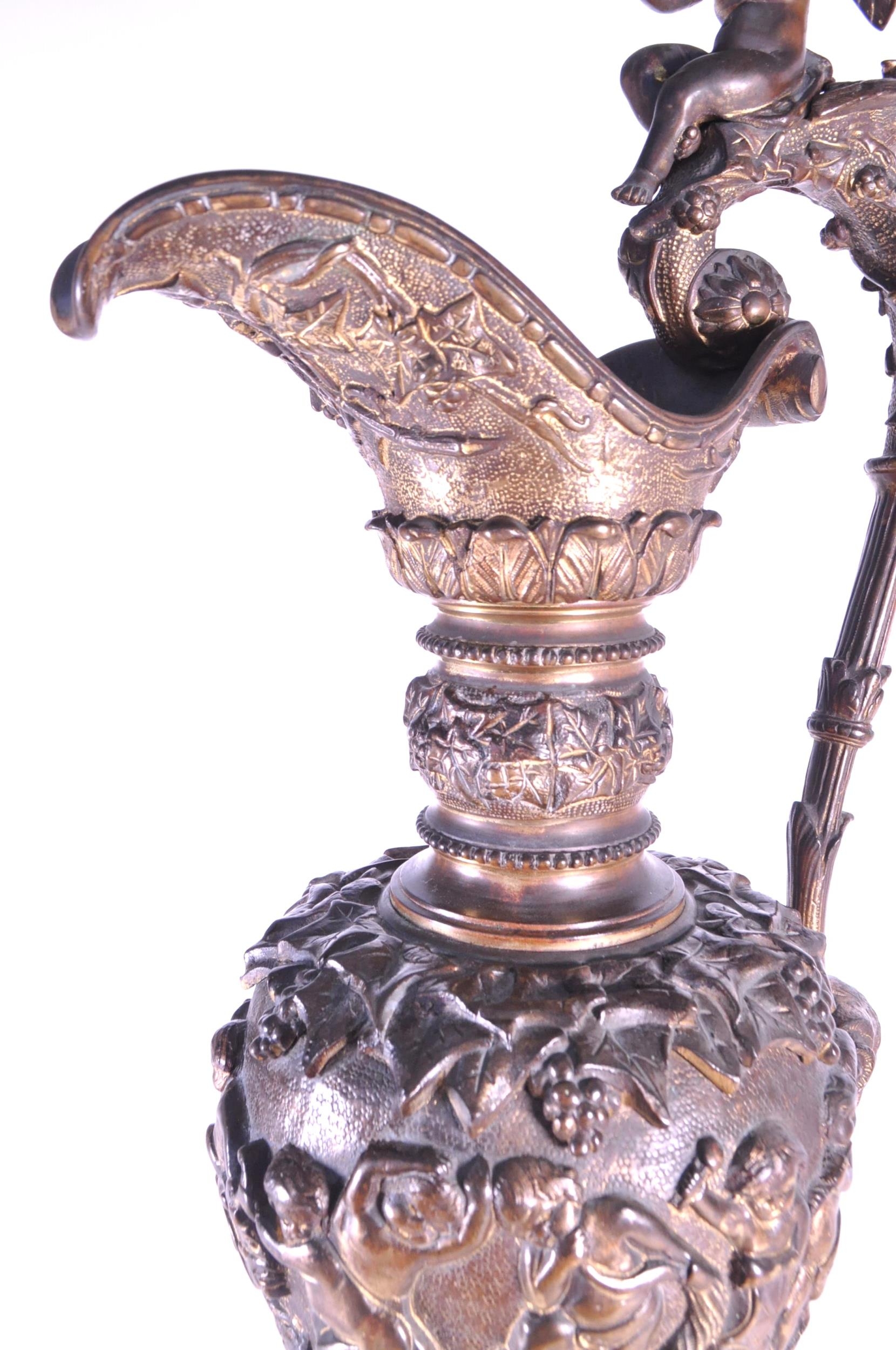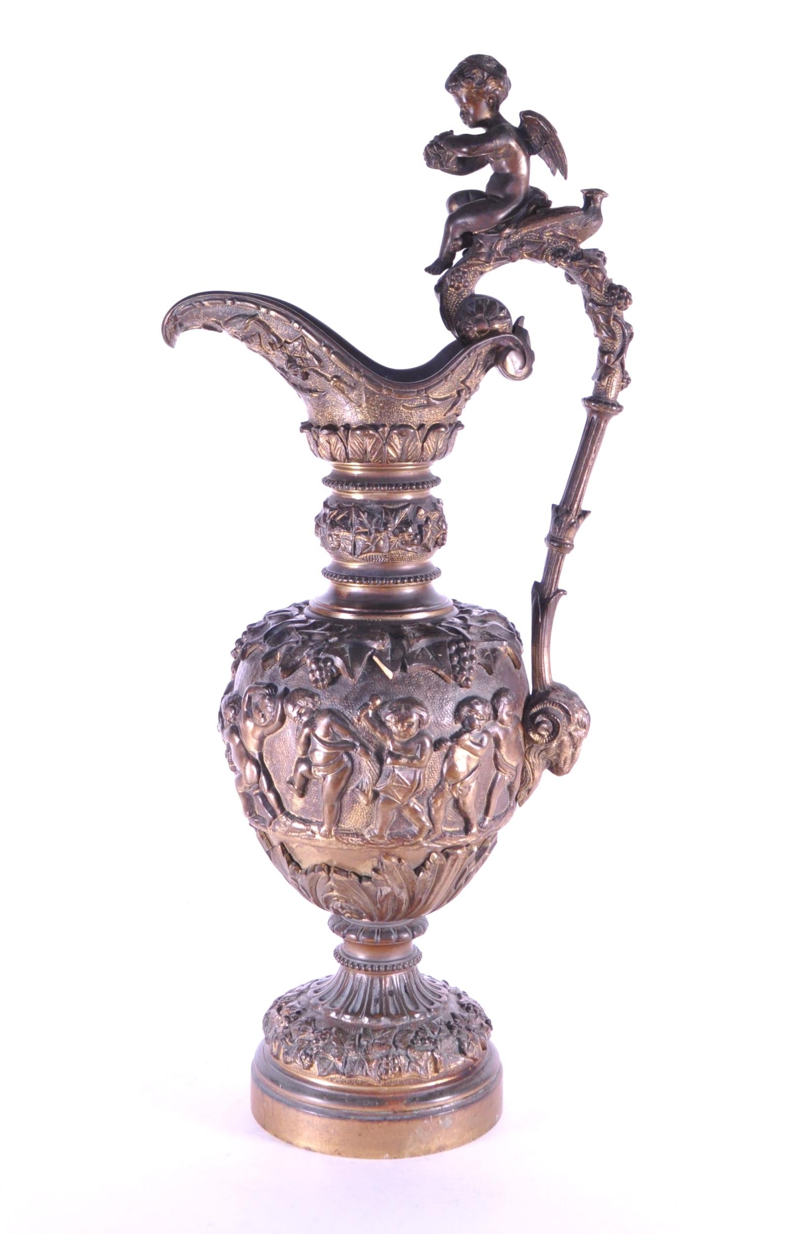 A large 19th century French ormolu and bronze type ewer, the scroll handle surmounted by a cherub and bird, the whole cast with fruiting vine and frolicking Bacchatic infants with another pulling a goat with Ram's head to base of handle, raised on a domed plinth base.
