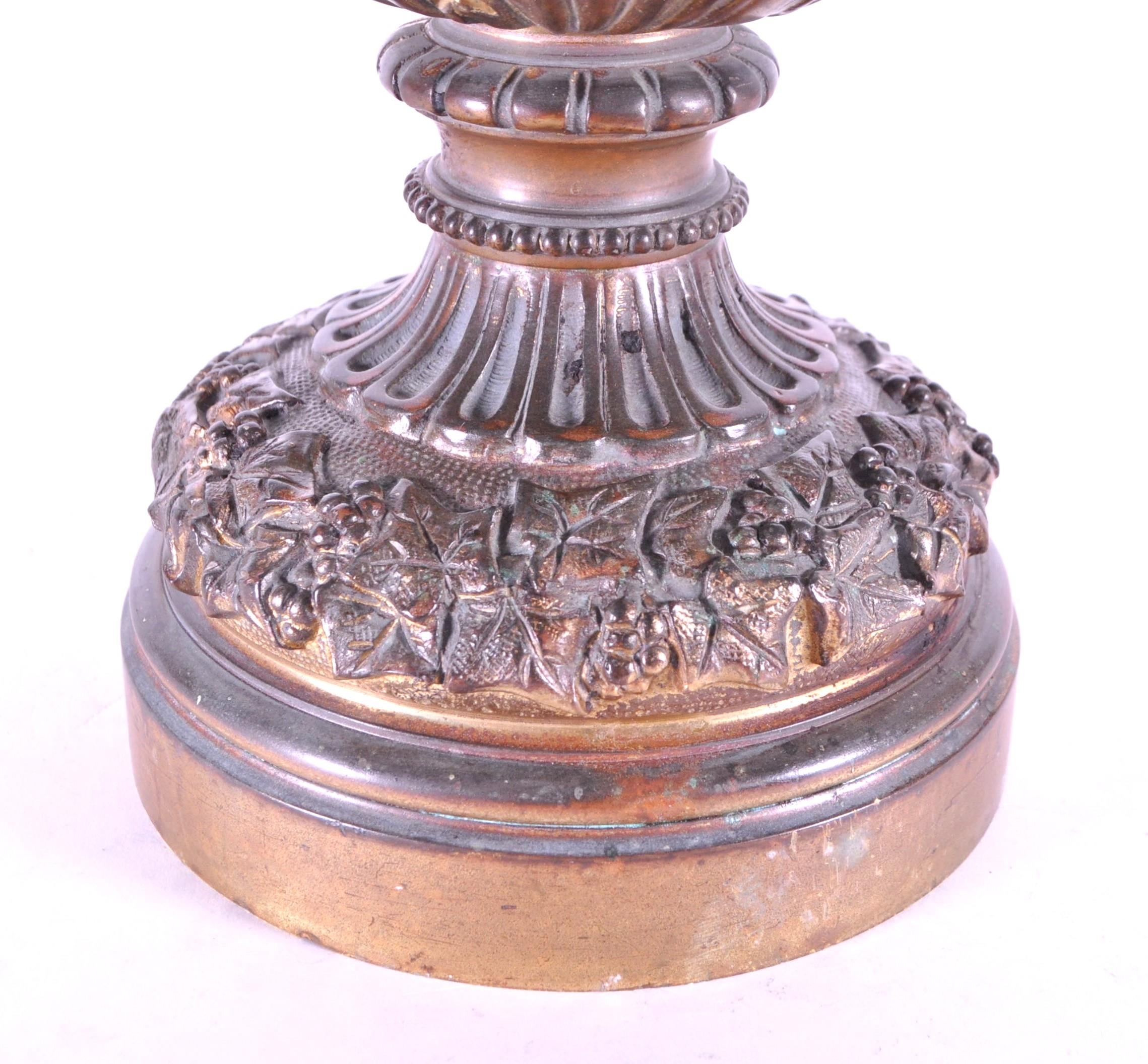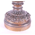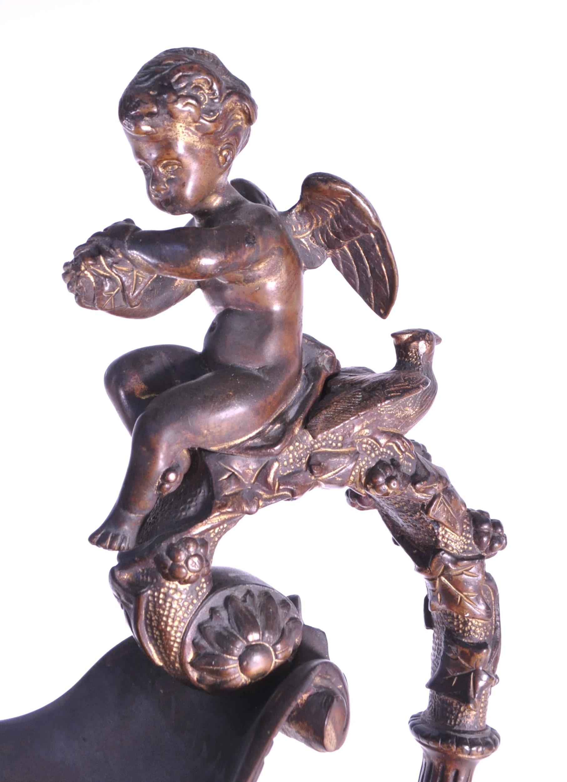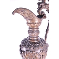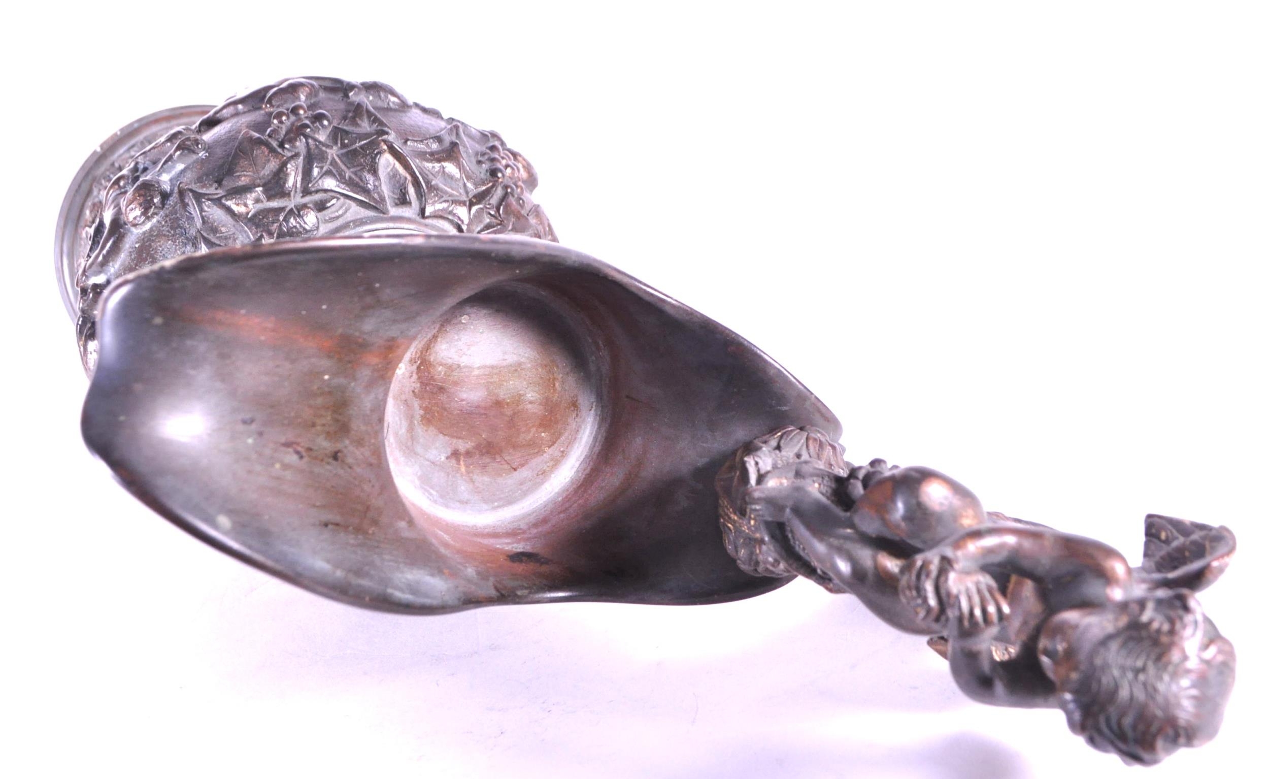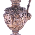 A large 19th century French ormolu and bronze type ewer, the scroll handle surmounted by a cherub and bird, the whole cast with fruiting vine and frolicking Bacchatic infants with another pulling a goat with Ram's head to base of handle, raised on a domed plinth base.