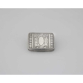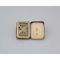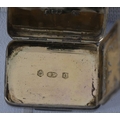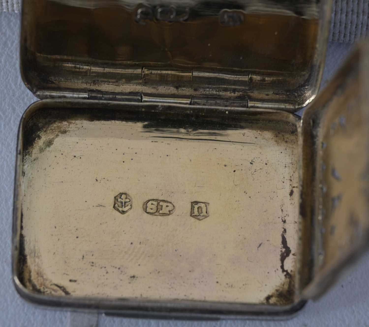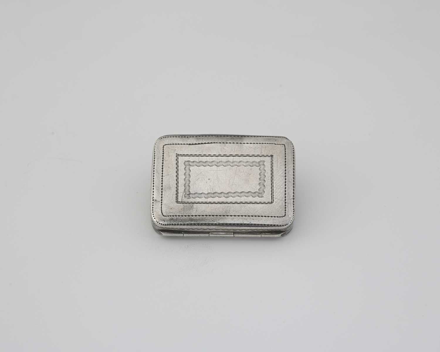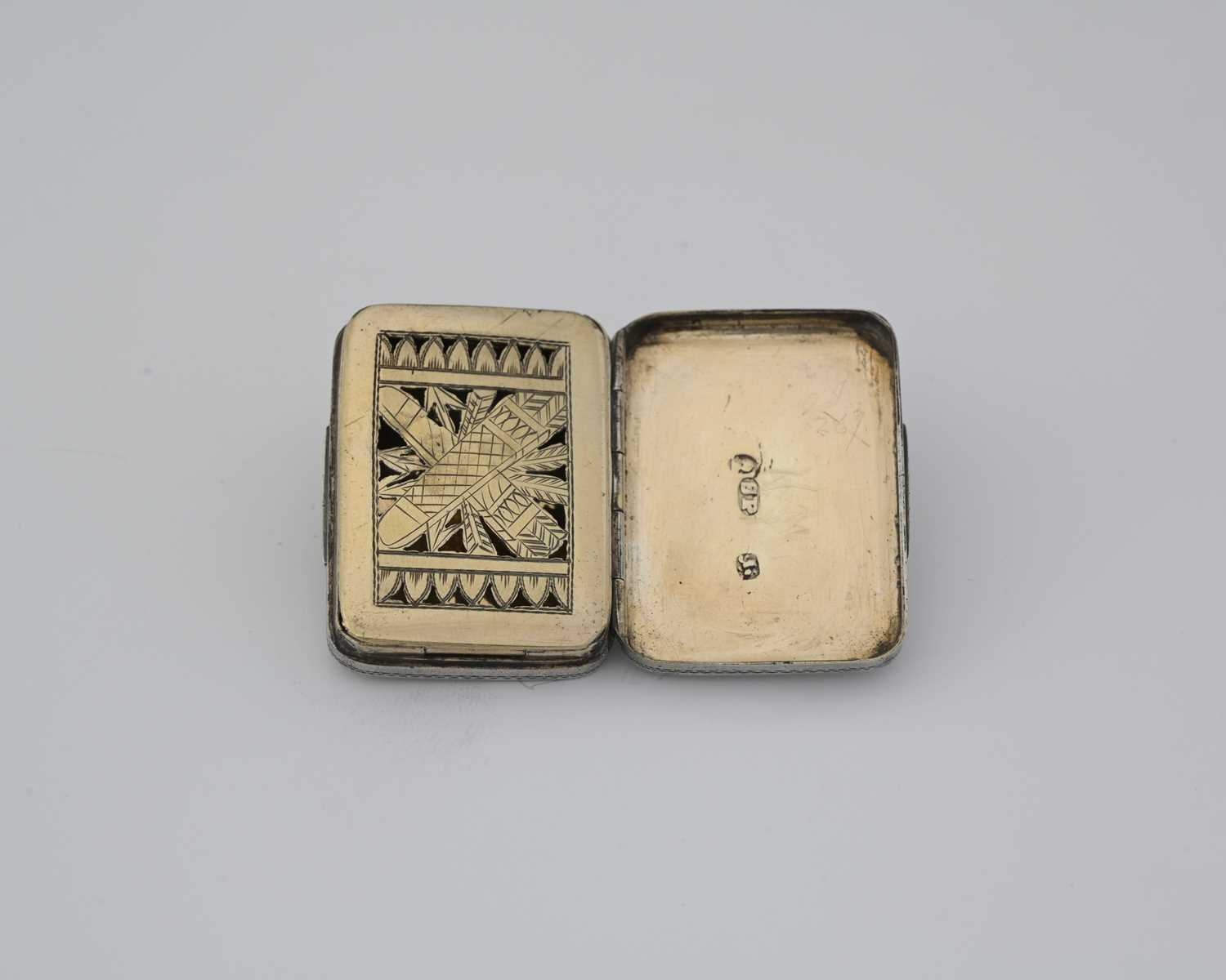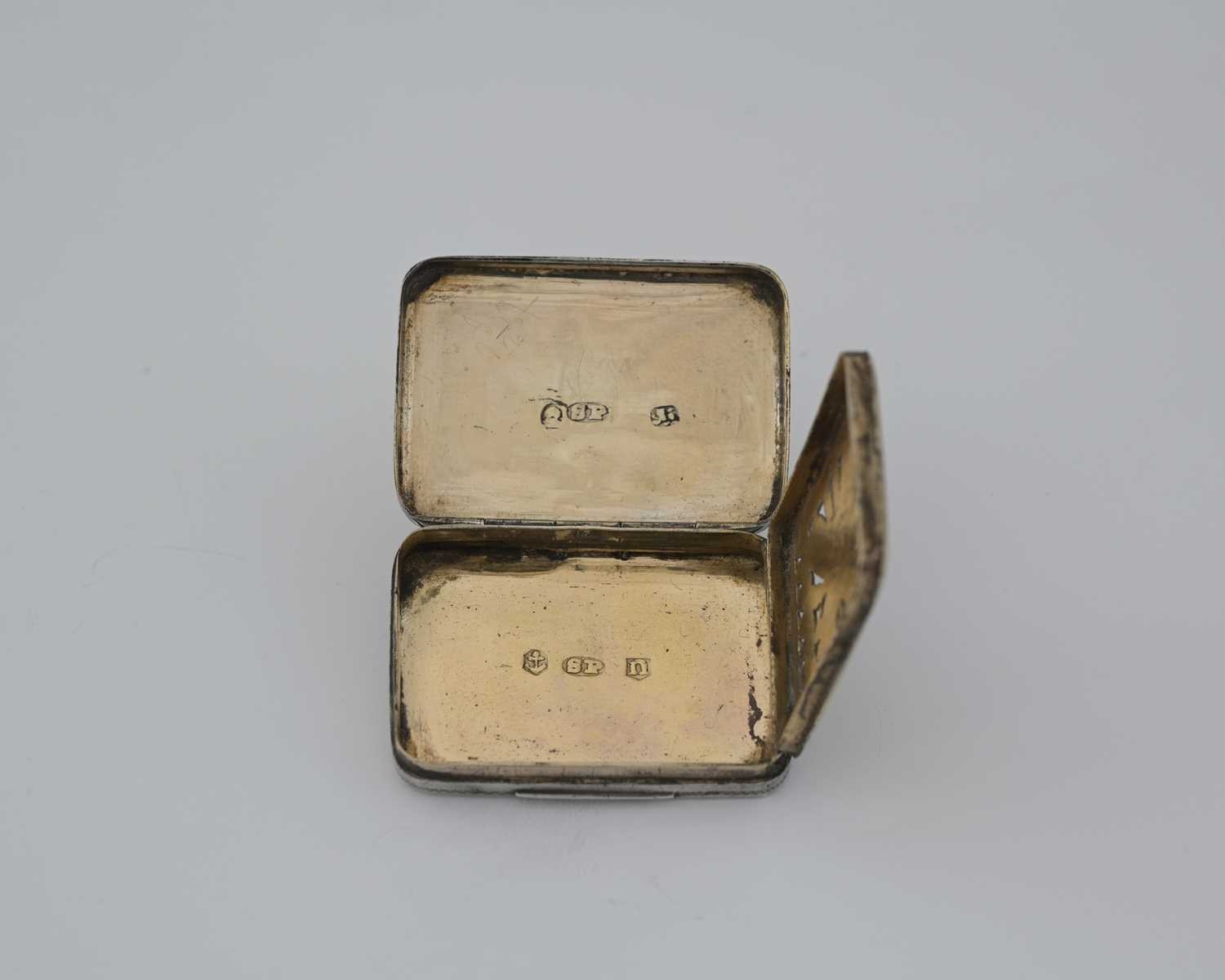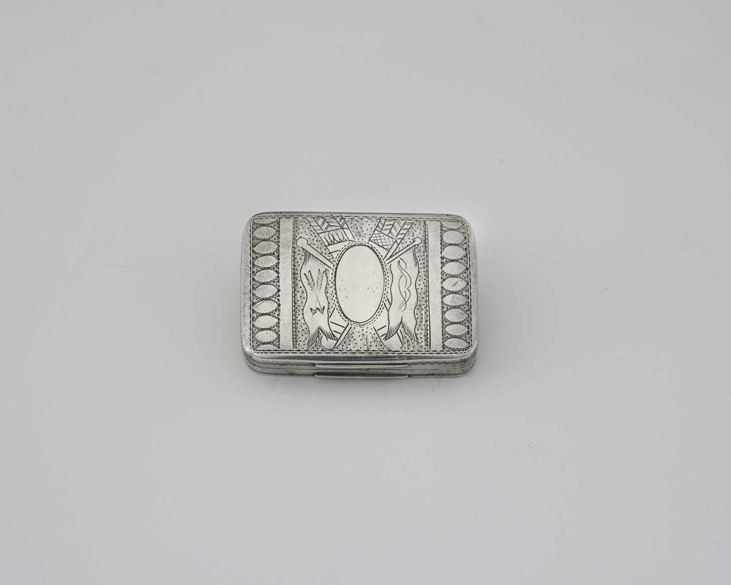 A George III silver vinaigrette, by Samuel Pemberton, Birmingham 1811, of rectangular form, the cover decorated with banners, and arrow quivers, the hinged cover opens to reveal a gilt interior, the hinged and pierced grille decorated with arrows and quivers, length 3.7cm, weight 17g/0.54ozt approx