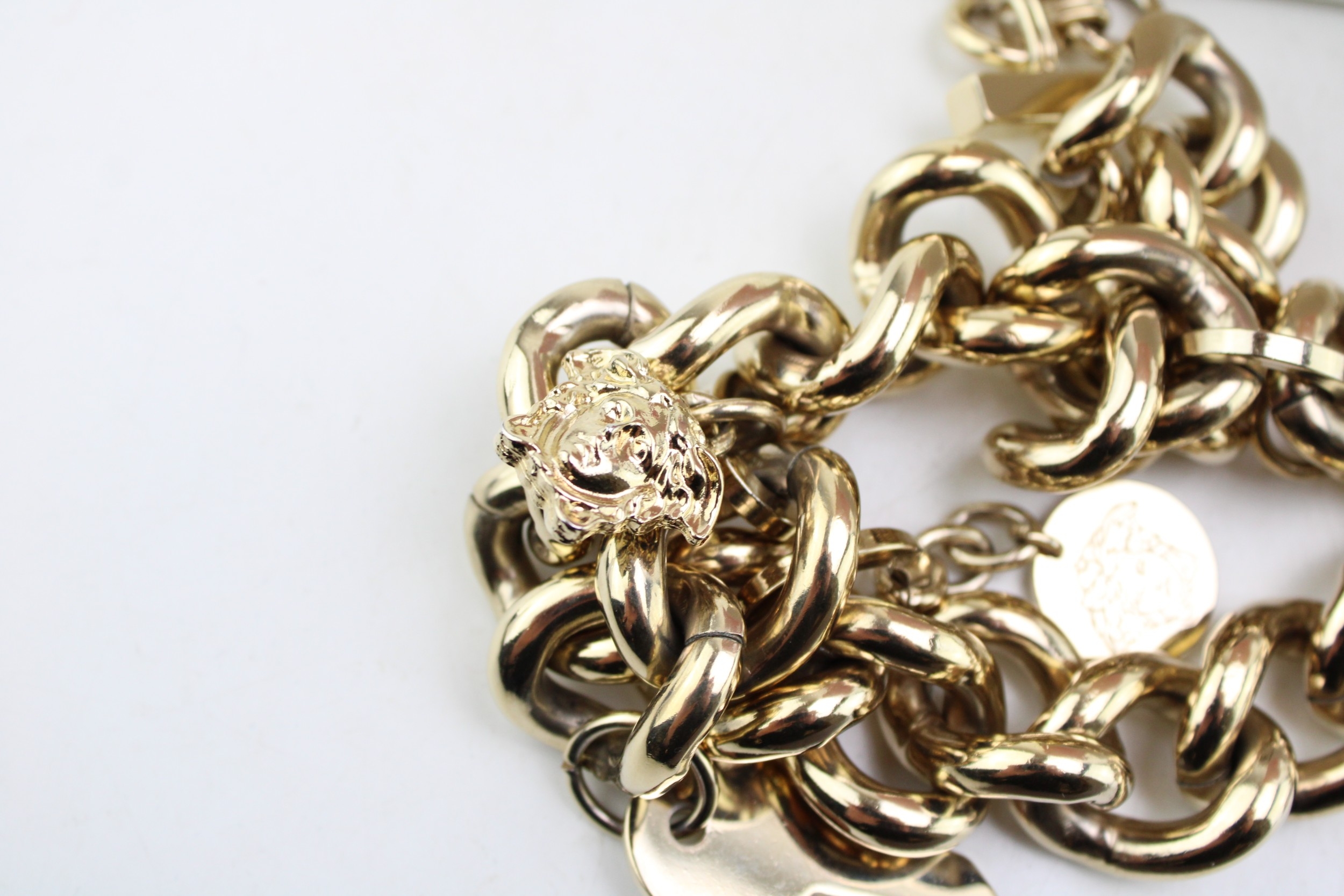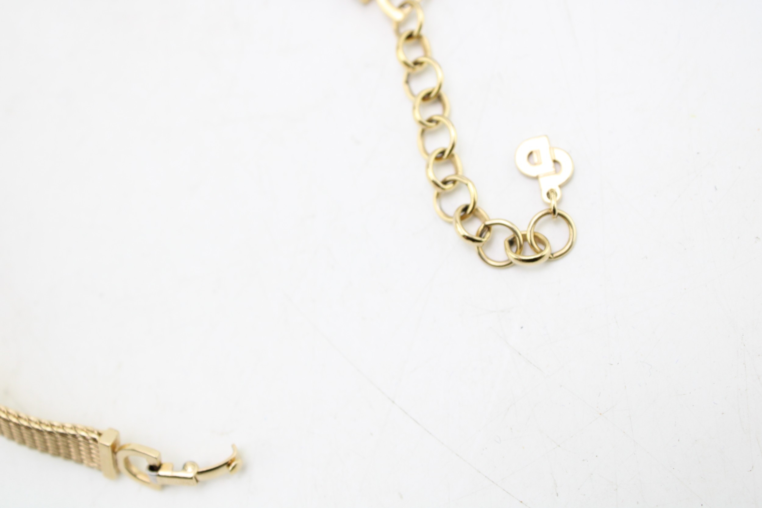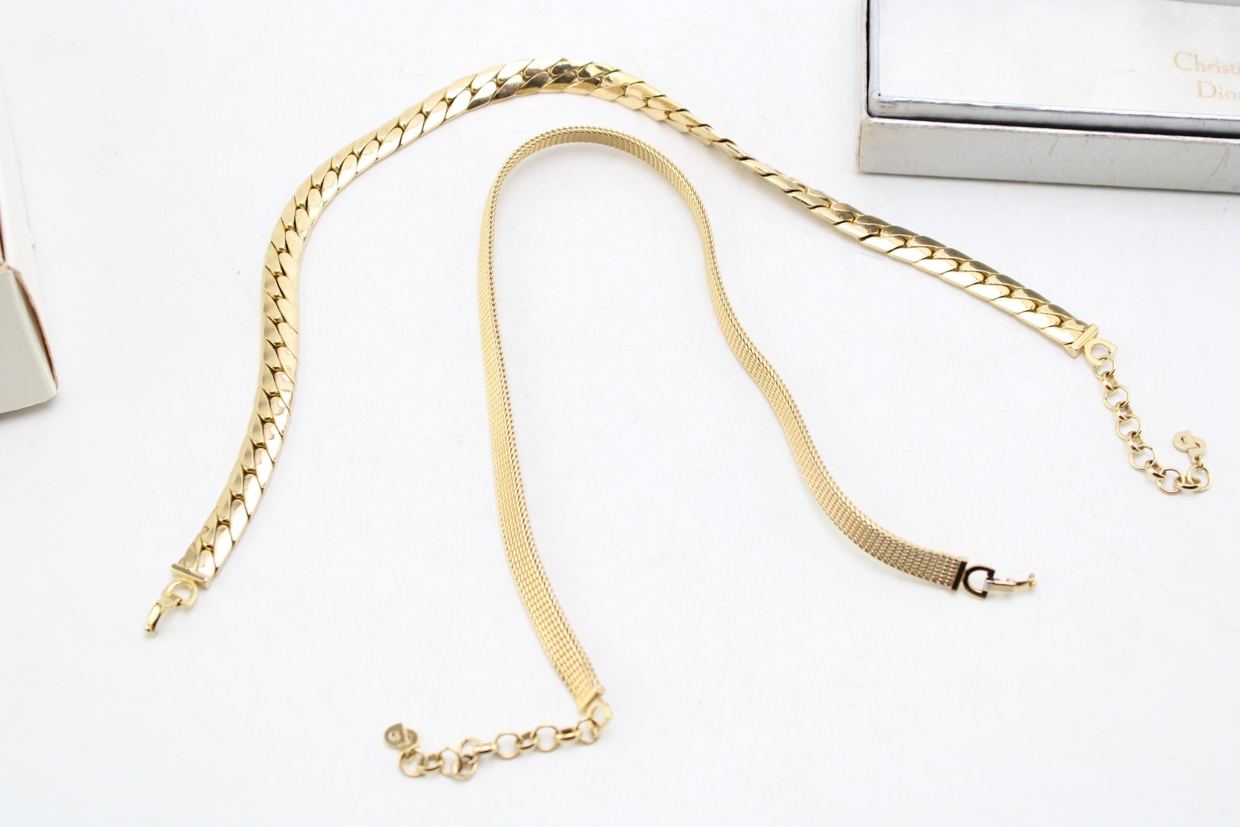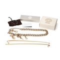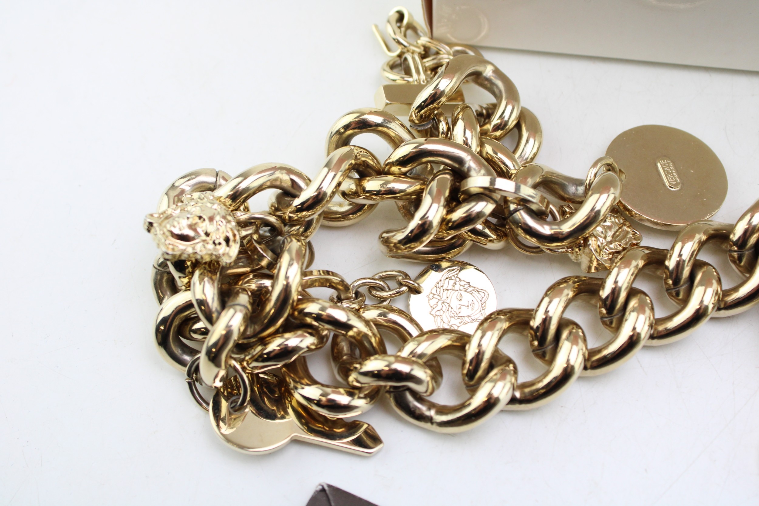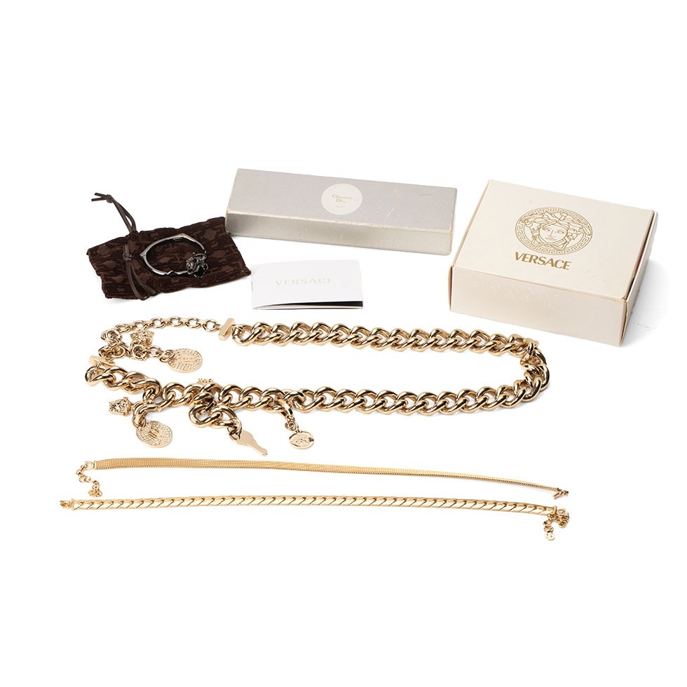 A group of vintage designer costume jewellery comprising two Christian Dior necklaces, one of flat 'S' links the other of woven form, both with classic CD clasp, in Christian Dior box, a Versace curb link charm belt, with unrelated Versace Eyewear certificate, and Roberto Cavelli Rose bangle with sprung hinge, in original pouch and bag.