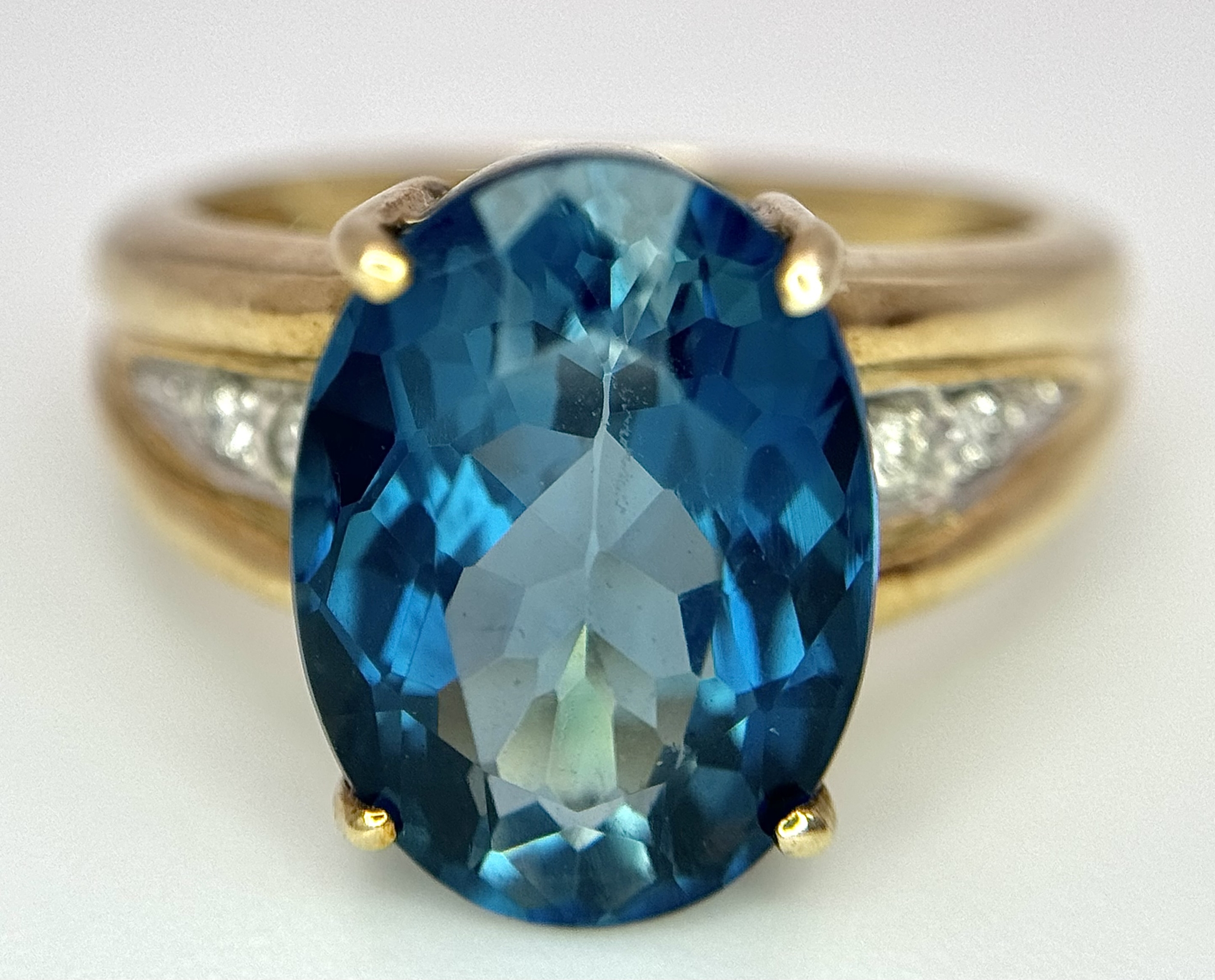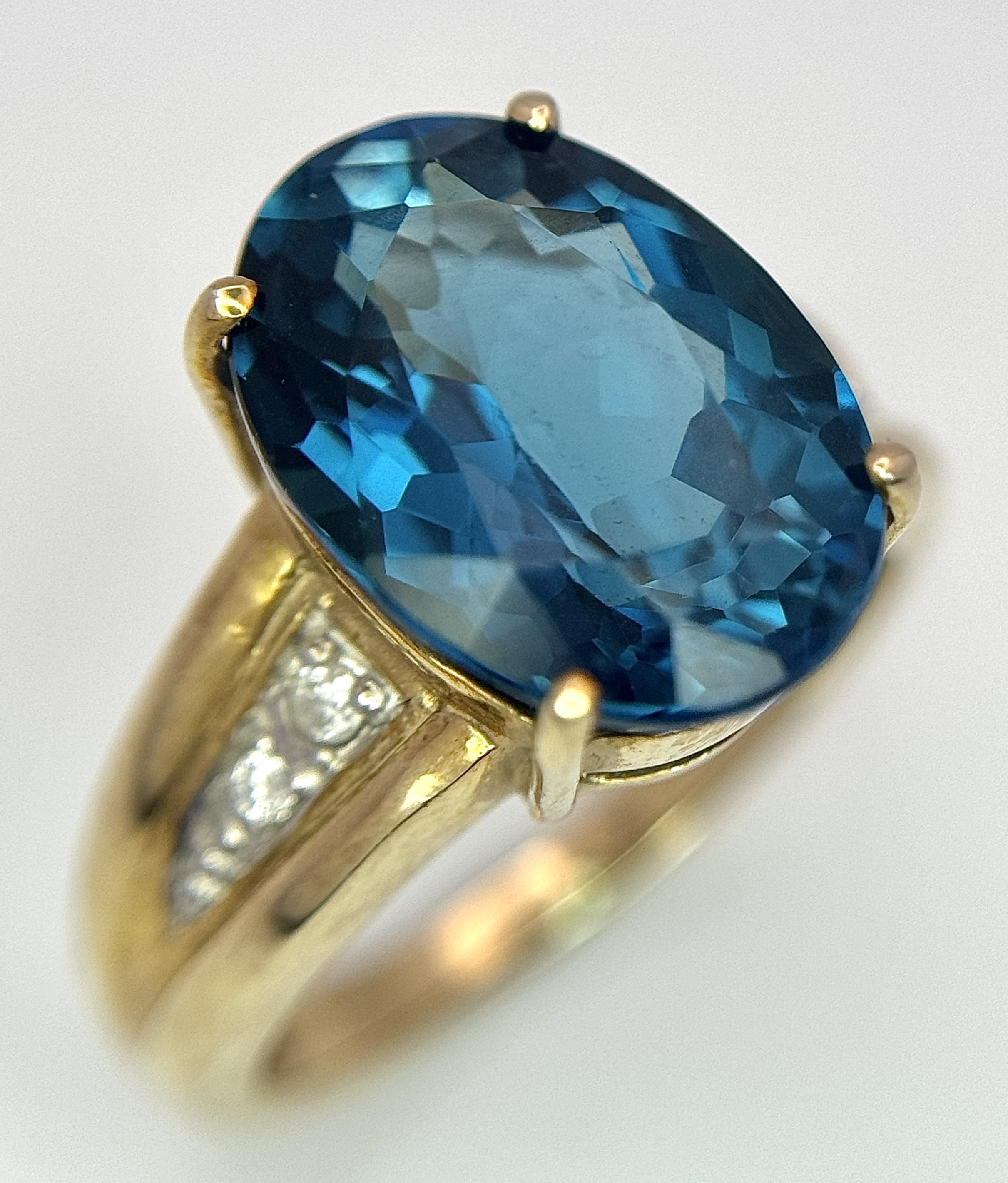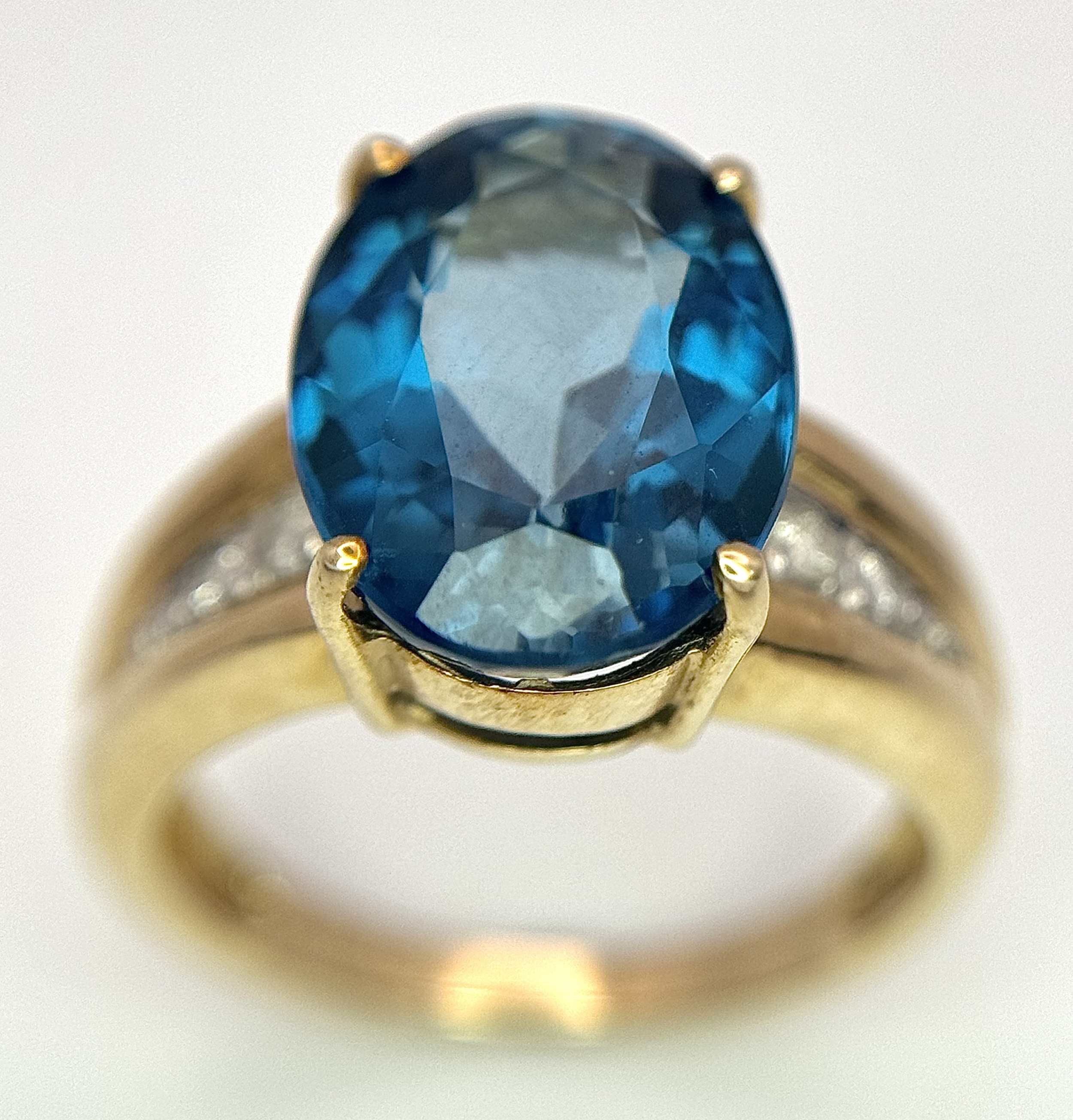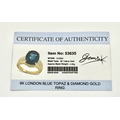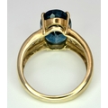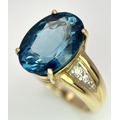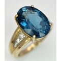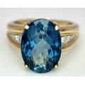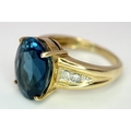 A 9K Yellow Gold, London Blue Topaz and Diamond Ring. A 5.979ct, oval cut topaz with 0.056ct of Diamond Accents. Size N. 5.65g total weight. NL- 0000. Comes with a certificate of authenticity.